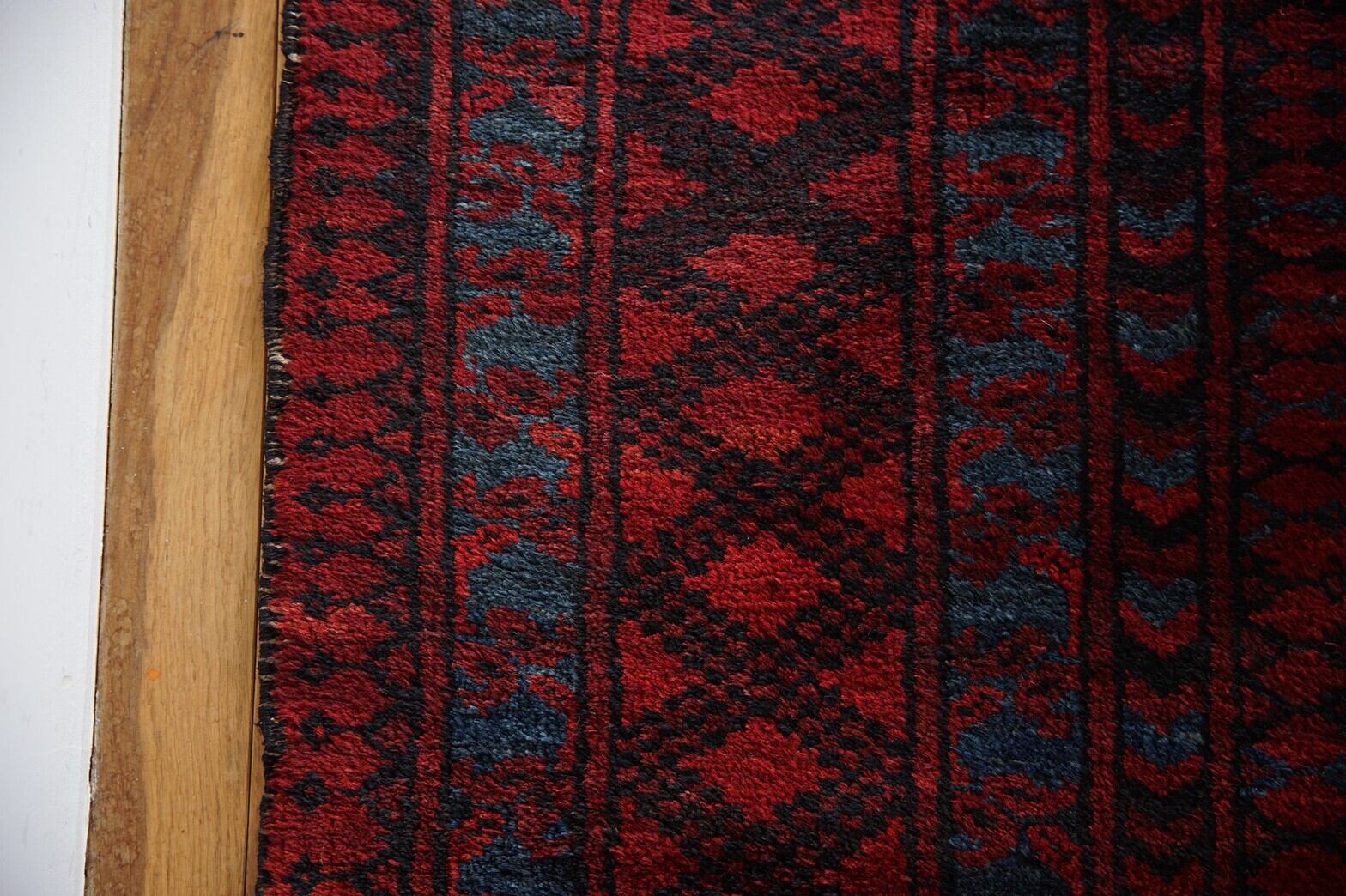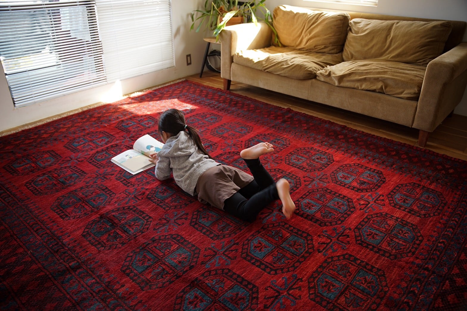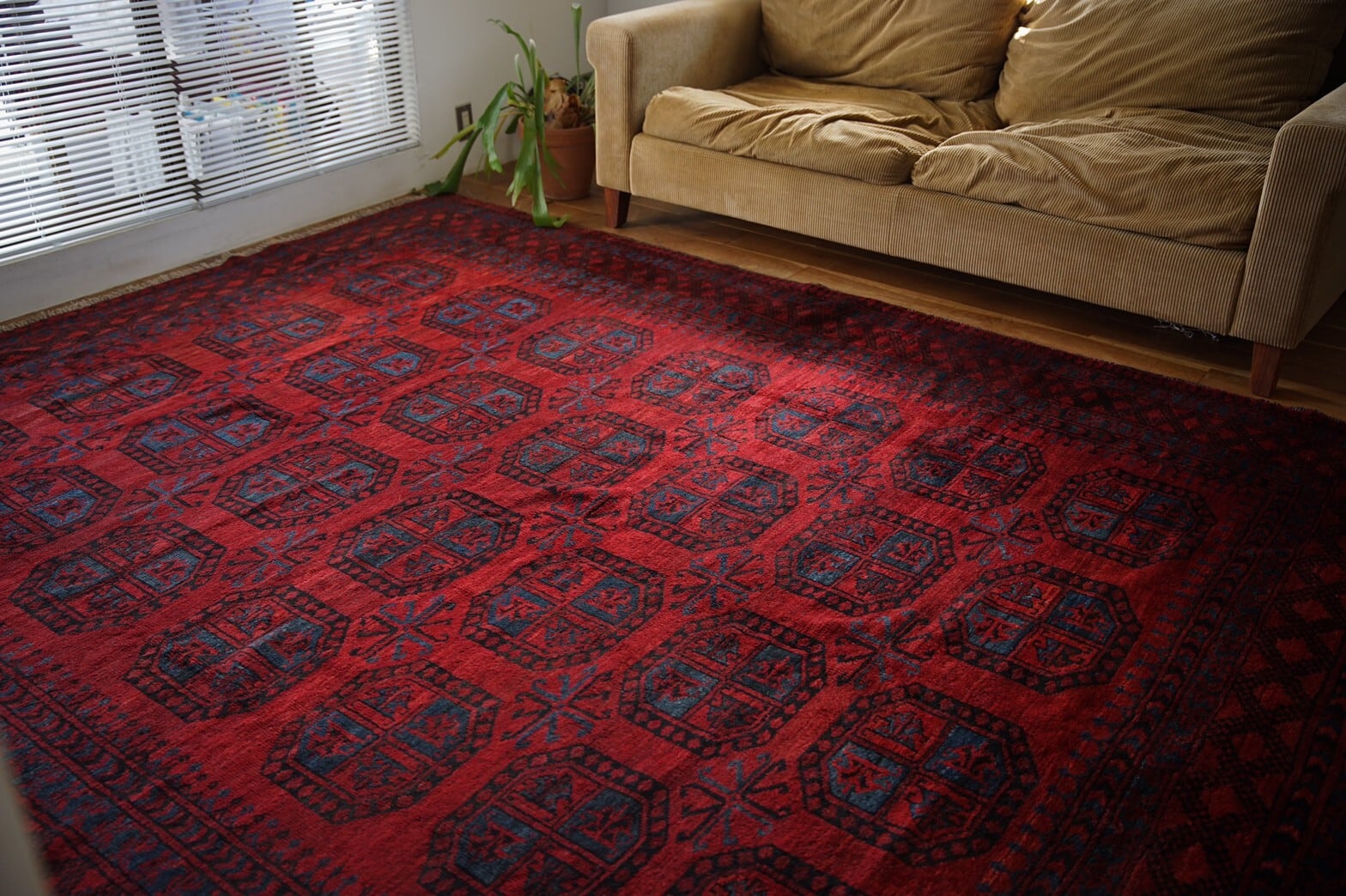 深みのある赤にインディゴブルーがアクセントとなっているトルクメンラグ。フィールドにはフィルパイラグと呼ばれる大きいギュルが描かれています。パイルは厚みがあり、しっかりとした織りの丈夫な作り。素足で踏み込んでも、ゴロンと寝転がってもフカフカでとても気持ちいいです。ダメージや補修跡は特になし。パイルもしっかりと残っています。大きいサイズのラグをリビングの主役にしてリラックススペースに♪広いお部屋に敷く場合は、ラグを置くことによって仕切りとしての役割ができ、空間にメリハリができますよ!ご自宅だけでなくショップや音楽スタジオ、写真スタジオなどでご使用もおすすめです。