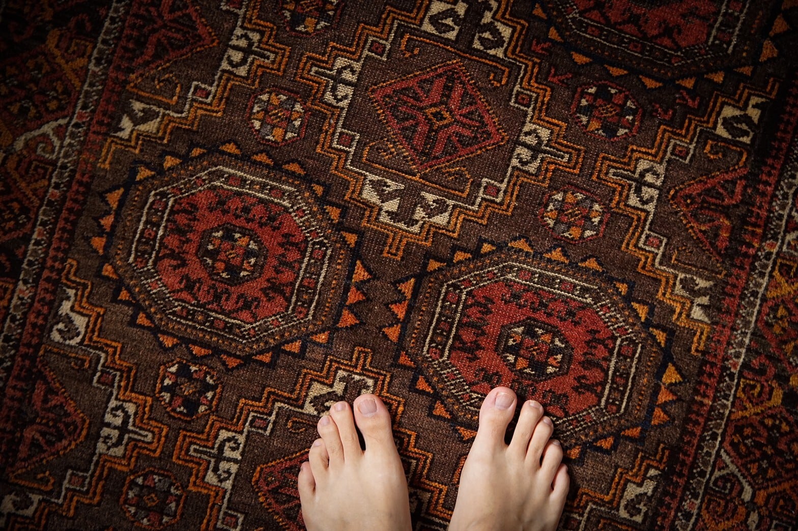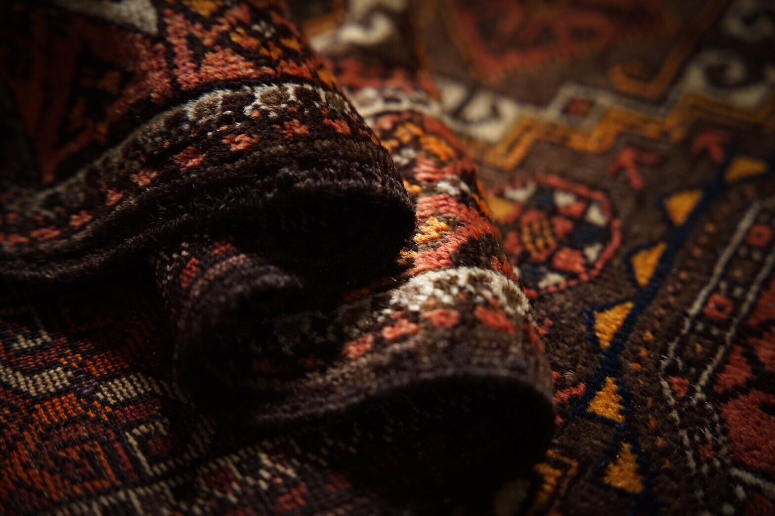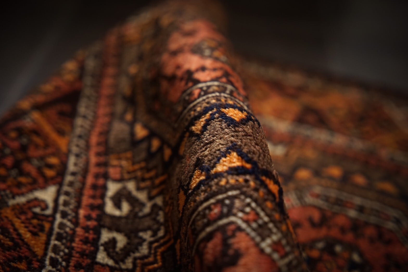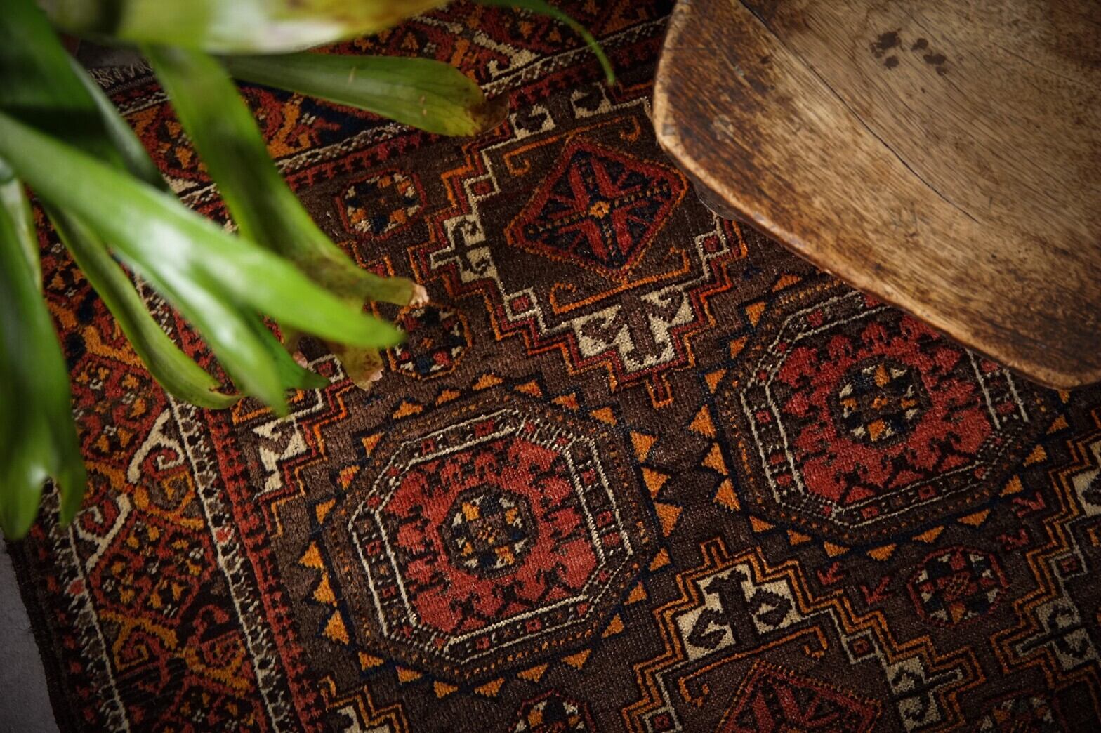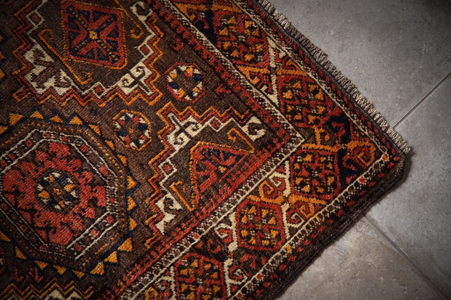 艶々と光輝く姿は神々しさすら感じる雰囲気のラグ。ブラウンやオレンジにイエロー、アイボリーを基調とした暖色系の色合いながらも全体的に男らしさを感じるかっこいいデザイン。フィールドにはデフォルメされたギュルや八角星がたくさん描かれています。パイルは少し短めで薄めの柔らかいタイプなので季節を問わず使用可能。お掃除もしやすいです。目立ったダメージはなくコンディションも良いです。リビングや書斎に敷いたり、ベッドサイド、姿見の前にオススメの使いやすいサイズです。