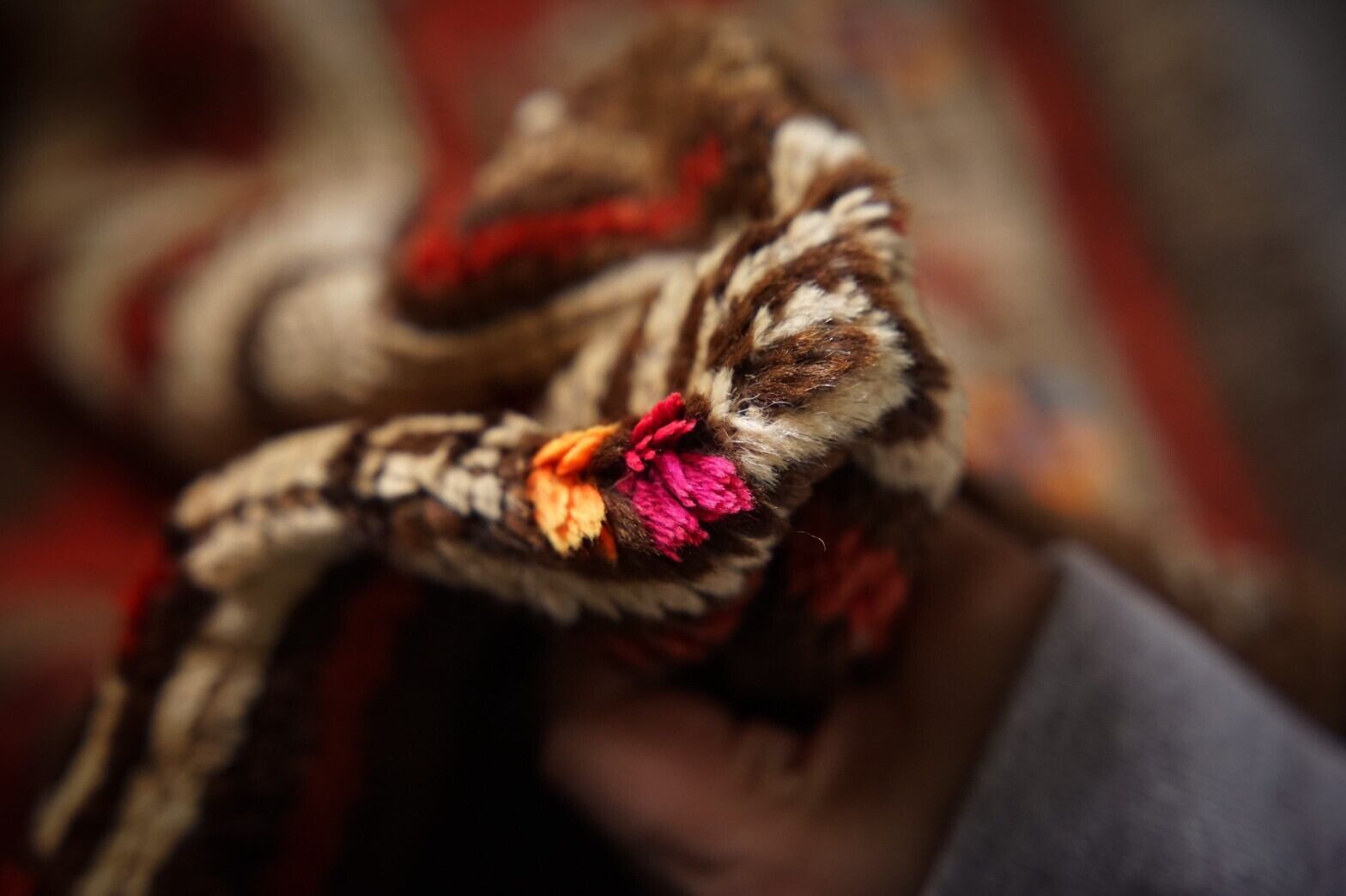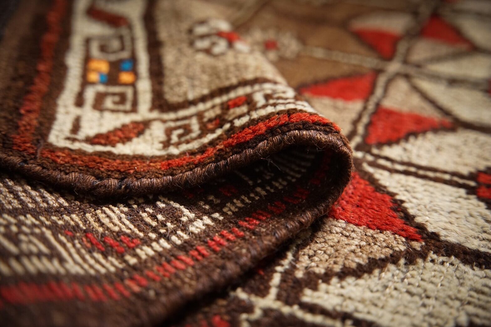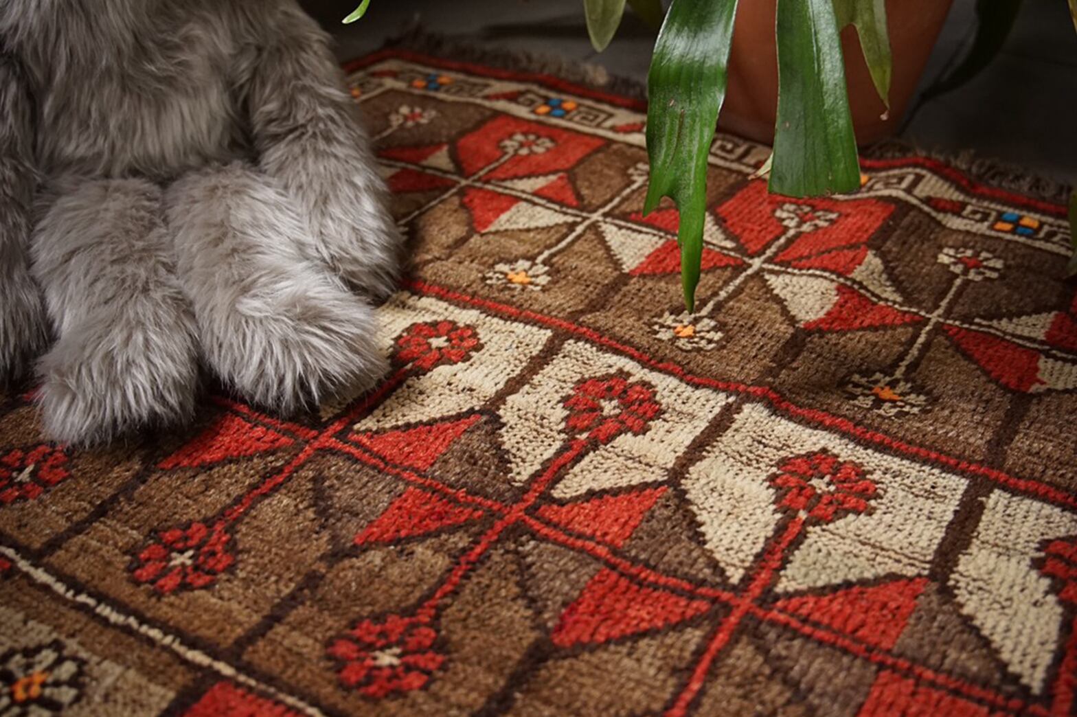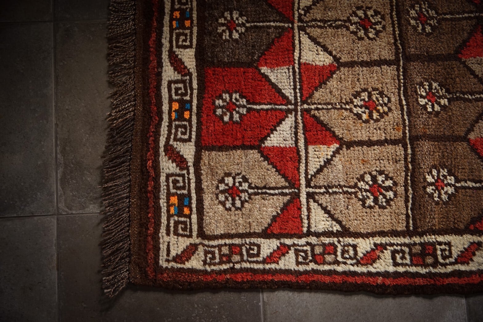 全体に描かれた花柄が珍しくとってもかわいいタイマニラグ。色合いもベージュ、アイボリー、ブラウンに赤が効いていてメリハリもあり見た瞬間に目を奪われるデザイン。ボーダー部分に何箇所か使われている派手なピンクやブルーも絶妙♪70年前とは思えないくらいパイルもしっかり残っており、ダメージも見当たりません。タイマニならではの柔らかな質感のウールでフカフカ。リビングやソファの前、ベッドサイド、植物のある窓辺やベランダの前に置いてみてはいかがでしょうか?