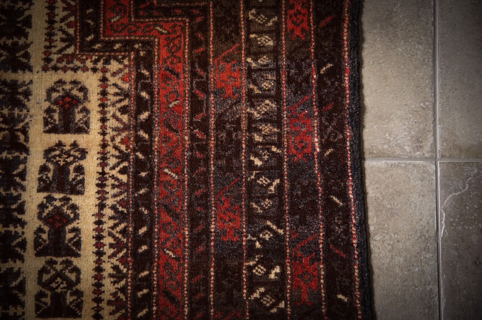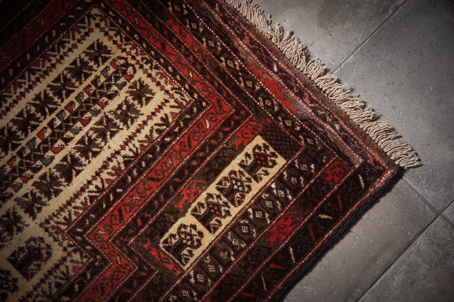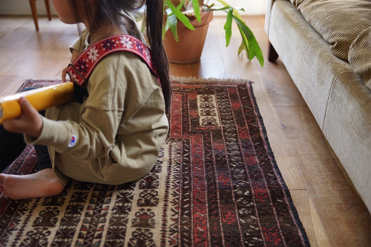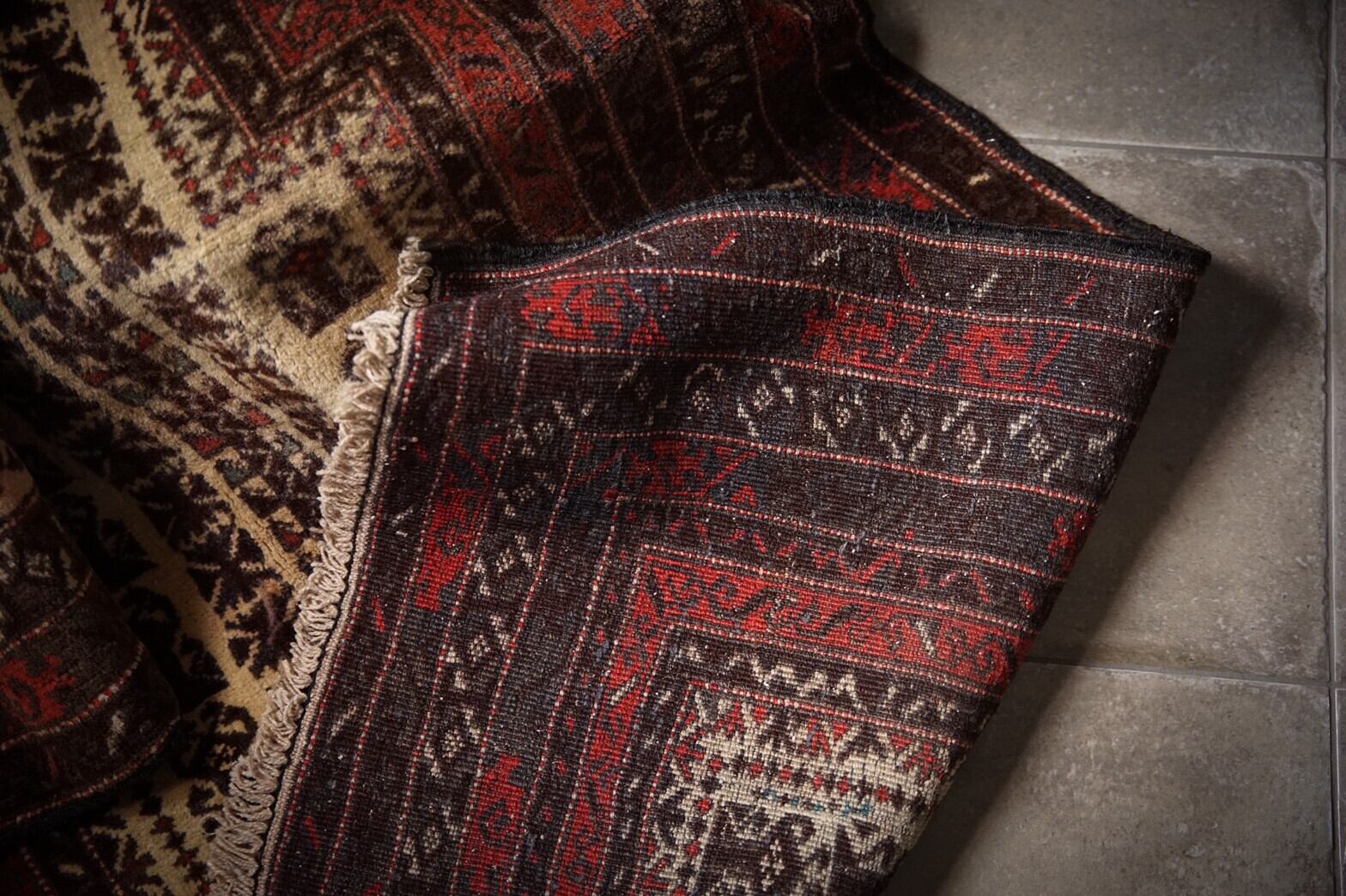 アフガニスタンのヘラート地方で作られたバルーチのプレイヤーラグ。ブラウン×アイボリー×レッドを基調とした温かみのある色合いは北欧家具やアンティーク家具との相性もバッチリ。艶もとても美しくコンディションも良いです。少し厚みがありフカフカの踏み心地ですが、パイルが長すぎずお掃除もしやすいですよ♪リビングやソファの前、ベッドサイド、植物のある窓辺やベランダの前に置いてみてはいかがでしょうか?