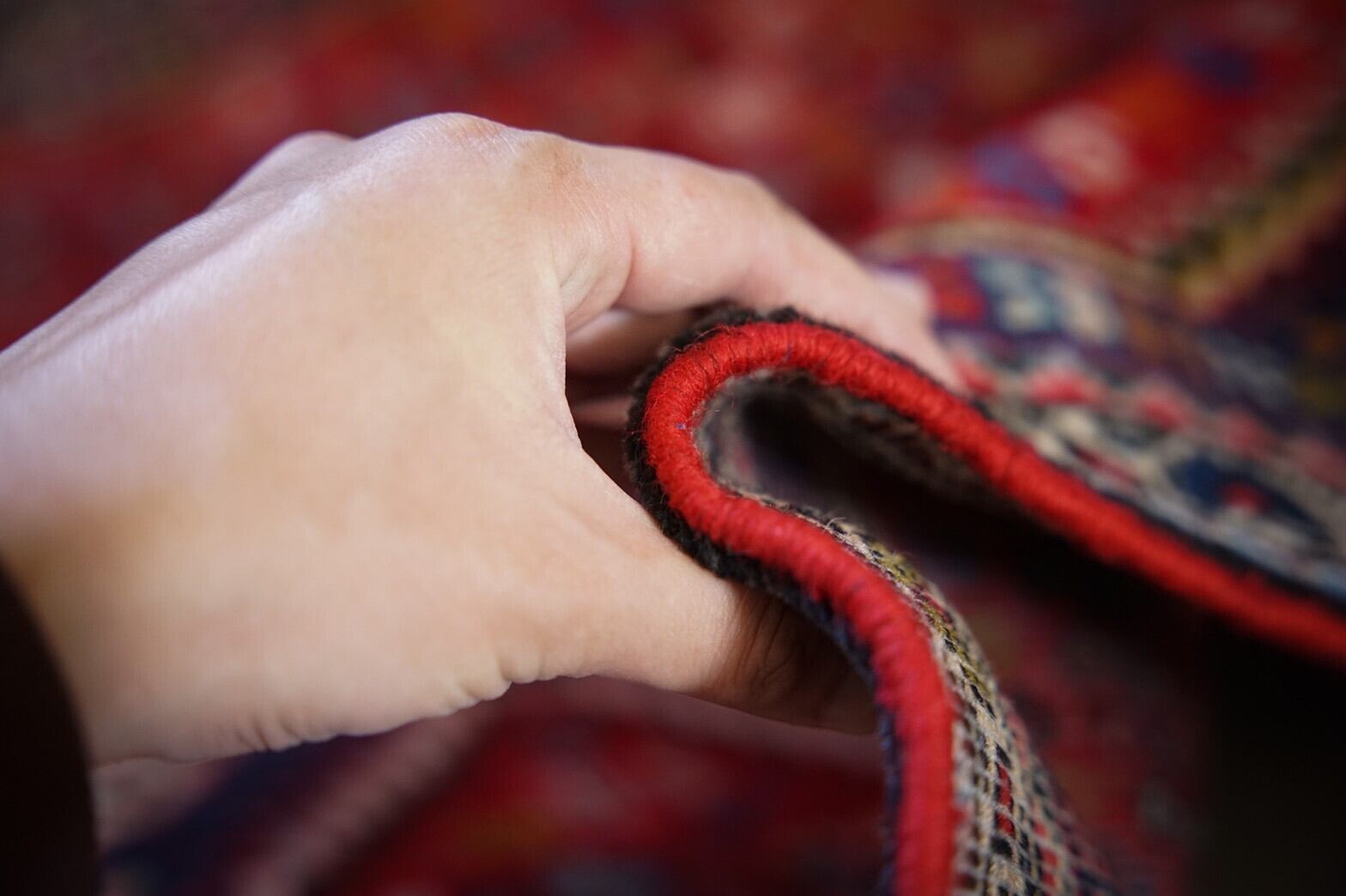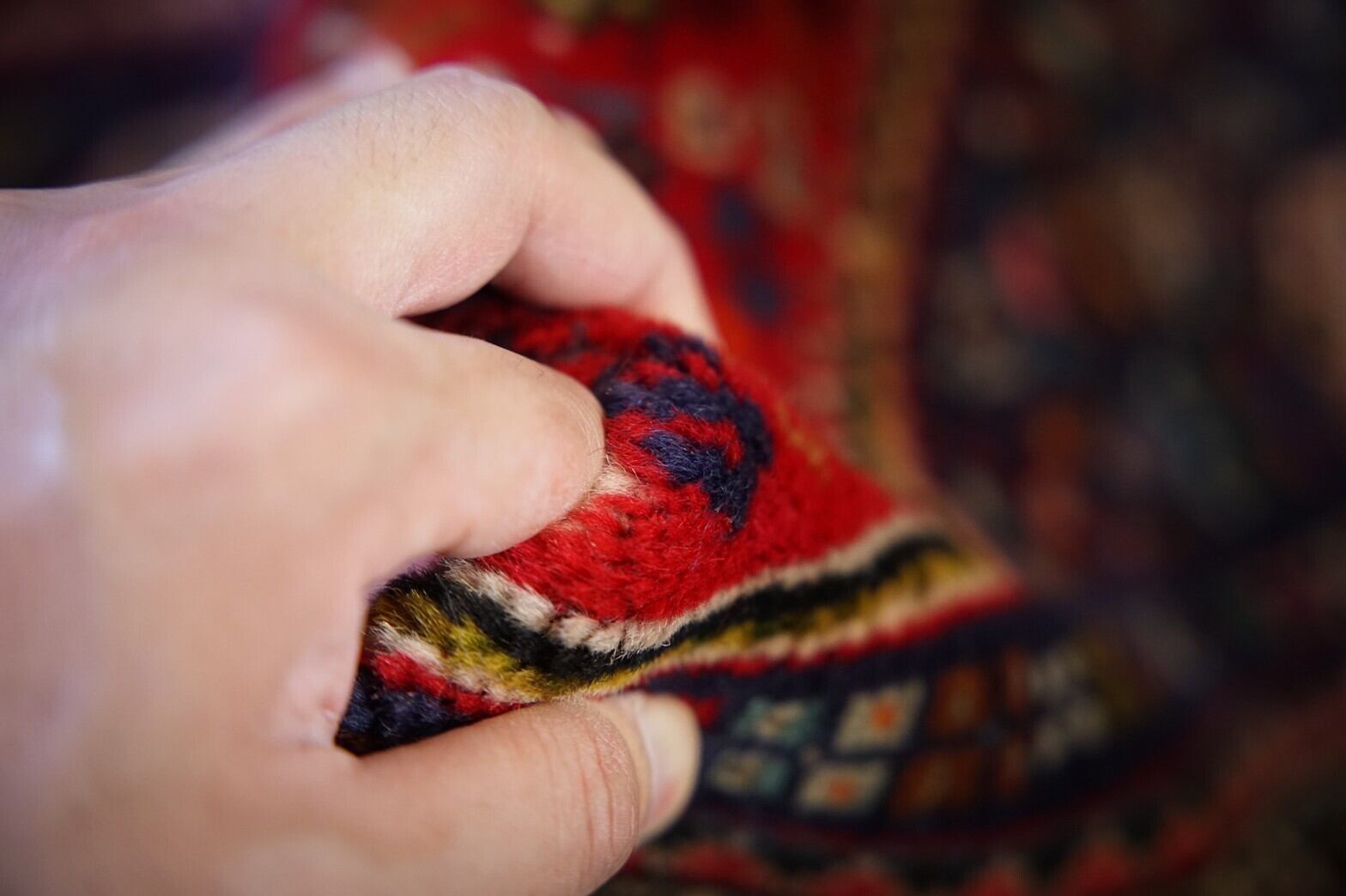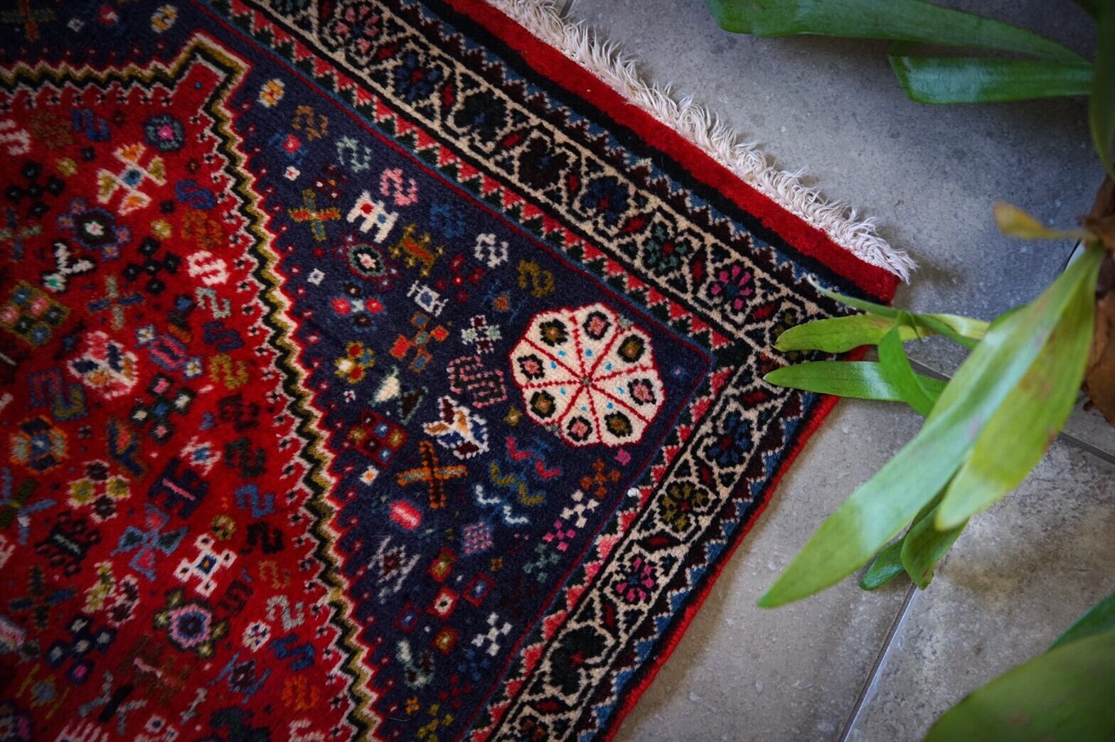 細長い形のカシュガイランナーラグ。ポップな色使いでカシュガイラグの魅力をギュッと詰め込んだかわいらしい雰囲気。ベースは赤でメダリオンはネイビーとアイボリー。フィールドにはカラフルで細かいモチーフがたくさん並びます。ピンクや水色、オレンジ、グリーンがアクセントになっていていて見るだけで元気になれますね♪パイルはしっかりと織り込まれ、長くはないですが素足で乗ると厚みと滑らかさがありとても気持ちいいです。ダメージや補修跡はなくコンディションはかなり良いのでランナーラグをお探しの方にはかなりおすすめです!植物との相性もバッチリ!キッチンや窓辺、玄関、廊下に敷いたりするのにぴったりなサイズ感。細長い形を生かして他のラグと重ね敷きするのも良さそうです♪