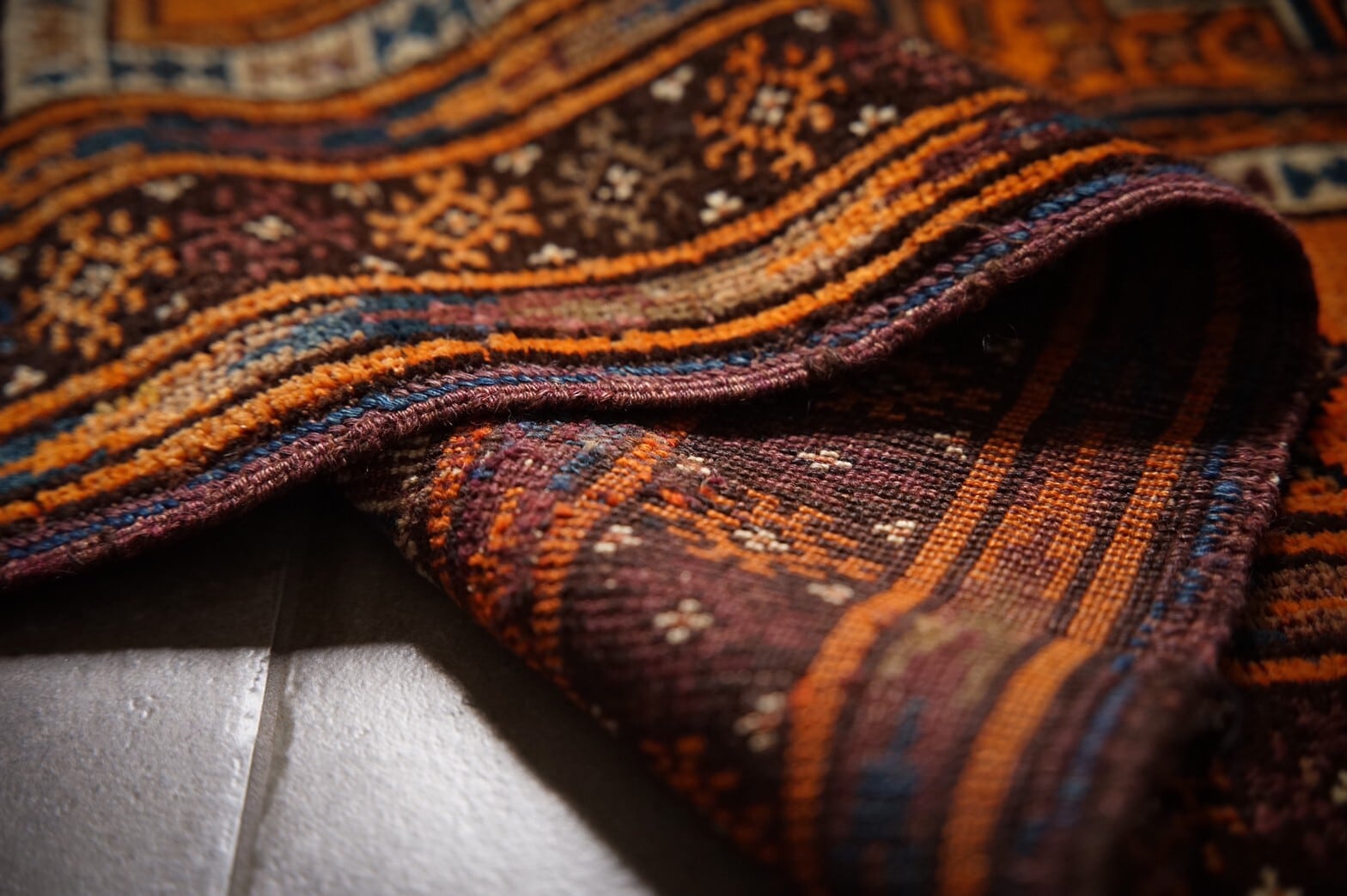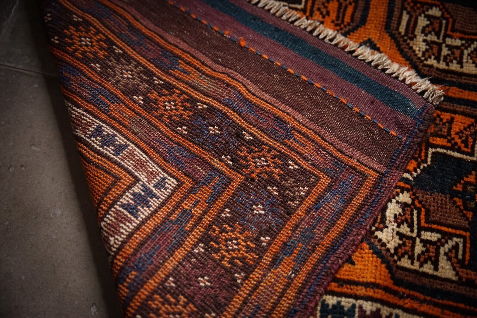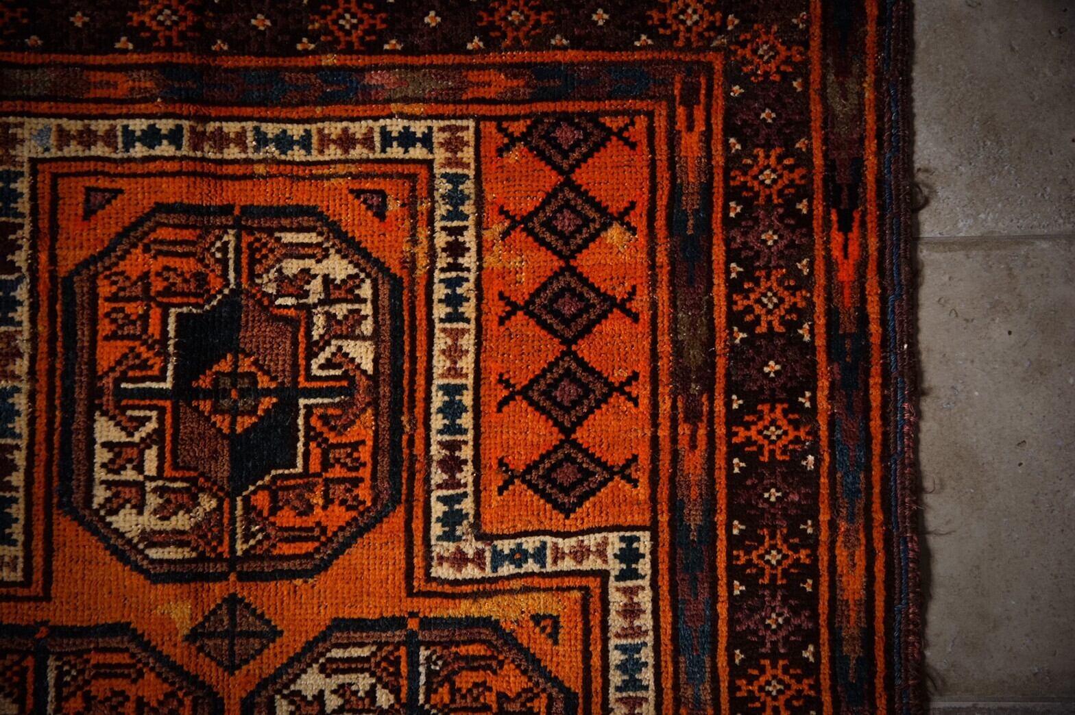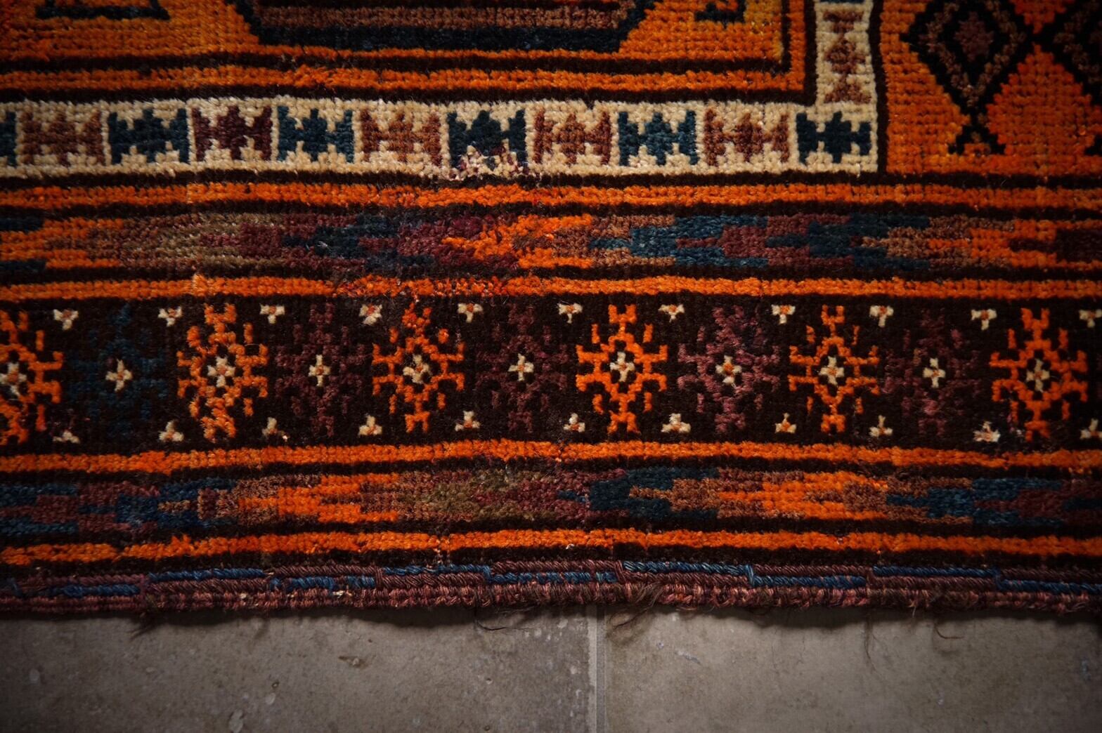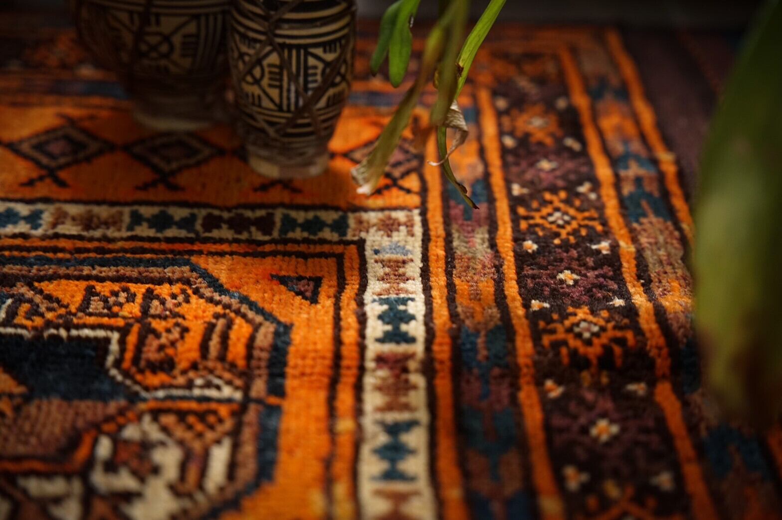 元気をもらえるビタミンカラーのオレンジがかっこいいバルーチのプレイヤーラグ。フィールドにはギュルが描かれているあまり見ない珍しいデザイン。ボーダー部分には魔除けのごぼうの花のモチーフがたくさん並んでいます。フリンジ部分のキリムエンドに青が効いていてかっこいいです‼︎パイルはしっかりと残っており、触り心地もフカフカすべすべときもちいです。多少の補修跡が見られますが、気にならないくらいとてもキレイに補修してあります。玄関マットサイズなので日本の住宅事情的には家のあらゆるシーン(キッチン、鏡の前、窓辺、玄関、ペットのお気に入りの場所として)で使い勝手の良いラグです。
