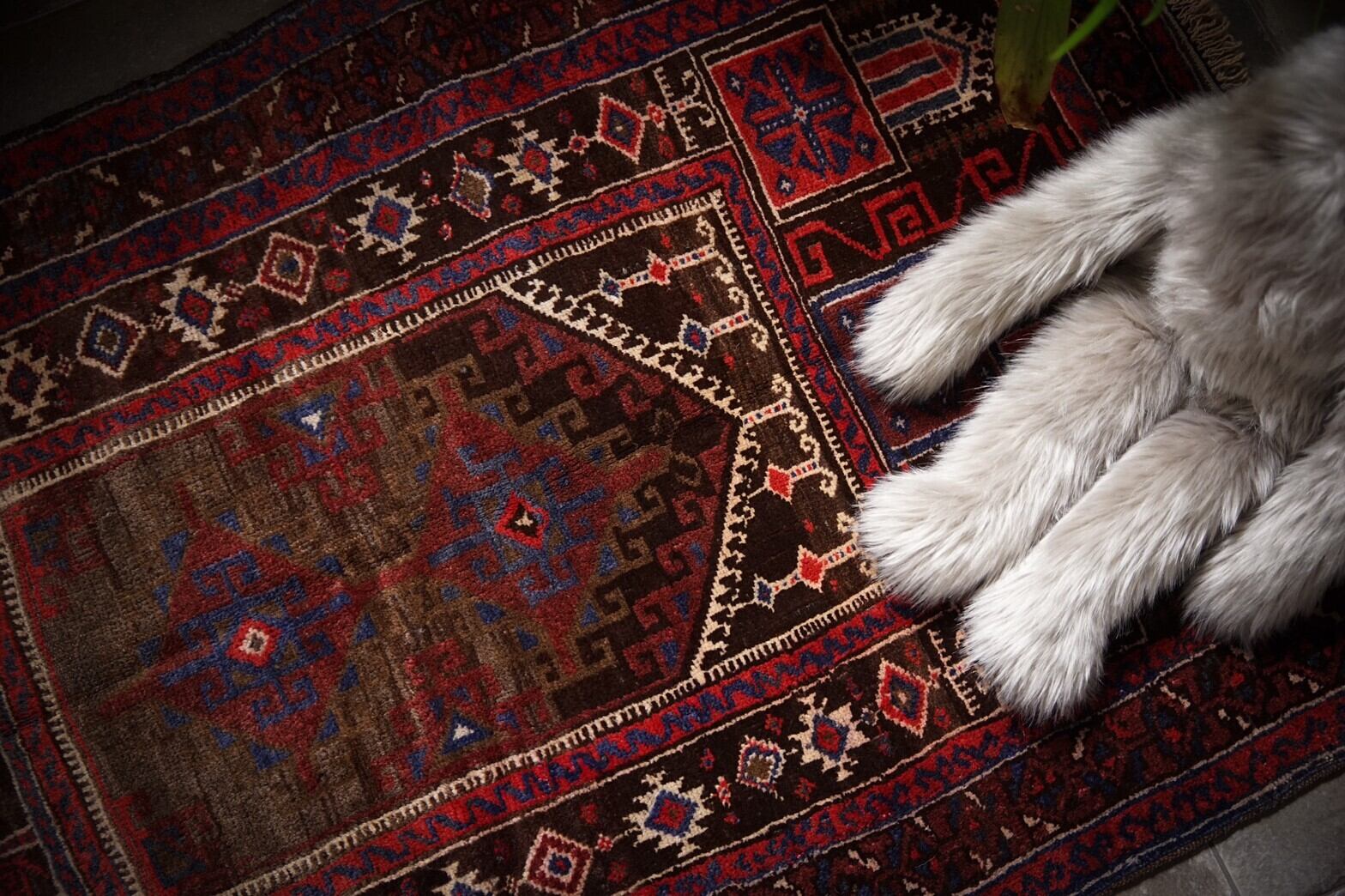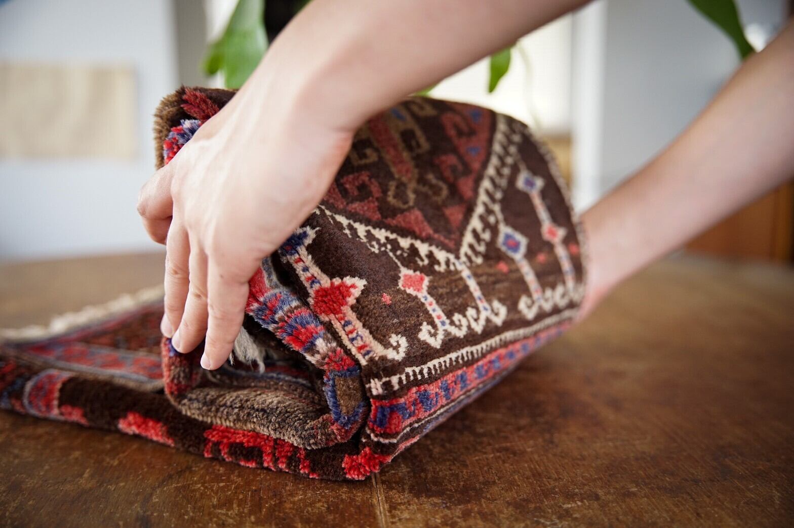 細かい部分まで凝ったデザインが施されているとても魅力的なマルダリのプレイヤーラグ。オリーブを基調としており全体的には落ち着いたトーンですが、アイボリーやブラウン、赤、青などをアクセントにしてボーダー部分までたくさんのモチーフが描かれています。艶もあり、触り心地も柔らかいウールを使用しておりとても気持ちいいです。 手織りラグならではの歪みは多少ございますが、他に目立ったダメージや補修跡も無くコンディションは良好です。玄関マットサイズなので日本の住宅事情的には家のあらゆるシーン(キッチン、鏡の前、窓辺、玄関、ペットのお気に入りの場所として)で使い勝手の良いラグです。