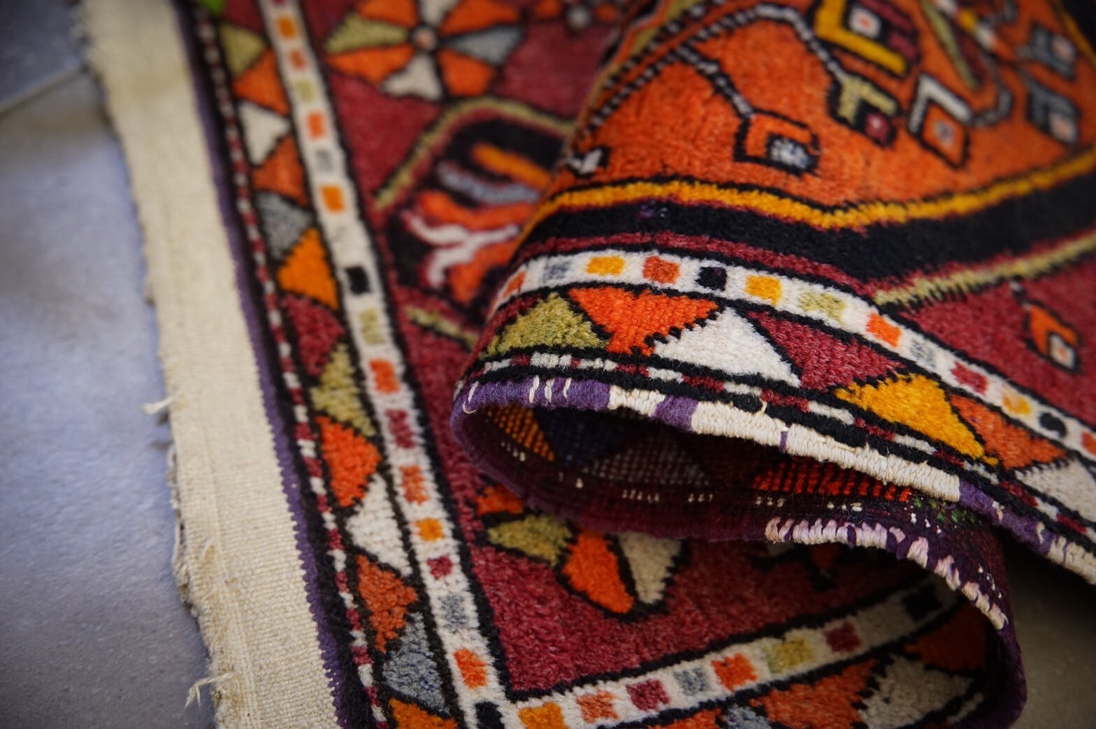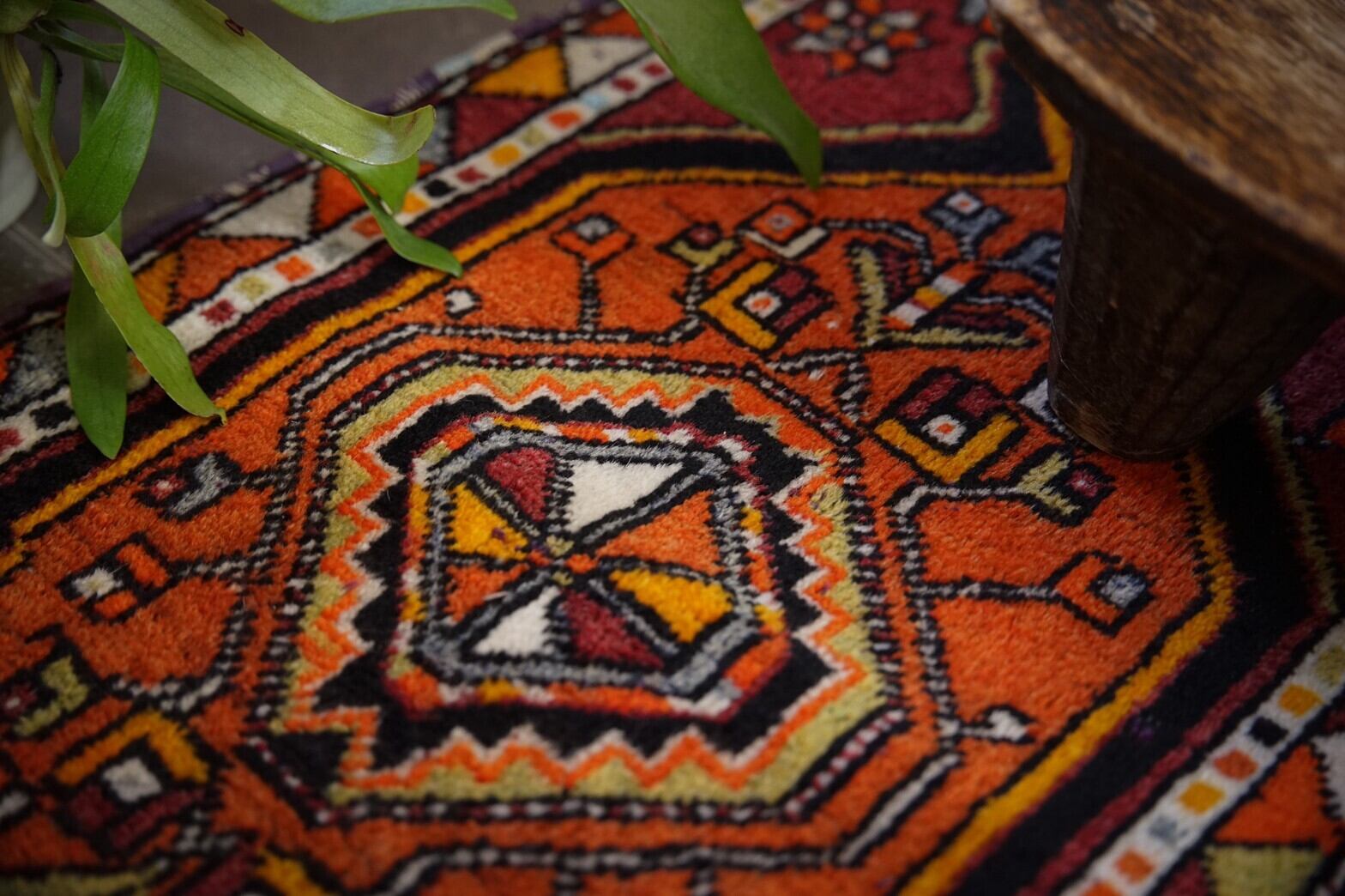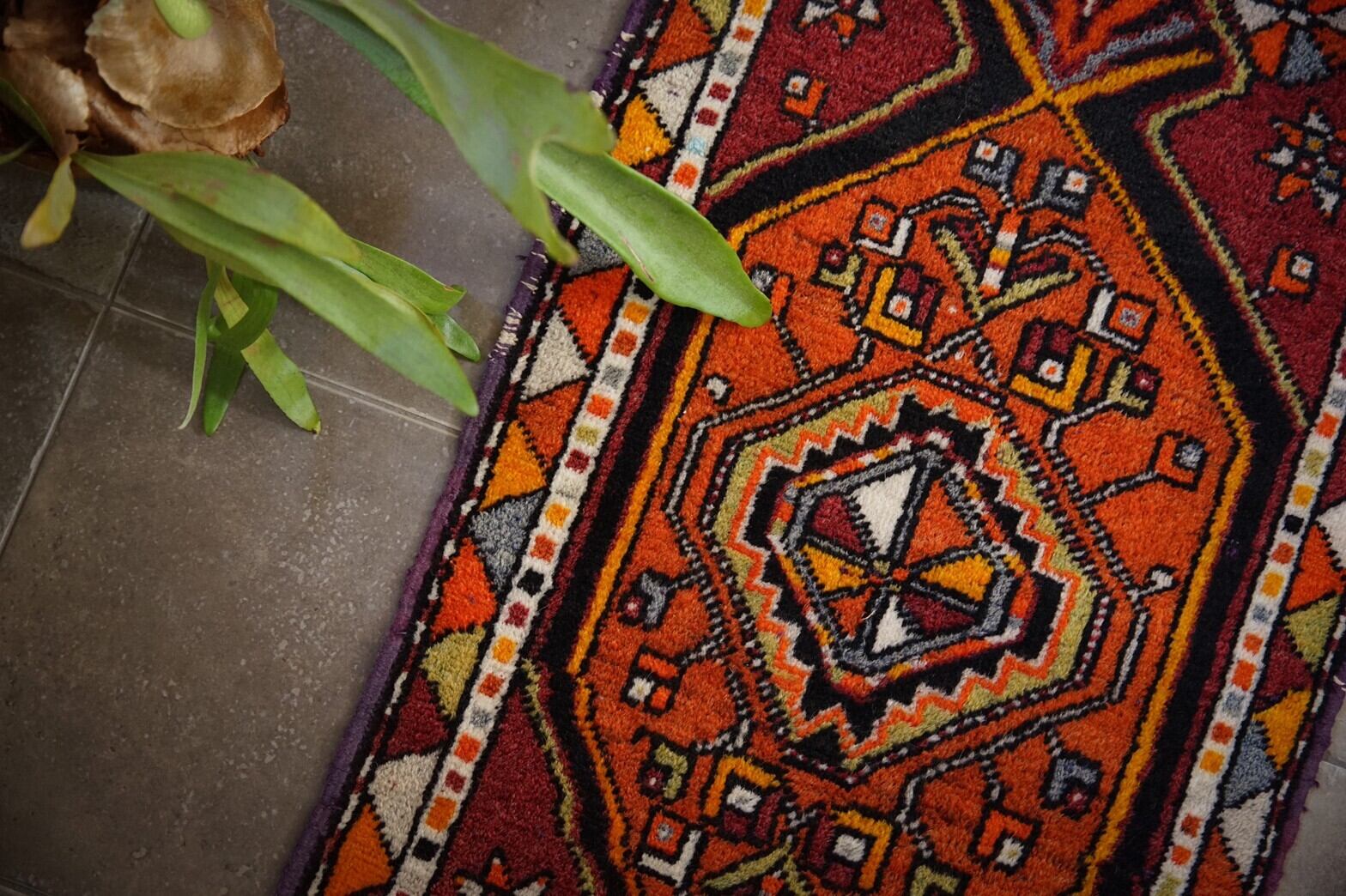 少し小さめの使いやすいサイズ感のカシュガイラグ。オレンジが効いていてカラフルな色合いがかわいくもあり、デザインはかっこいいバランスのいいラグです!ボーダー部分の配色にも織り手のセンスを感じますね!こちらのラグはフリンジがついていないのですが、意外と無い方が使いやすかったりするかもしれません。パイルはしっかり残っており、手触りもすべすべと気持ちいいです。厚みがあるので足元がひんやりしたくない場所(キッチン、洗面所、姿見の前など)に置くのがおすすめです。他のラグと組み合わせて敷いてもいいですね♪