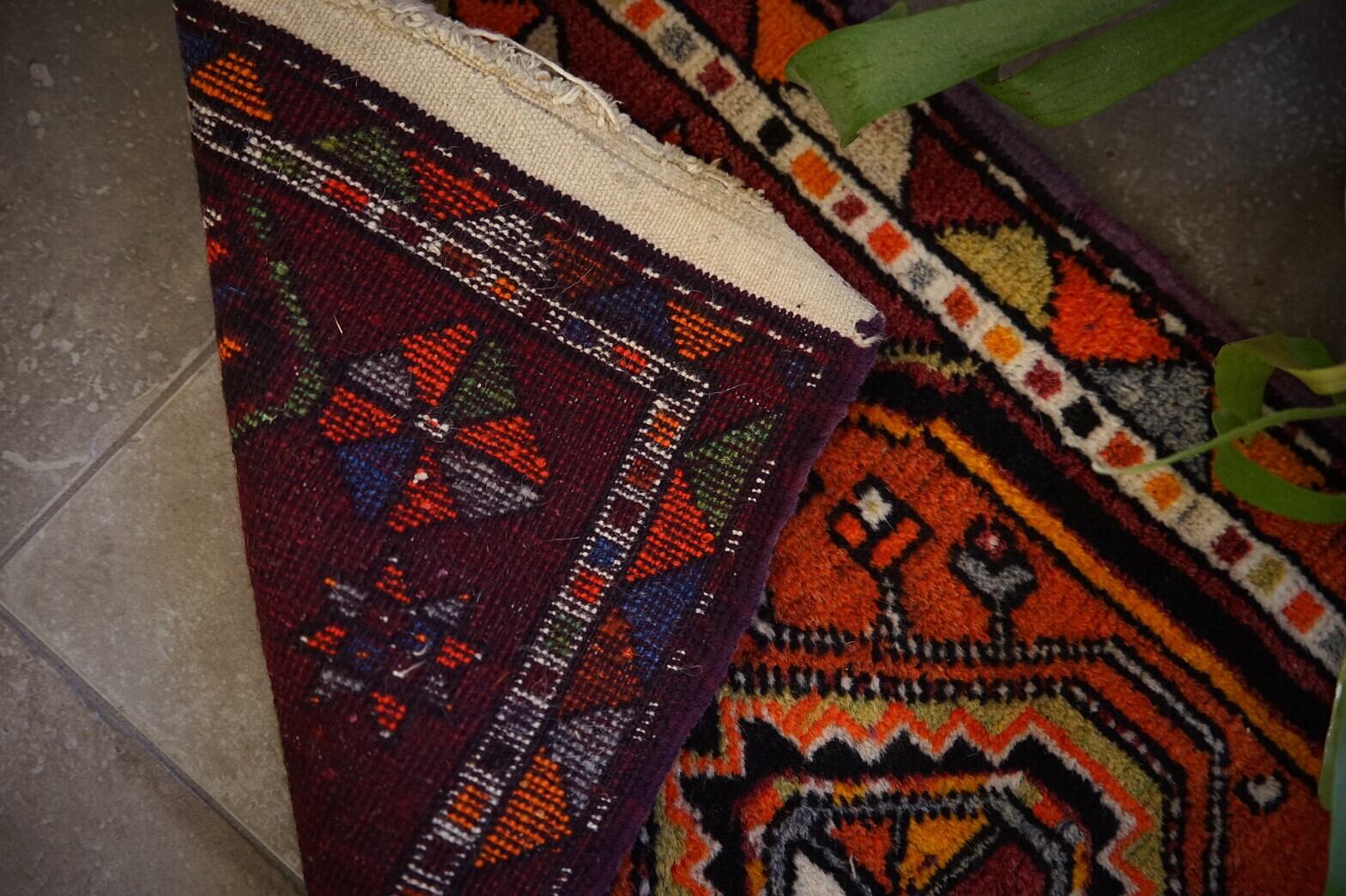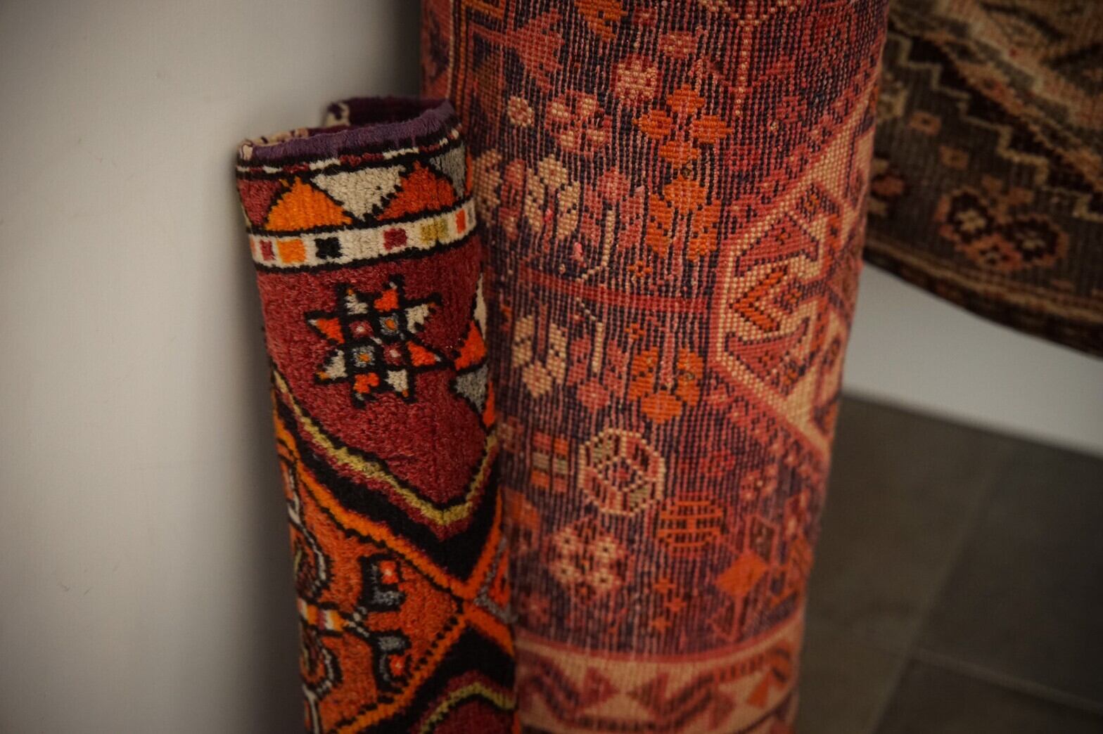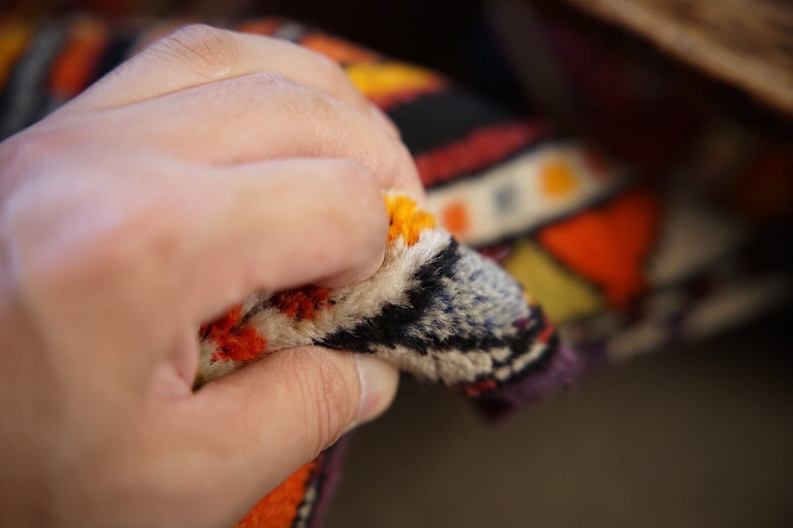 少し小さめの使いやすいサイズ感のカシュガイラグ。オレンジが効いていてカラフルな色合いがかわいくもあり、デザインはかっこいいバランスのいいラグです!ボーダー部分の配色にも織り手のセンスを感じますね!こちらのラグはフリンジがついていないのですが、意外と無い方が使いやすかったりするかもしれません。パイルはしっかり残っており、手触りもすべすべと気持ちいいです。厚みがあるので足元がひんやりしたくない場所(キッチン、洗面所、姿見の前など)に置くのがおすすめです。他のラグと組み合わせて敷いてもいいですね♪