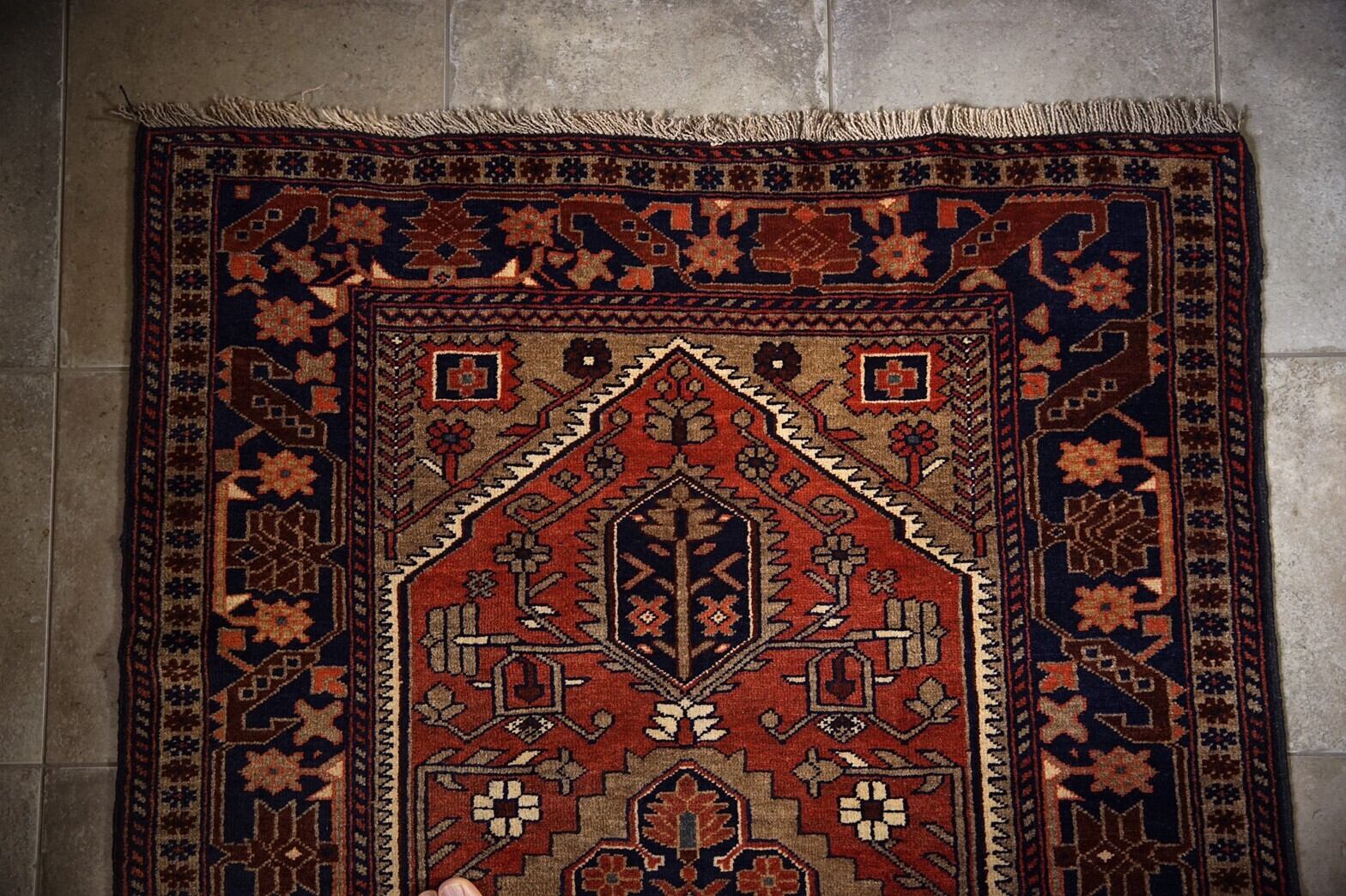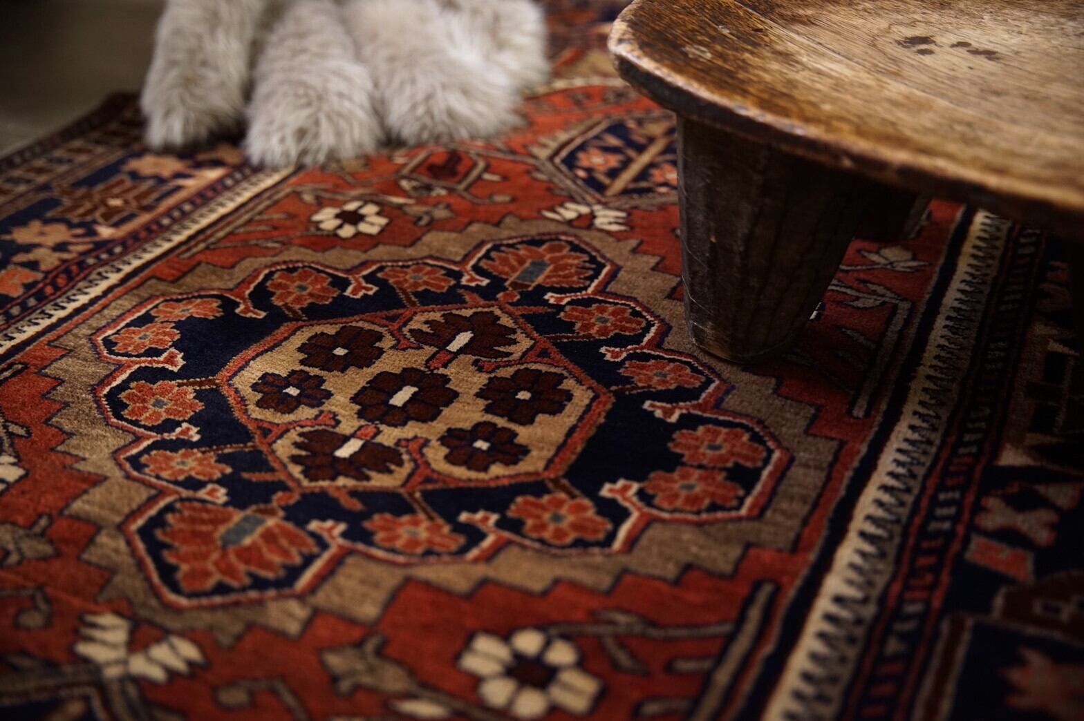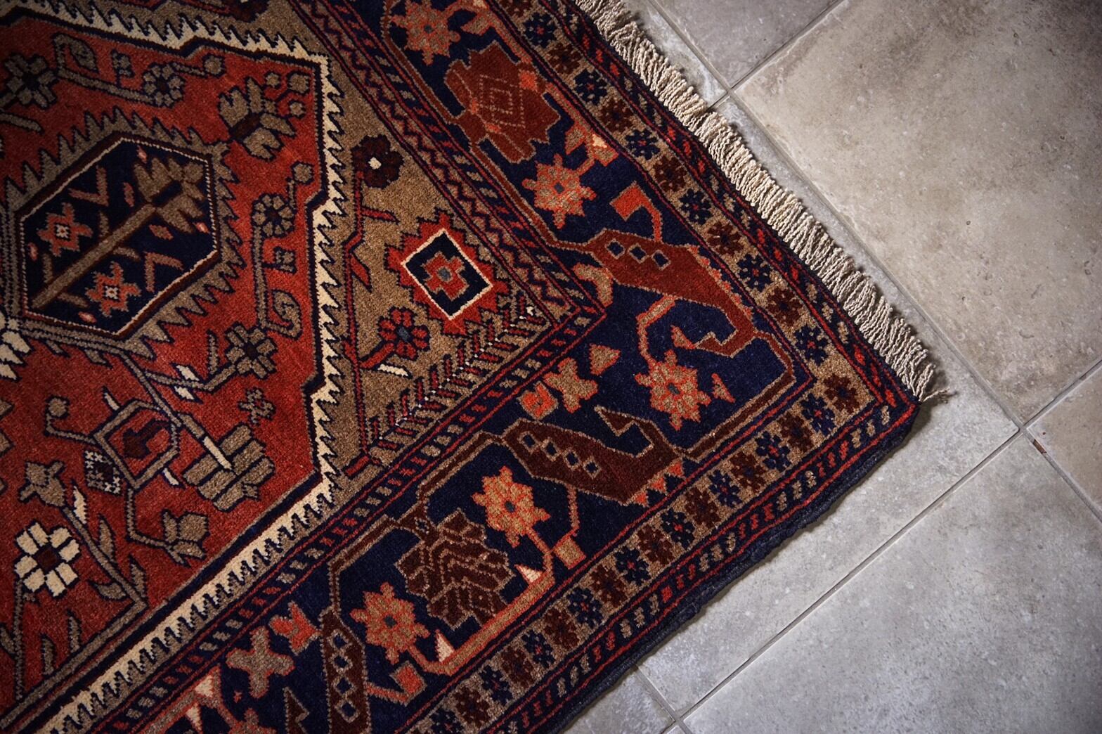 渋い色合いが魅力の60年前のバルーチラグ。テラコッタ、ブラウン、ベージュ、ネイビーを基調とした配色センスがとてもかっこいいです!!メインのモチーフは花。ラグ全体に大小様々なデザインの花が散りばめられています。かっこいいとかわいいが共存するラグ。織り手のセンスが光ります。ダメージや補修跡はなくコンディションはかなり良好。パイルもきれいに残っており、素足でのるとすべすべとして気持ち良いです。リビングや書斎に敷いたり、ベッドサイド、姿見の前にオススメの使いやすいサイズです。