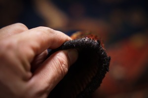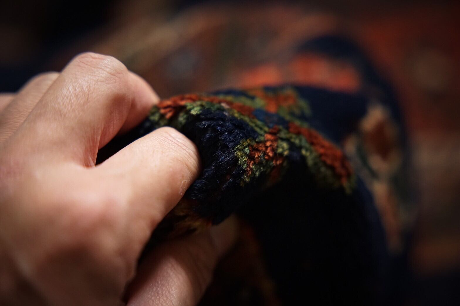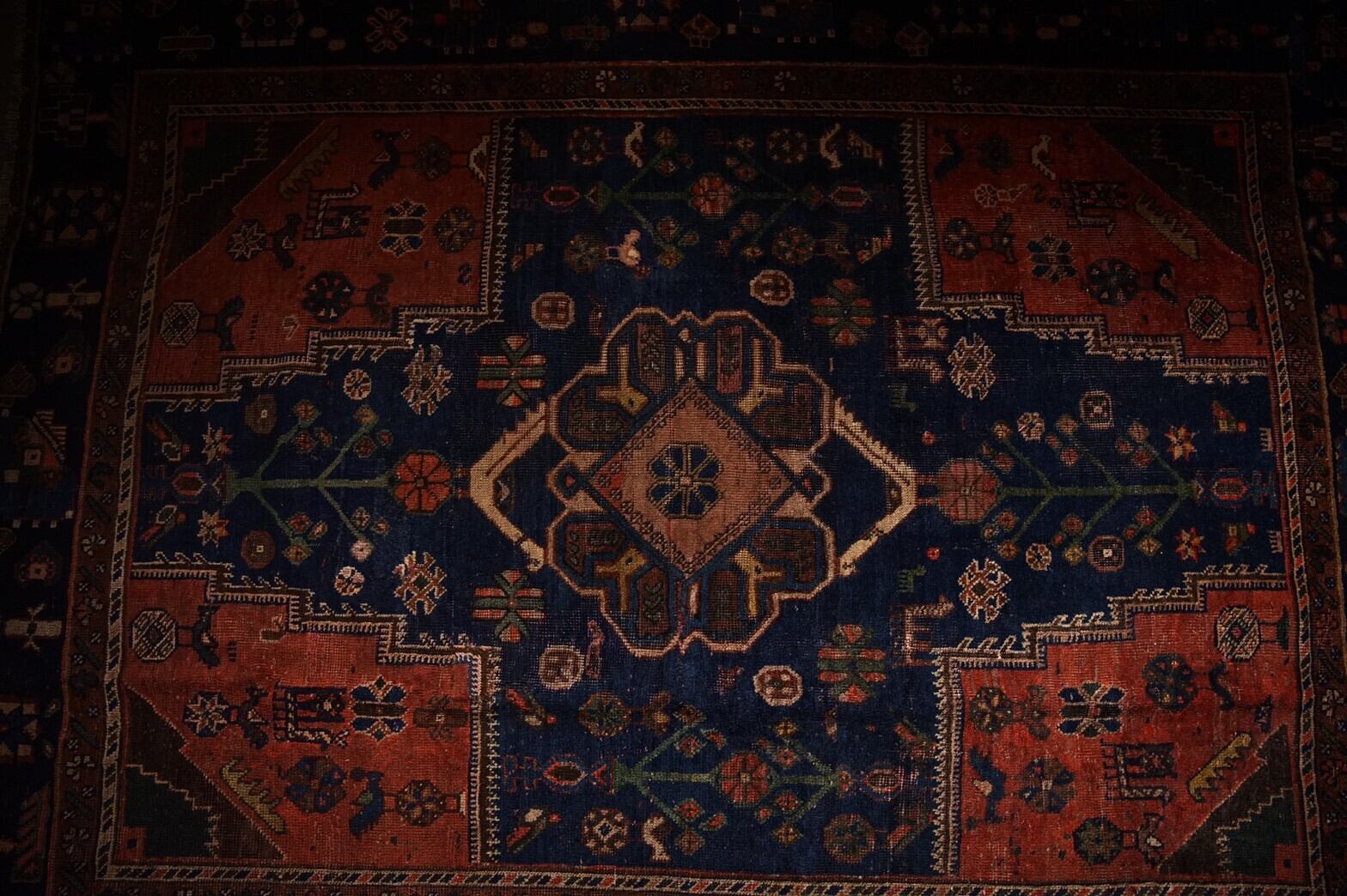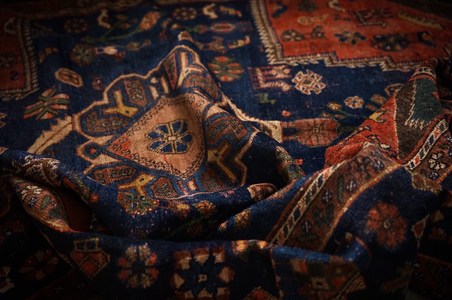 120年前に作られたトライバルラグ。濃紺と朱色がベースでパッと見インパクトはありますが、日本人の私には馴染みのある古風な色合いに感じ不思議ととても落ち着きます。濃い色合いの床材のフローリングや日本の民藝家具、和室に敷いたらとてもハマりそうです。ラグ全体に描かれているのは自然賛美を現す大小様々な花、生命の樹、そしてかわいらしい鳥たちがカラフルに描かれ華やかさを引き立てます。120年前のラグのため全体的にパイルは低くなっているのと、補修跡がございますがとてもキレイにリペアしており気になりません。リペアしながら大切に受け継がれてきた歴史をご理解いただける方にぜひ今後も大切にこのラグを使って頂きたいです。触り心地は経年変化でしなやかさがあり素足で乗ってもチクチクせず気持ちいいです。リビングやソファの前、ベッドサイドや書斎におすすめのサイズです。
