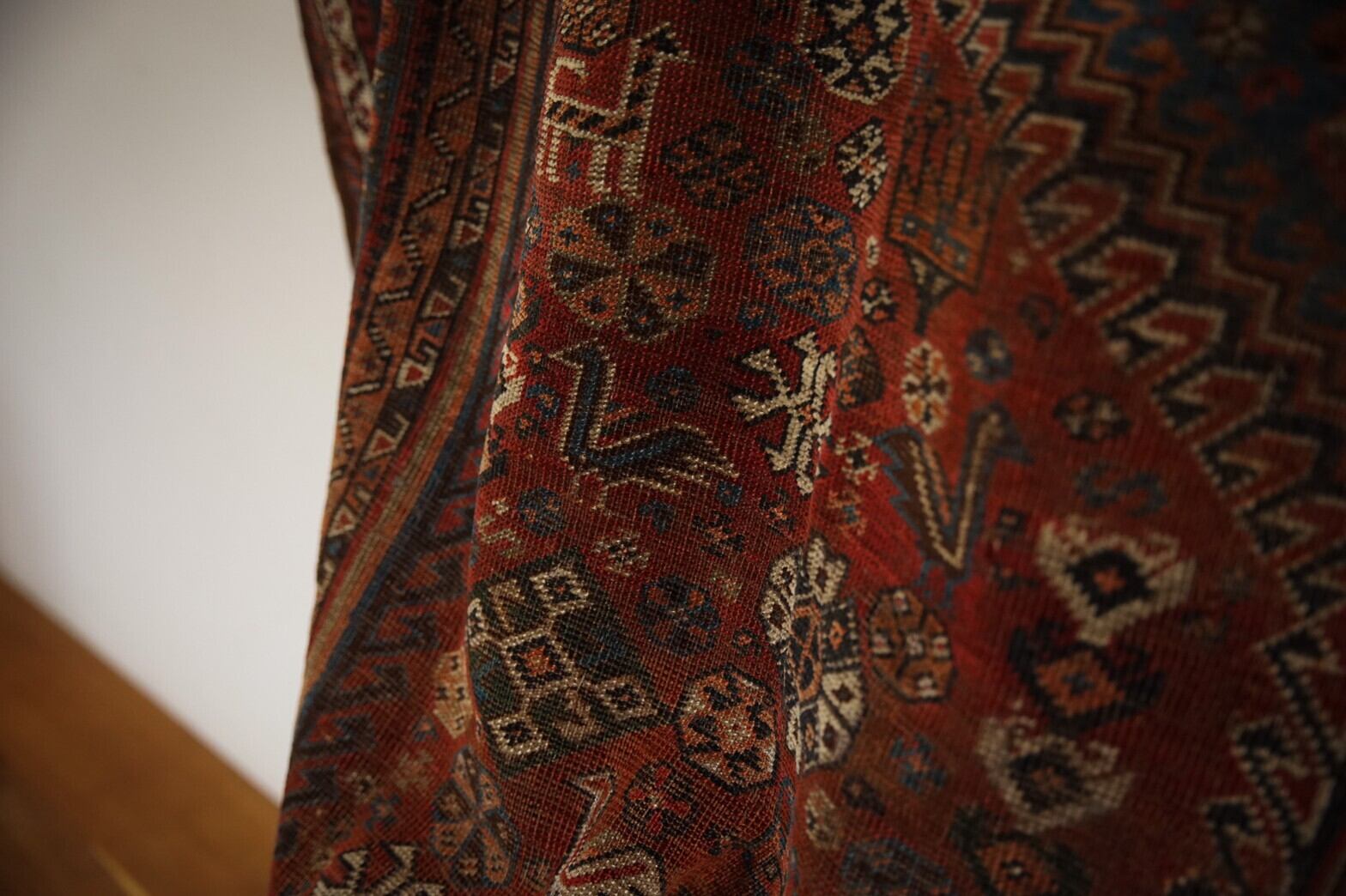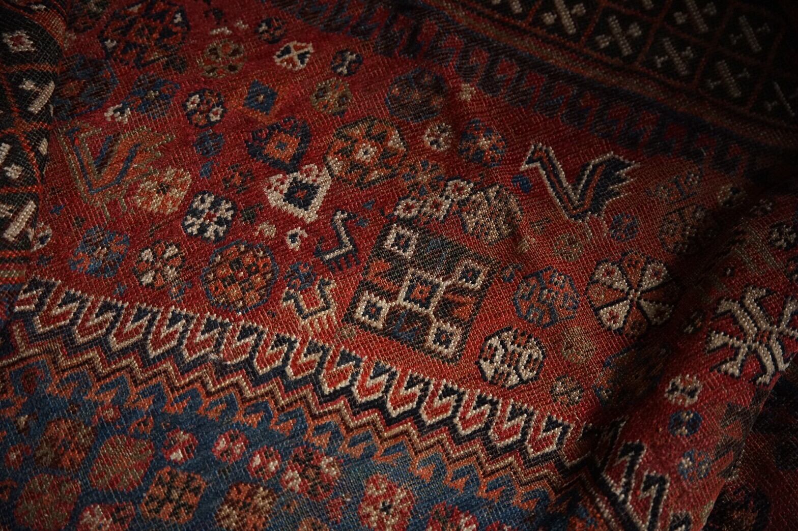 一目見ただけで圧倒的な存在感のハムセ連合のアンティークラグ。140年前と言われても私自身もあまり実感のない数字ですが、経年変化で擦れ、色褪せた歴史を感じさせる佇まいは見た人を虜にする魅力があります。どんな風に誰がこのラグを使ってはるばる日本にやってきたのか…想像するだけでロマンがありますよね。メダリオンの褪色した青がとても美しいです。フィールドにたくさん鳥がいて、貫禄のあるこのラグの雰囲気を和ませてくれます。アンティークラグのため全体的に擦れはありますが、大きなダメージや補修跡もなく場所によってはパイルが残っている箇所もあります。大判なのでお部屋の主役として、また重ね敷きをしたり…またアンティークラグコレクターの方にもおすすめの一枚です。きっと宝物になってくれることでしょう♪