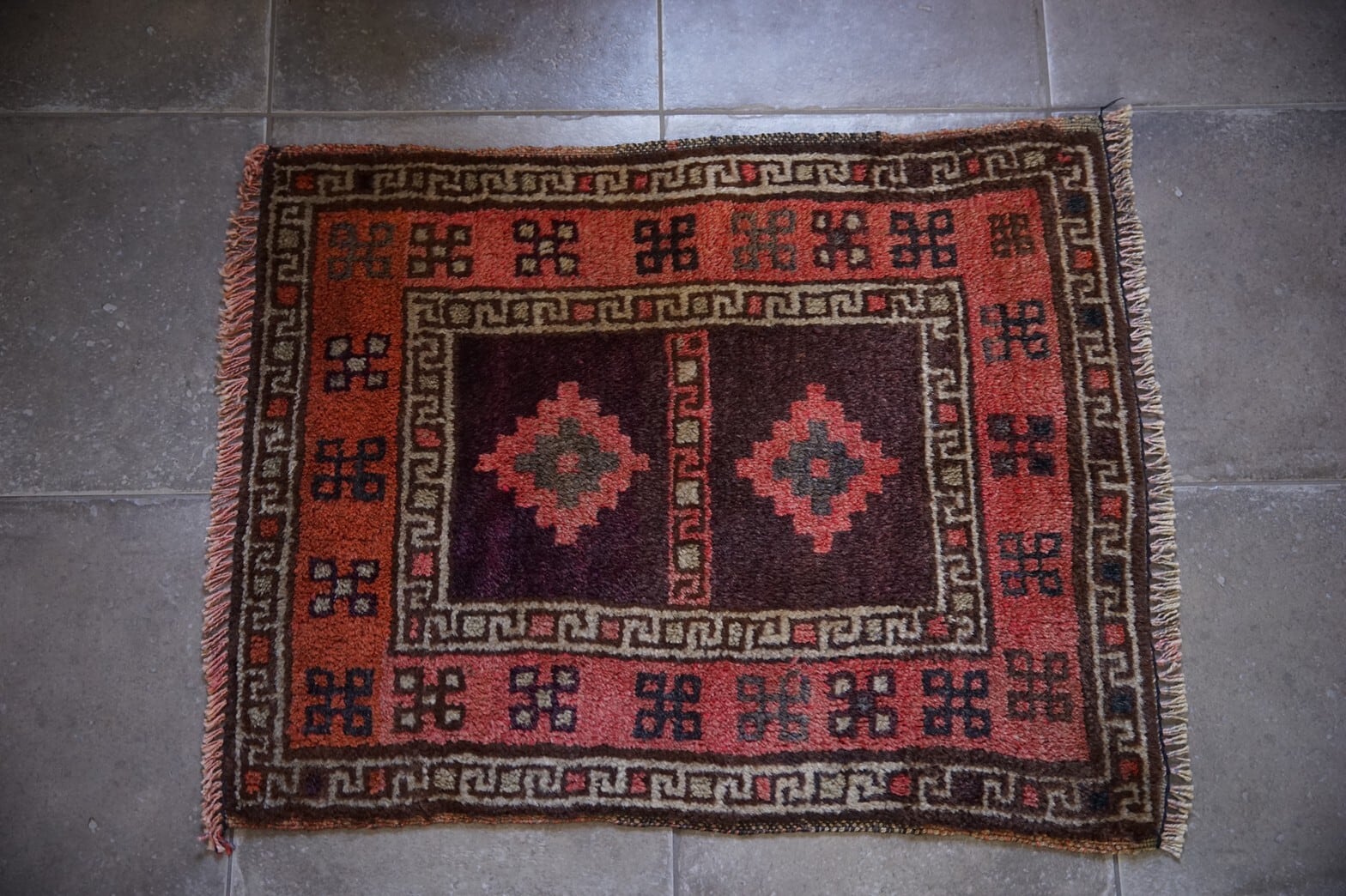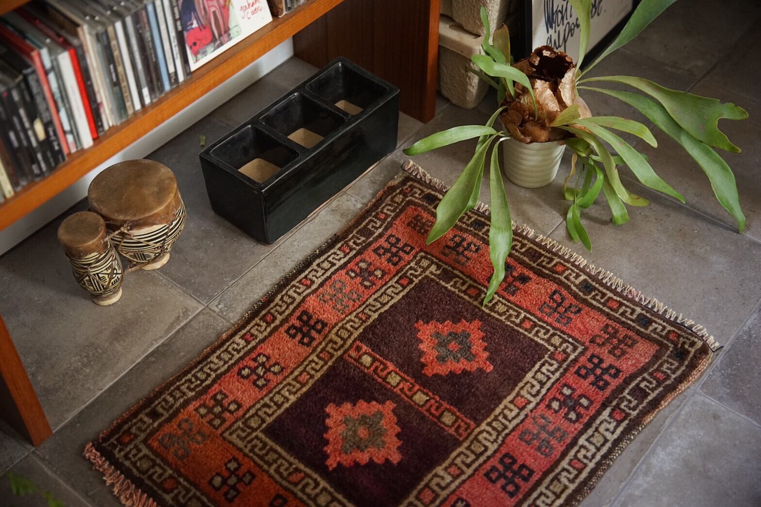 素朴で心安らぐ雰囲気がかわいいタイマニラグ。元々茜色だったパイルが経年変化によりコーラル系のオレンジになっています。色も場所によってテラコッタの様な色にも見える部分があり、光の加減で見え方が違うのもおもしろいです。目立ったダメージや補修跡も無く、パイルはフカフカで思わず素足で踏みしめたくなります。玄関マットやキッチン、ベッドサイド、ペットのお気に入りの場所に♪とても使いやすいサイズ感です。