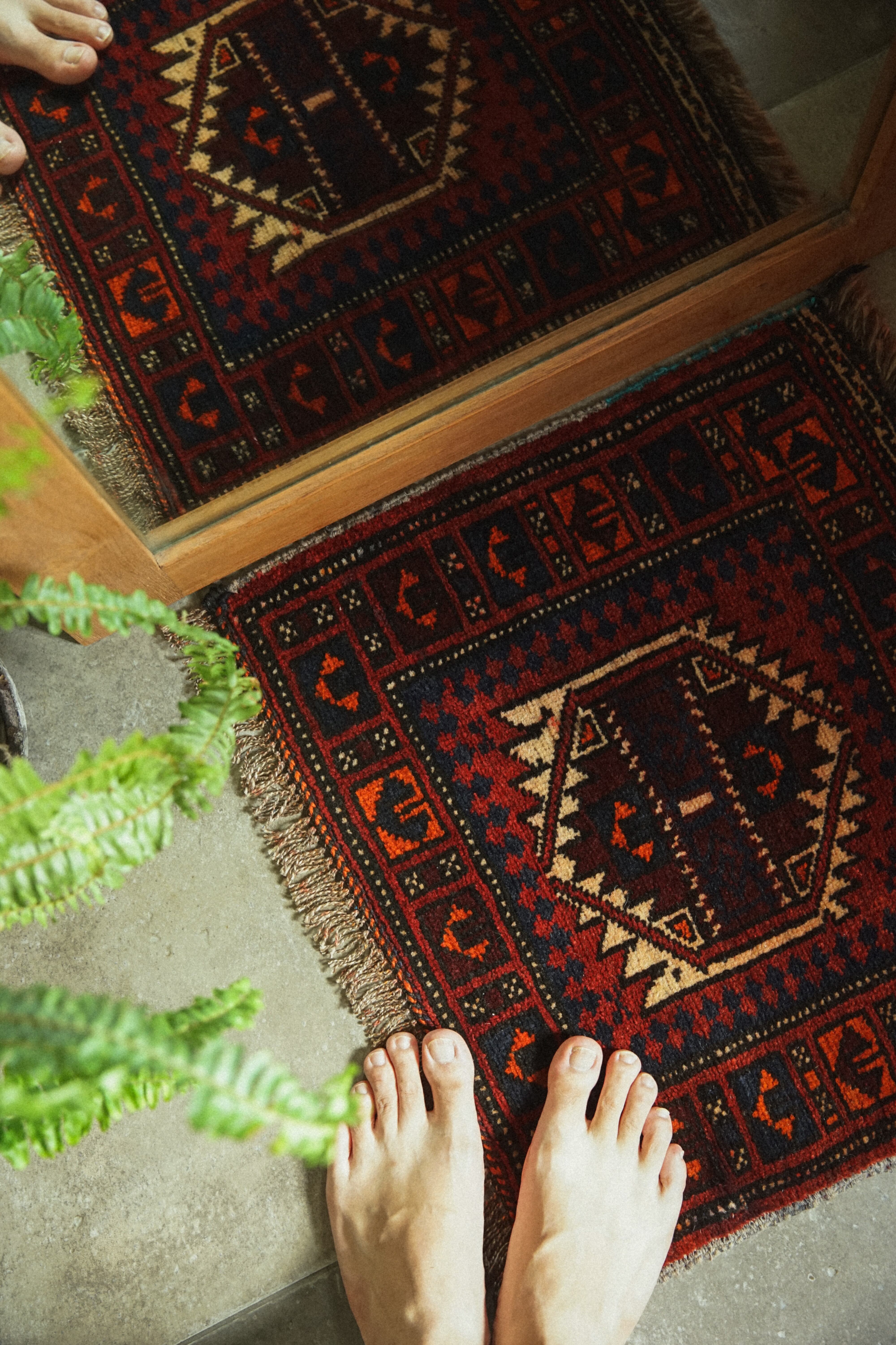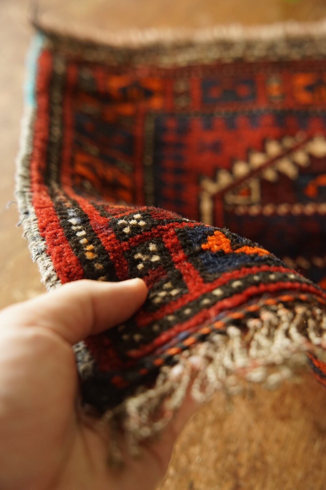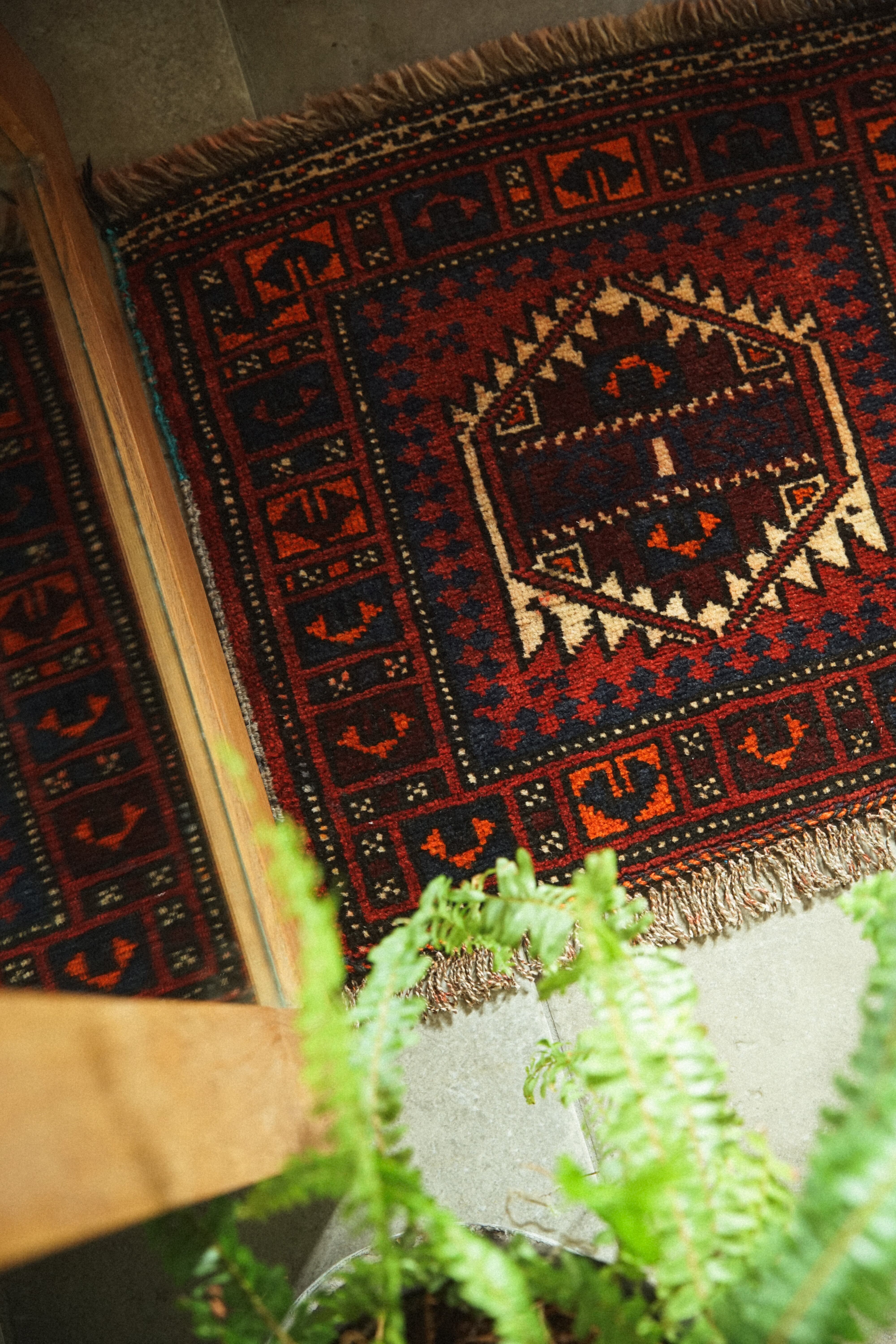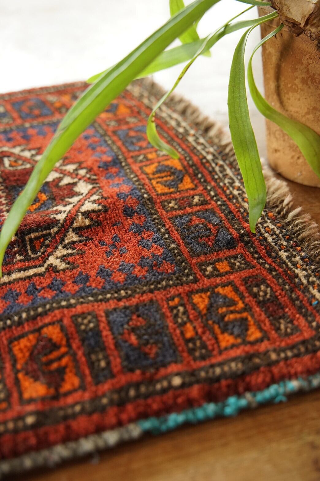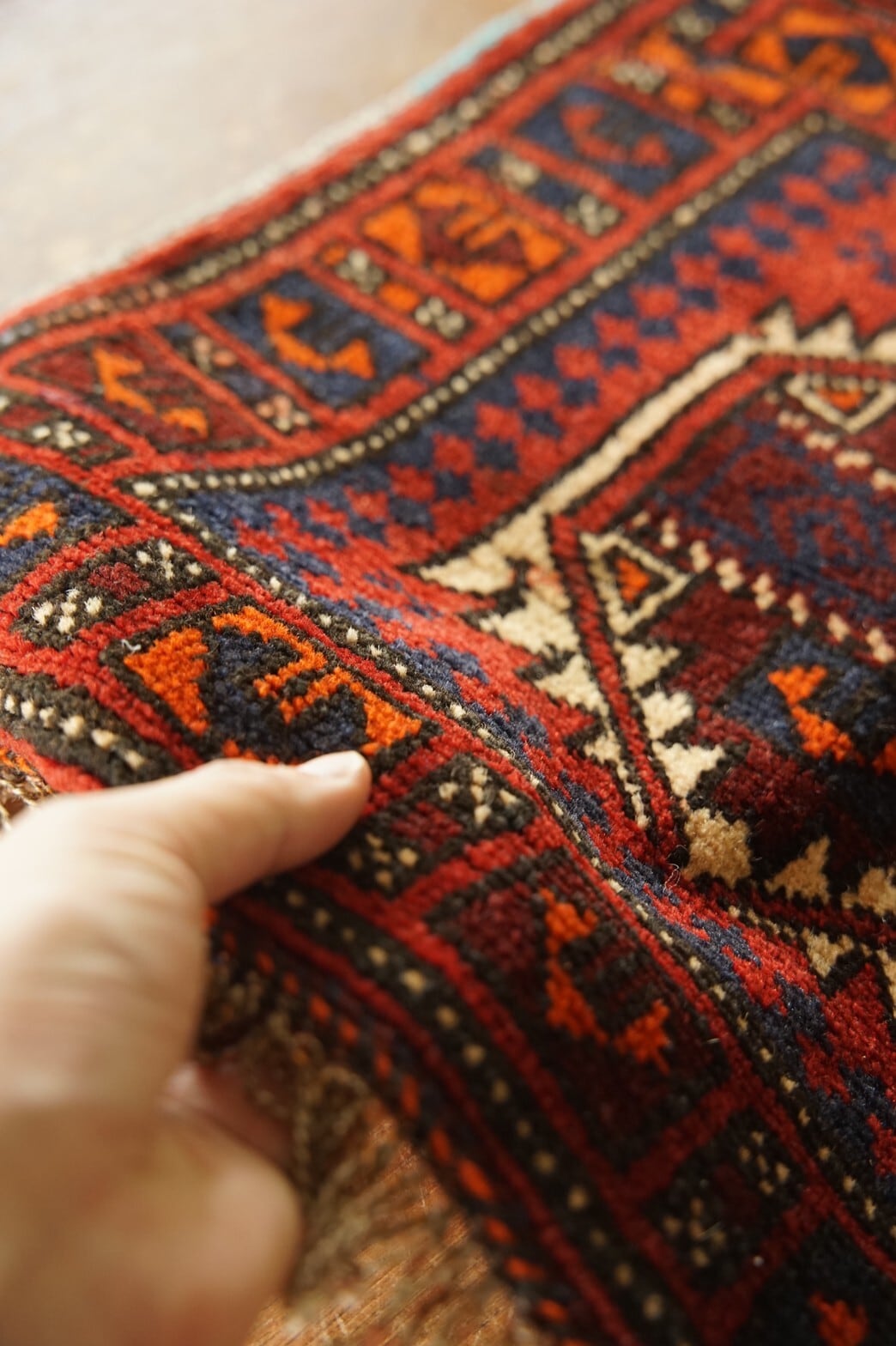 赤×オレンジがベースにネイビーが効いた元気になれる色合いのミニラグ。セルベッジ部分が一部水色なのがアクセントになっています!ダメージや補修跡も無く、パイルもとても綺麗に残っていてすべすべの手触り。少し薄手で持ち運びしやすいので部屋の色んなところに試し敷きしてとっておきの場所を見つけてみるのもいいですね♪キャンプやピクニックなどのアウトドアでのご使用もおすすめです。