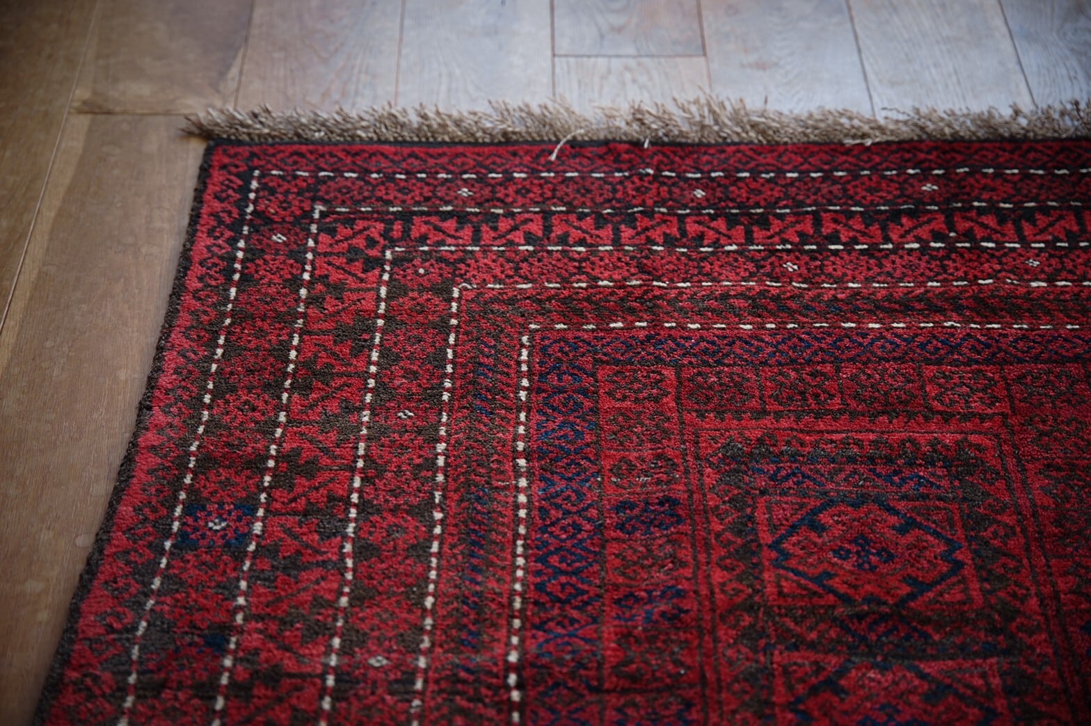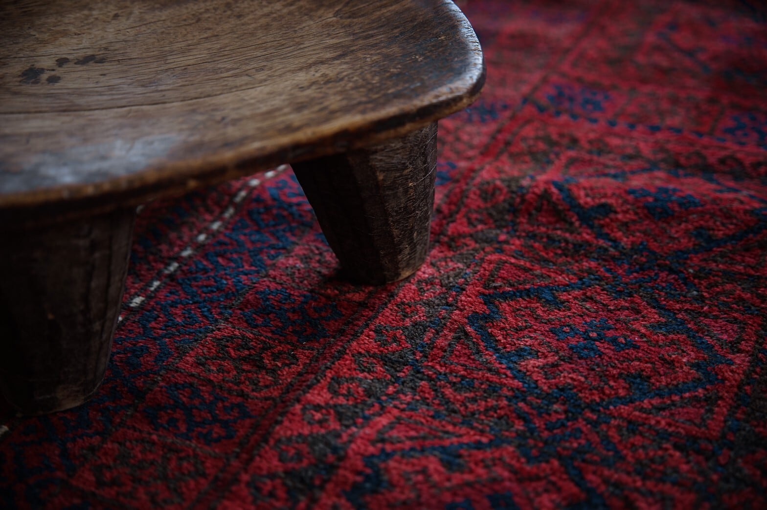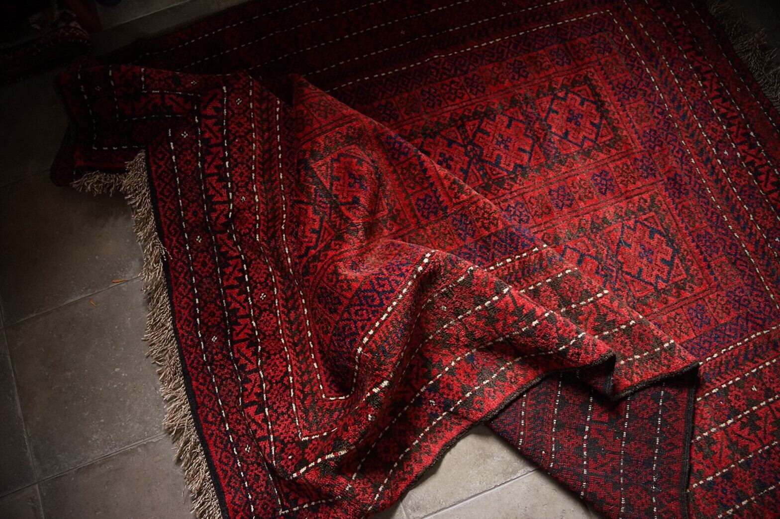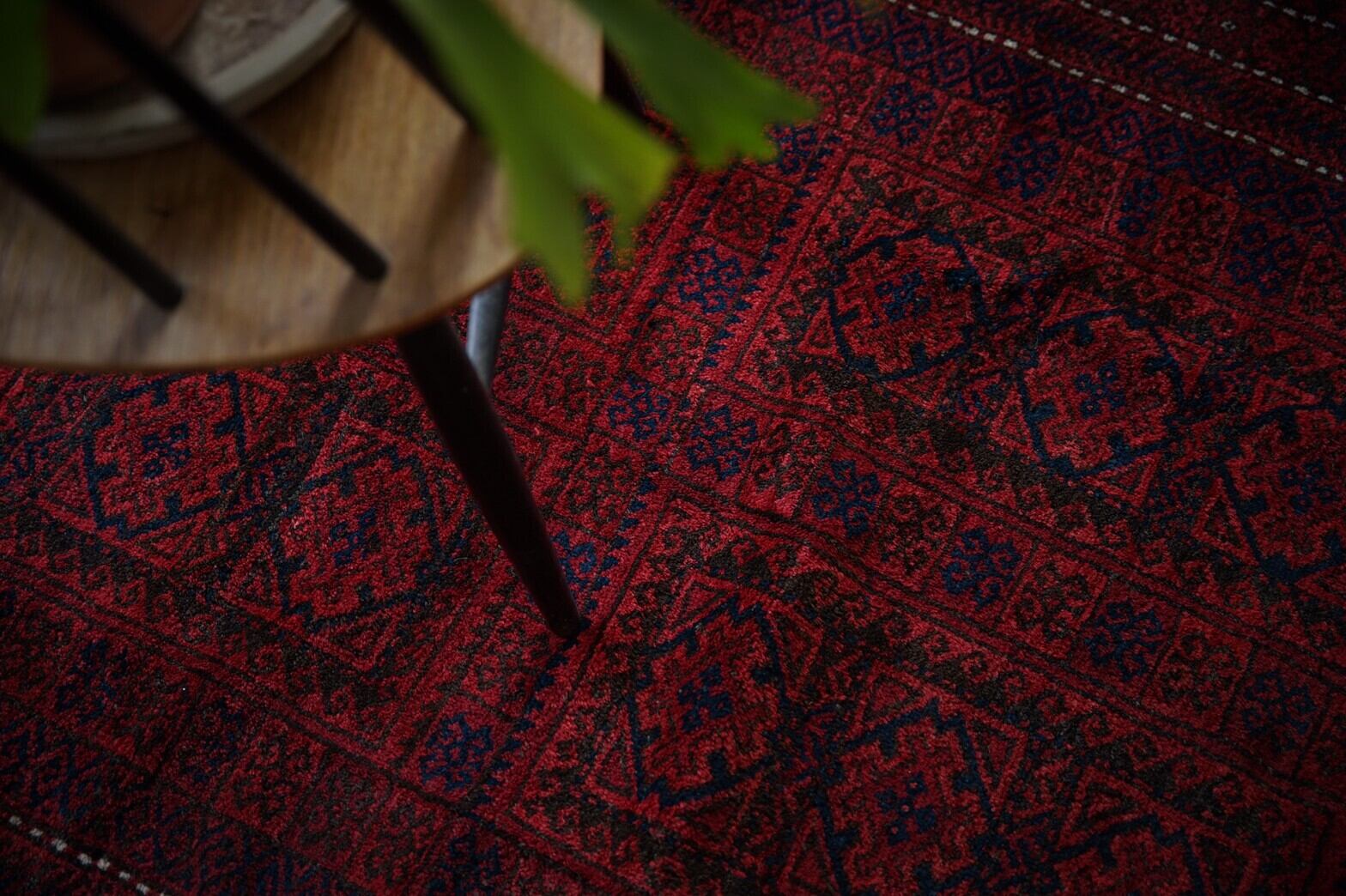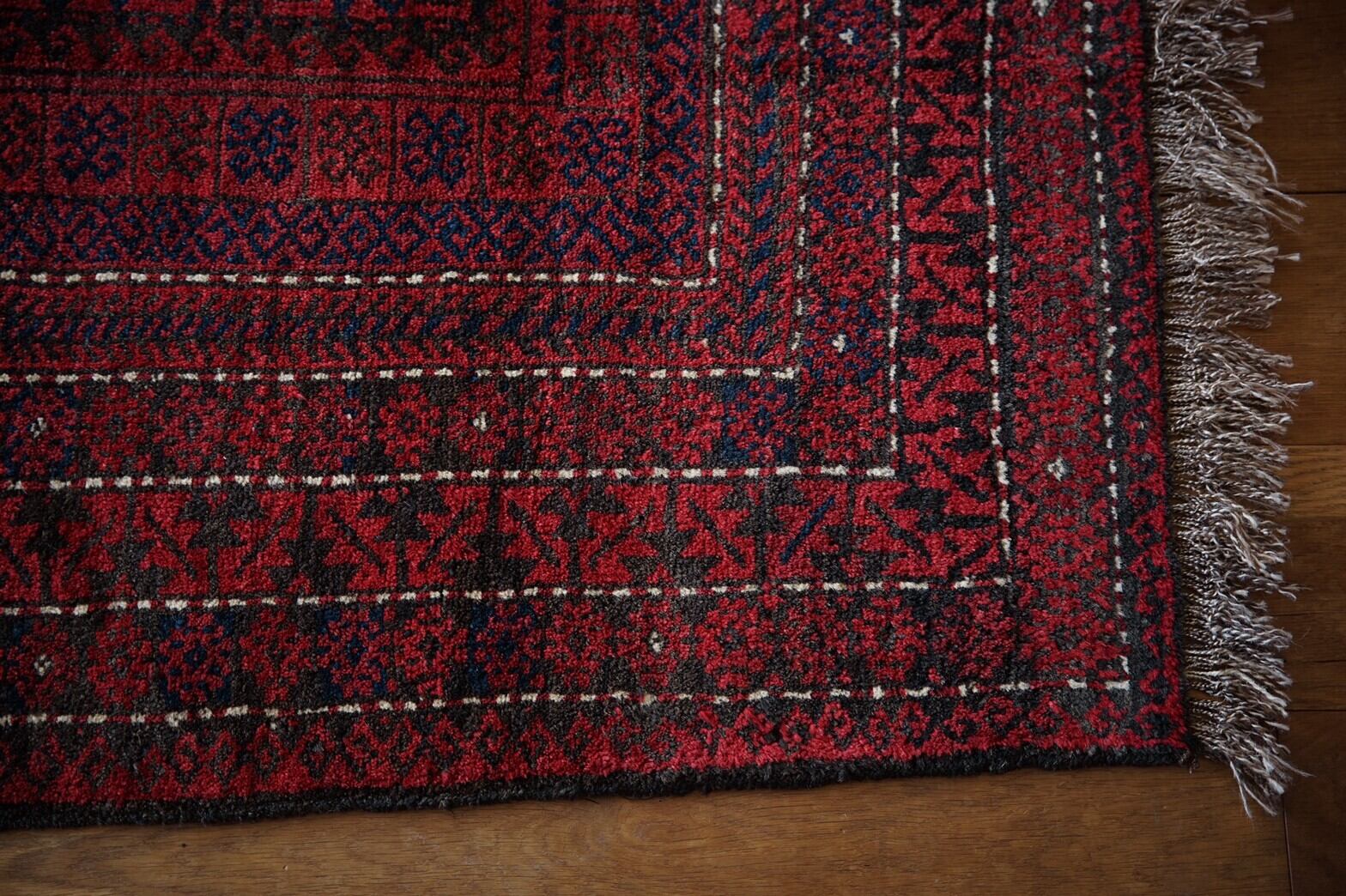 約70年前にアフガニスタンのヘラート地方で織られたバルーチラグ。茜色のフィールド一面にネイビーと黒で細かいモチーフがたくさん描かれています。柄が細かいですが、色合いが落ち着いた色合いのためうるさく感じません。ボーダー部分を囲むキリトリ線のような白がアクセントになっています。店主の自宅のリビングにもこのラグと同じテイストの赤系バルーチラグを敷いていますが、赤いラグは本当にパワーをもらえます。ダメージや補修あとも無くコンディションも良好でパイルもキレイに残っていてすべすべと気持ちの良い肌触り。程よい厚みがあり、床に敷いてもずれにくいかと思います。リビングや書斎、窓辺や、ベッドサイド、ダイニングテーブルの下にもオススメのサイズです。