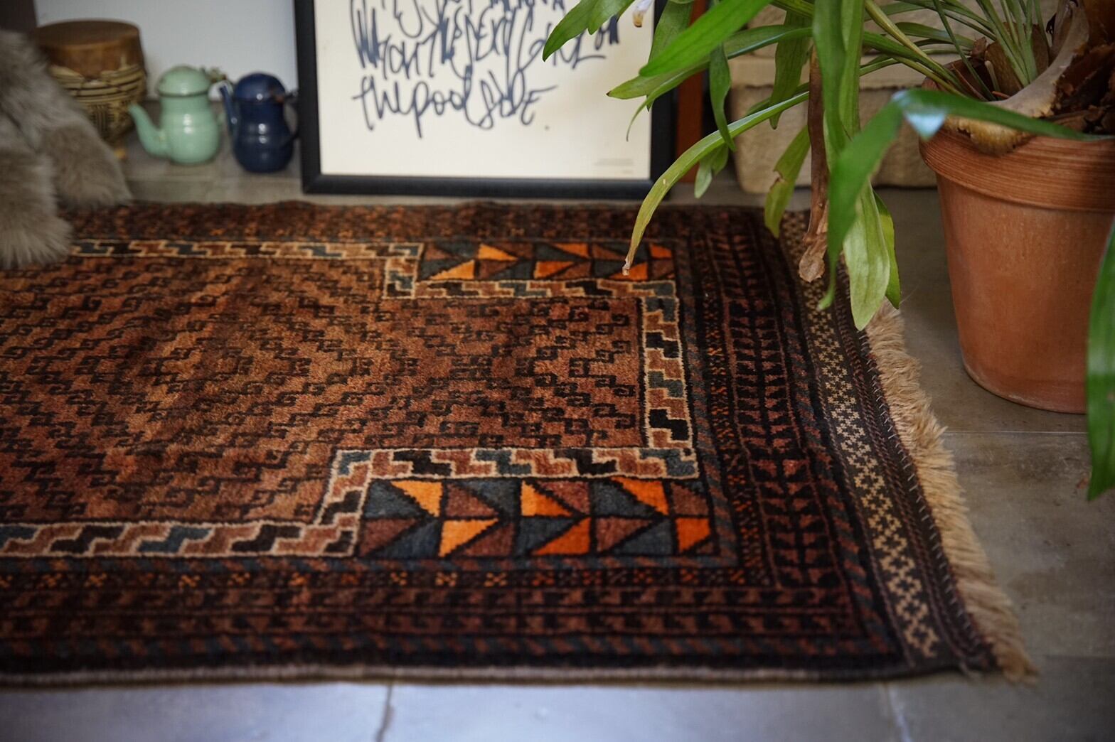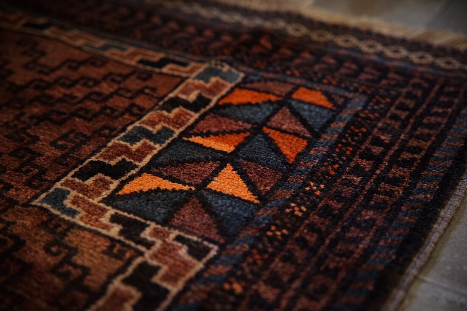 褪色したテラコッタ色の艶が美しいマルダリプレイヤーラグ。お祈りの際、手を置く部分のオレンジ×ブルーの配色がかっこいいです!!フリンジはキリムエンド。使っている色やデザインもシンプルだからこそセンスの良さが光っています。またダメージや補修跡もなくパイルもとてもキレイに残っていてパーフェクトコンディション。フカフカ、すべすべでとても気持ちいいです♪この色合いや雰囲気が店主も大好きでかなり推しの一枚です。玄関マットサイズなので日本の住宅事情的には家のあらゆるシーン(キッチン、鏡の前、窓辺、玄関、ペットのお気に入りの場所として)で使い勝手の良いラグです。
