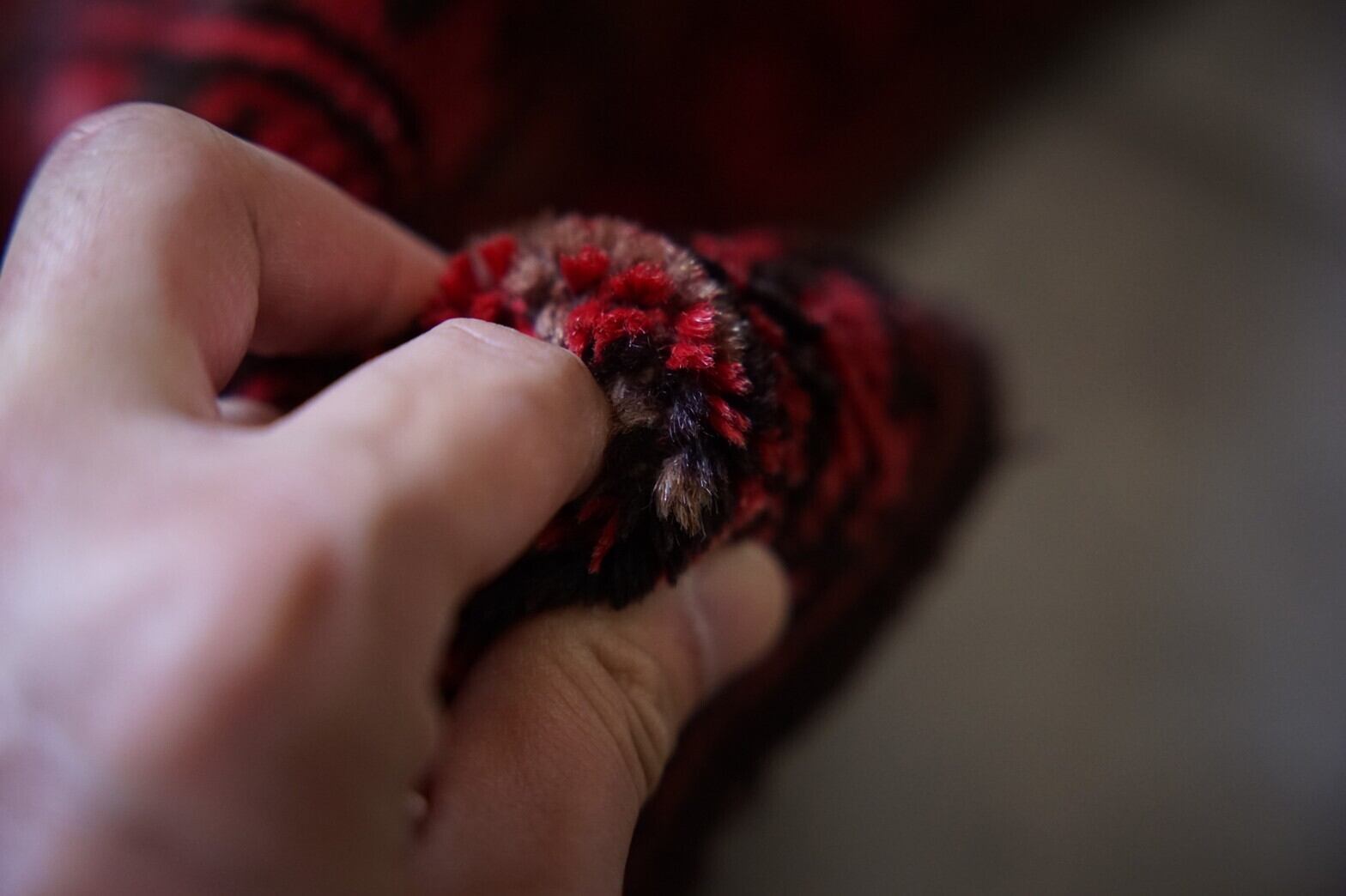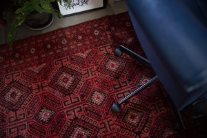 リビングサイズの赤系のトライバルラグをお探しの方へ。60年前のものとは思えないくらい保存状態が良かったのかとてもキレイな状態です。色合いは赤×黒×ベージュのシンプルな色合いに邪視よけとされるさそりのモチーフの幾何学模様がたくさん並びます。ボーダー部分には水の流れや羊の角の様なモチーフも見られ、細かいところまでデザイン性の高いラグです。ダメージや補修跡も無くコンディションはとても良く、パイルも艶があり美しいままです。肌触りもすべすべと気持ちいいですよ。リビングやソファの前、書斎に敷いたり、ベッドサイドなどにオススメのサイズです。