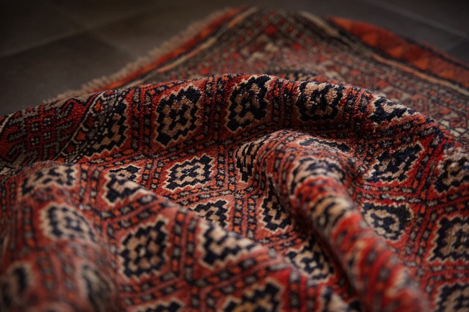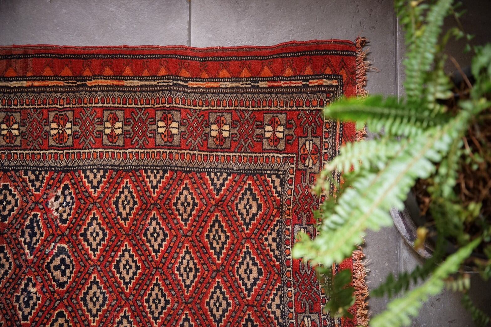 アフガニスタンのヘラート地方で作られたスクエア型のトライバルラグ。フィールドには邪視よけのモチーフがたくさん並び、ボーダー部分には裕福や豊かさを願うごぼうのモチーフが描かれています。細かいモチーフがたくさん並んでいますが、茜色×グレージュの組み合わせなのでインテリアにも合わせやすいですよ♪一箇所補修跡ございますが、キレイにリペアされており使用するには問題ございません。パイルは少し短めですべすべと気持ちいい手触り。ツヤ感もあるとても美しいラグです。リビングのお気に入りの場所や一人がけソファの前、書斎やベッドサイドなどにオススメのサイズです。