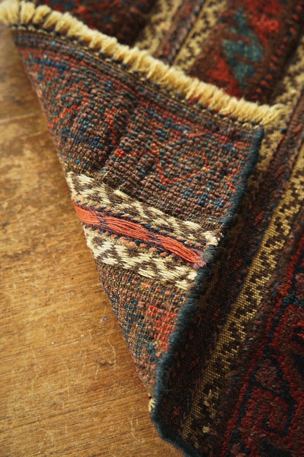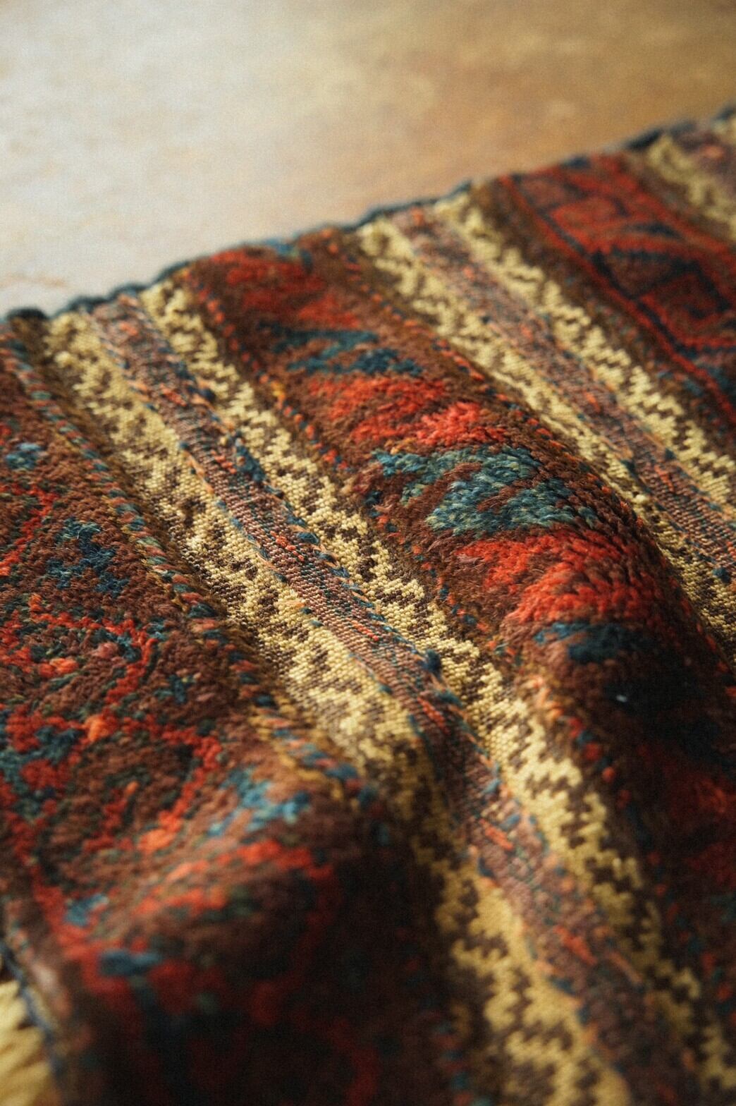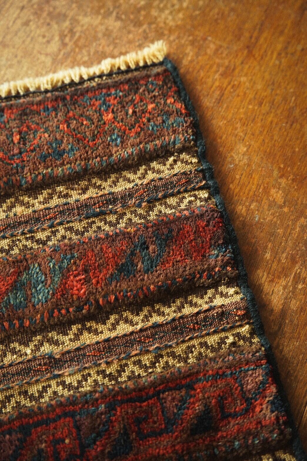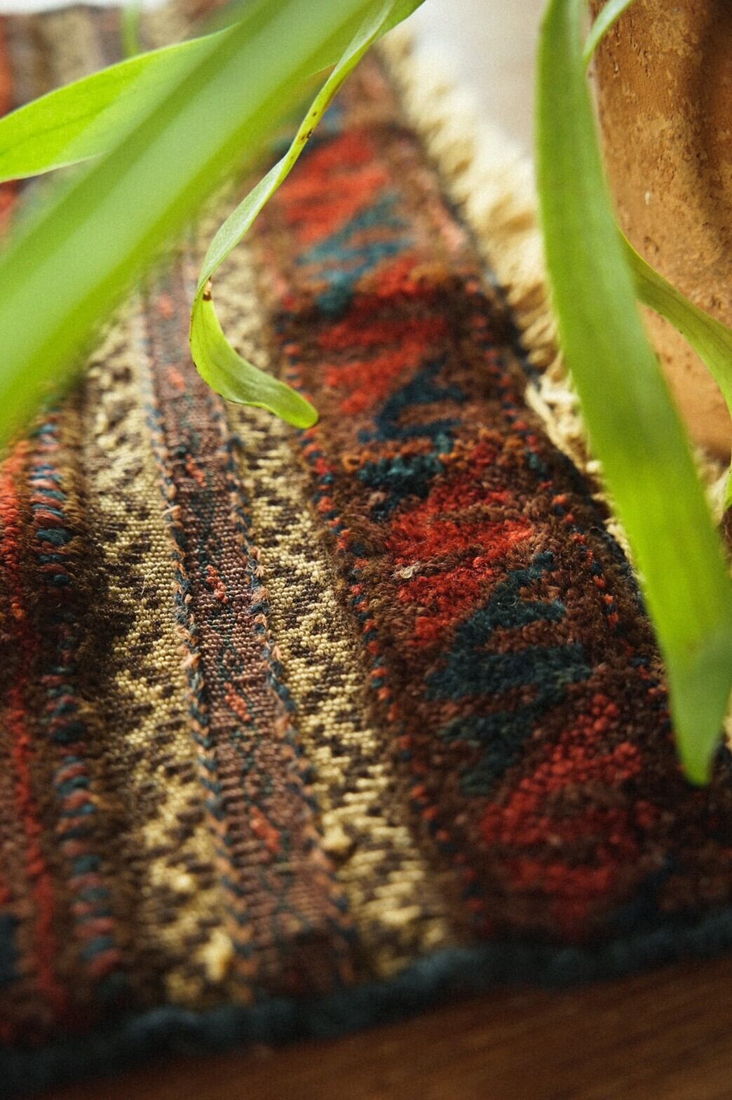 パイル×キリムの切り替えがかっこいいミニサイズのラグ。パイル部分はブラウン系に見えますが、光に当てると深いボルドーのようにも見える絶妙な色合い。水の流れや羊の角の様なモチーフが描かれています。キリム部分とパイル部分があるので他のラグにはないメリハリ感があります。ダメージや補修跡も特になく、パイル部分はフカフカ。窓辺やチェストの上、観葉植物の近くに敷いたり…ピクニックやキャンプなどのアウトドアに持ち出しでのご使用もおすすめです♪