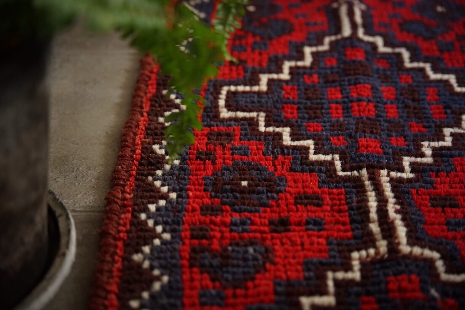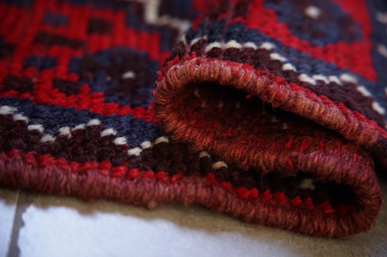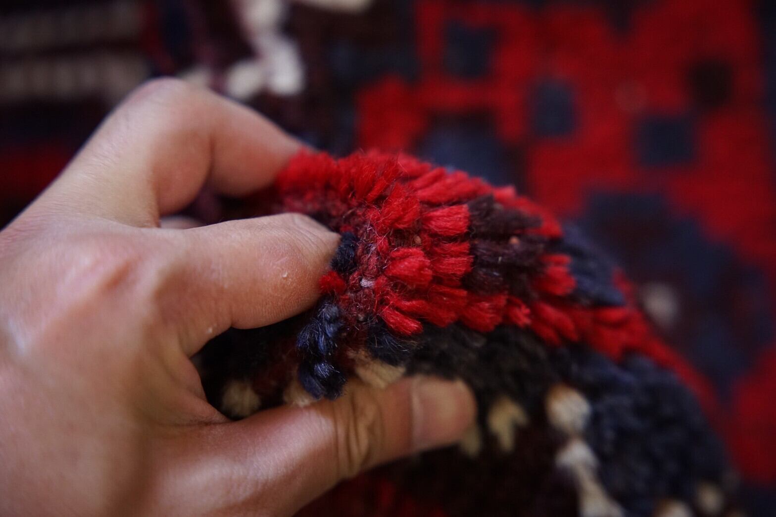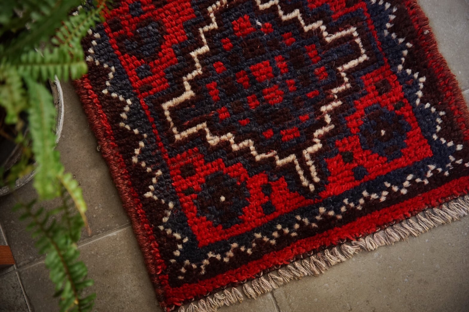 赤系のシンプルな柄がかわいいカシュガイラグ。ざっくりとした雰囲気がモロッコラグと似ていますね♪色合いも赤にブルーが映えます。パイルは太めで踏みしめるとポコポコ感があります。ダメージや補修跡はなく、状態はとても良くキレイです。少し細長い形なので玄関やキッチン、窓辺に植物と一緒に敷くのもおすすめです!