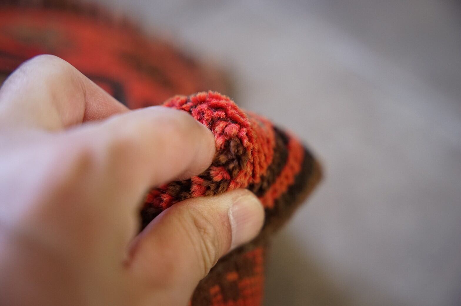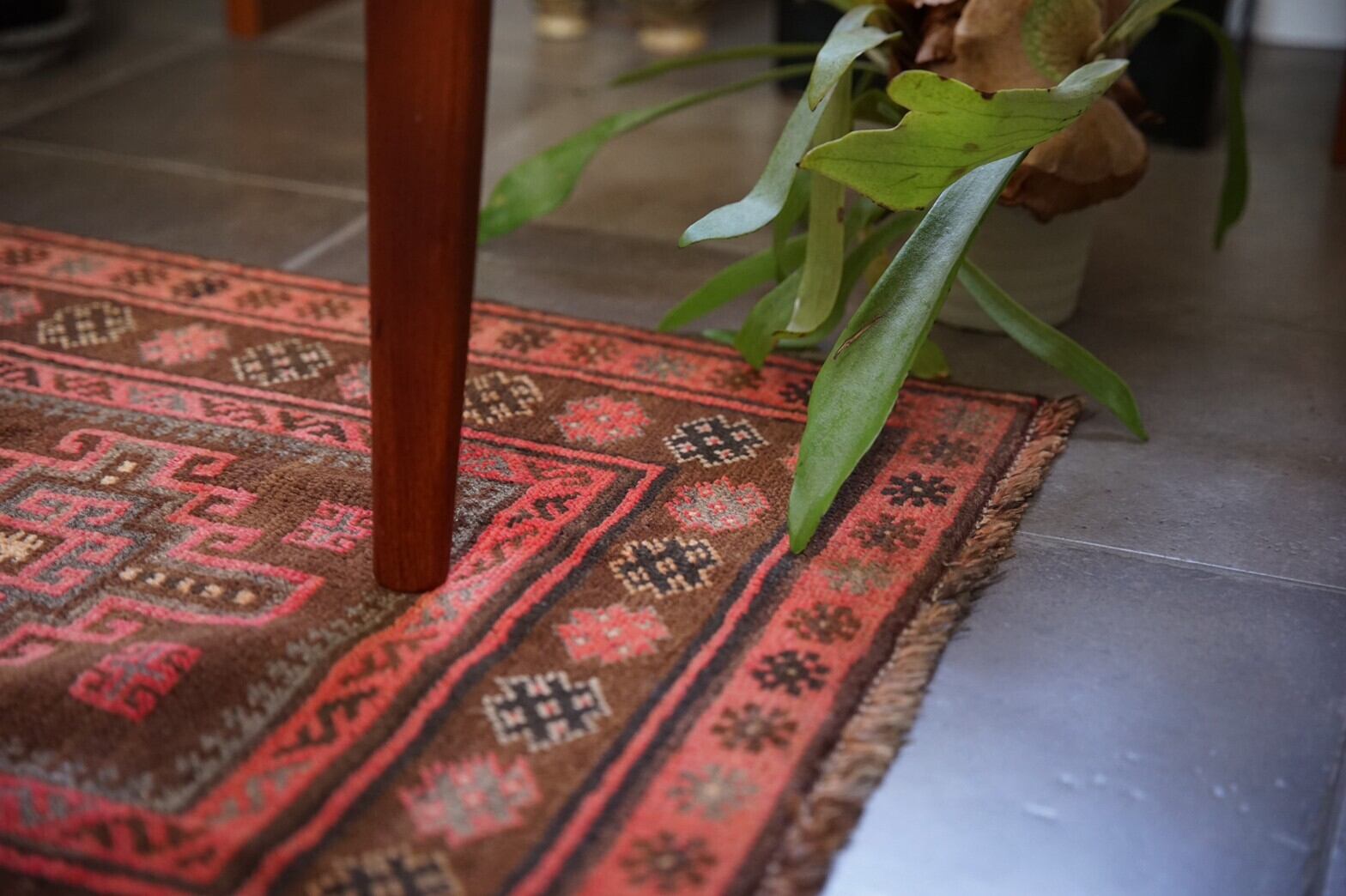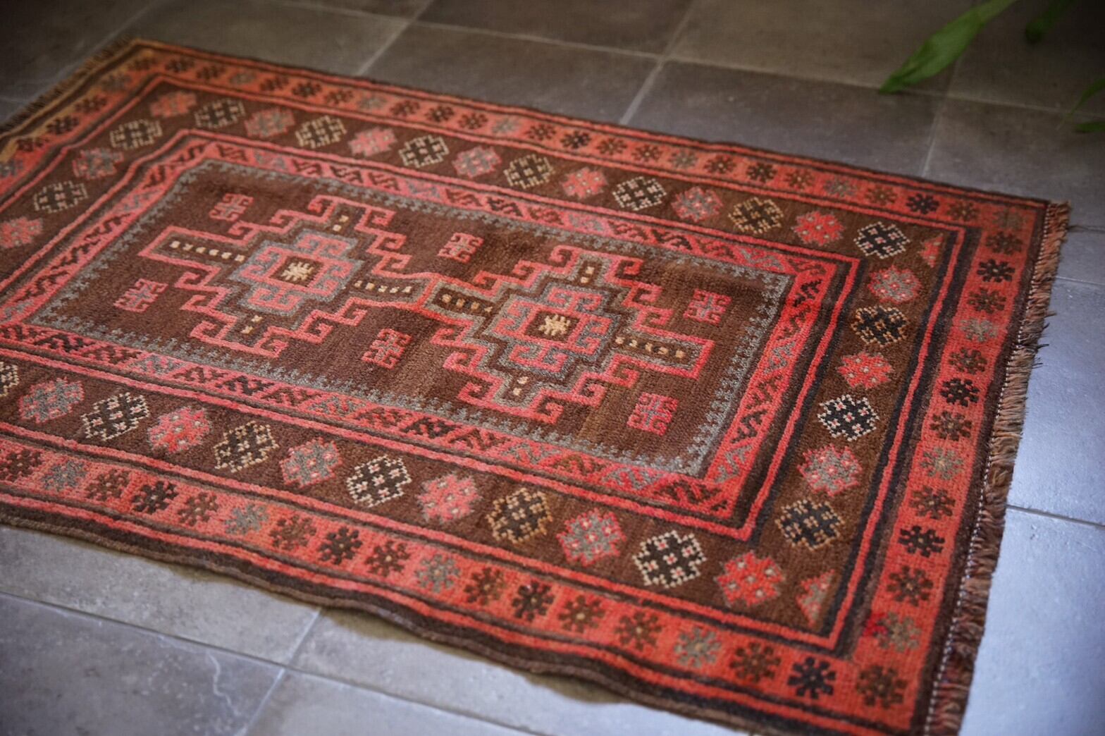 オレンジ〜赤の中間くらいの朱色に近い優しい色合いのバルーチラグ。アブラッシュと言われるグラデーションがあり美しいです。ボーダー部分にはブラウン系をメインにごぼうの花のモチーフがたくさん描かれています。ダメージや補修跡もなくコンディションはとても良いです。しっかりとした織りですがパイルは短めでお掃除もしやすくこれからの季節にもおすすめです。玄関マットサイズなので日本の住宅事情的には家のあらゆるシーン(キッチン、鏡の前、窓辺、玄関、ペットのお気に入りの場所として)で使い勝手の良いラグです。