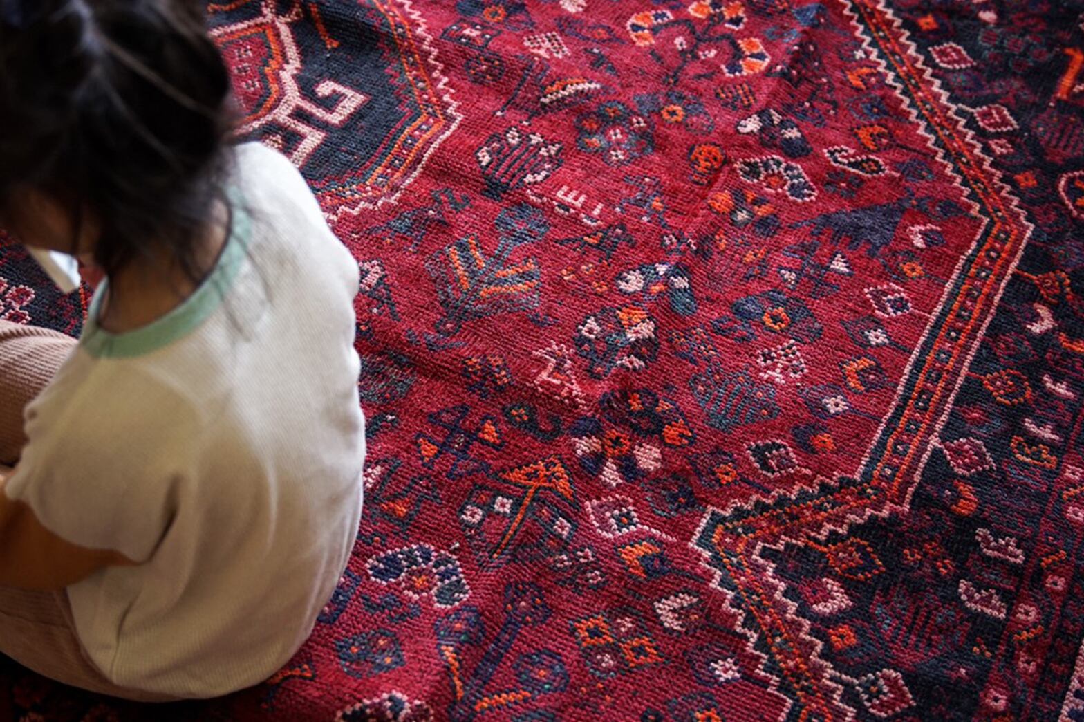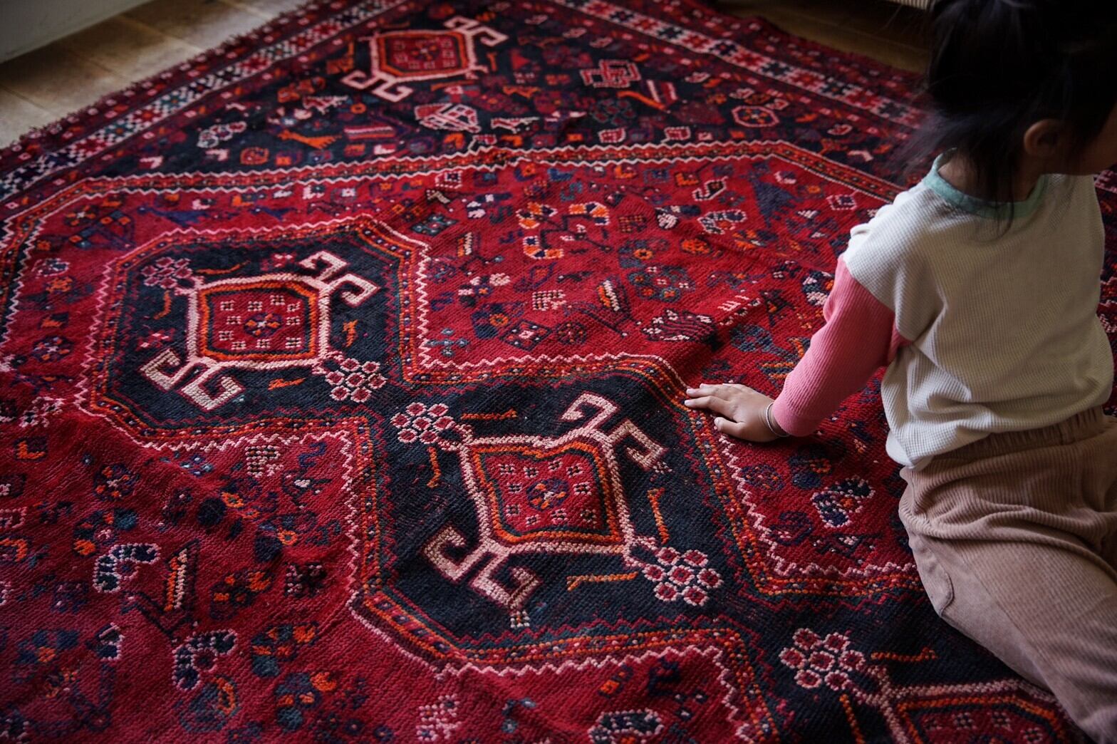 大判のカシュガイラグ。フィールド一面には自然と共に暮らすカシュガイ族の伝承模様がたくさん並びます。一つ一つのモチーフがとてもかわいらしく、ずっと見ていても飽きない魅力があるラグです。生き物や花々、草、木など何が描かれているのかぜひじっくりと眺めてみてください♪一つだけ派手なピンク色のお花があり、娘はとてもお気に入りのようでした。補修跡は多少ございますが、きれいにリペアされ大切に使われてきた様子が見られそれも愛着が湧きますね。しっかりとした作りで厚みや重量感がありますが、パイルは長すぎずさらっとした手触りで気持ちいいのでぜひゴロンと横になってみてください。お家のリビングやダイニングの主役に!また、ご自宅だけでなくショップや音楽スタジオ、写真スタジオなどでご使用もおすすめです。