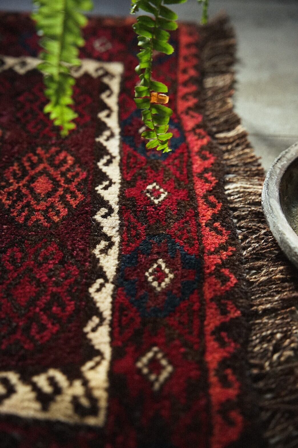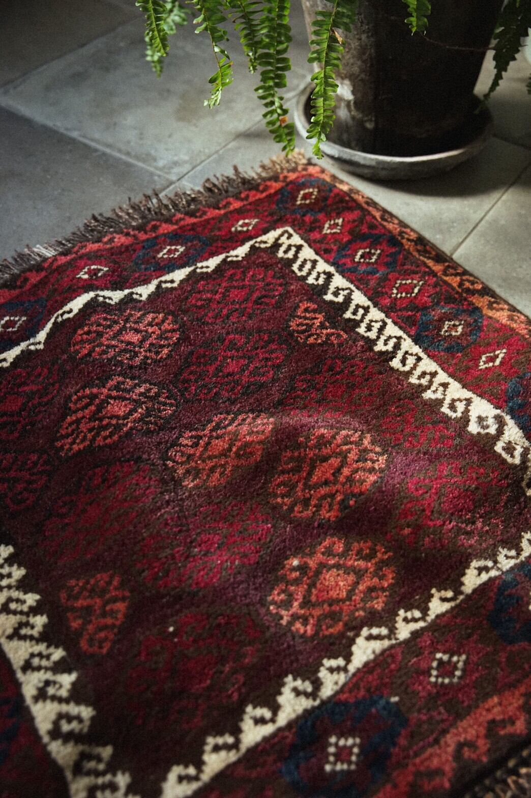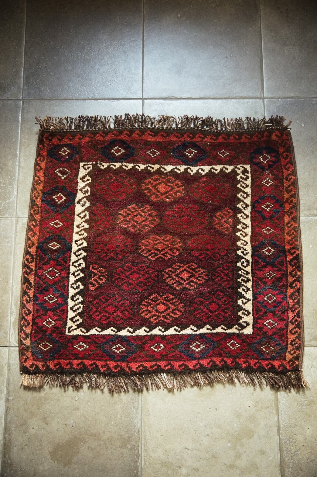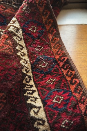 バルーチ族のサドルバッグのバッグフェイスです。経年変化で少し紫がかった小豆色のようなボルドーのような色合いの暖色系の組み合わせがとてもかわいらしいラグ。パイルは艶があり、フカフカしていて手触りも気持ち良いです。ダメージや補修跡もなくコンディション良好。玄関やキッチン、姿見の前やペットのお気に入りの場所として。また、渋めの色合いが和室にもおすすめです。スクエア型なので座布団代わりに使うのもいかがでしょうか。