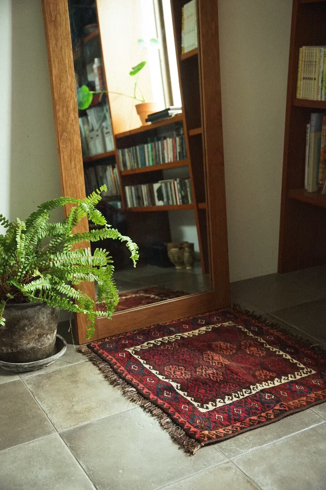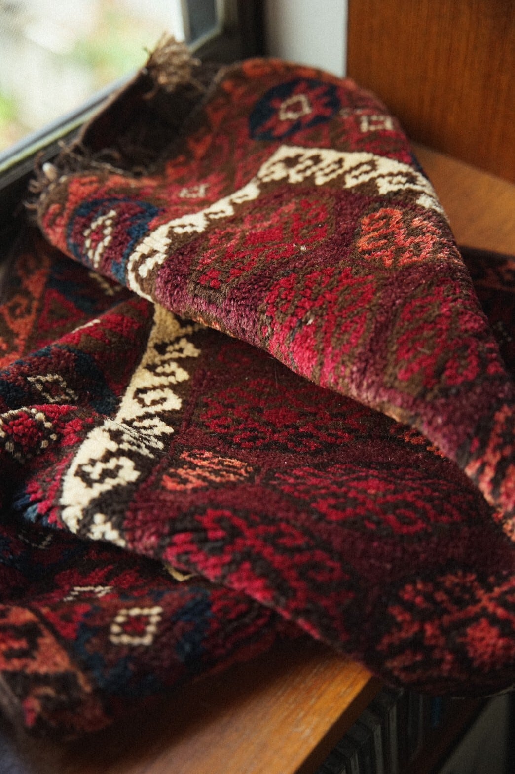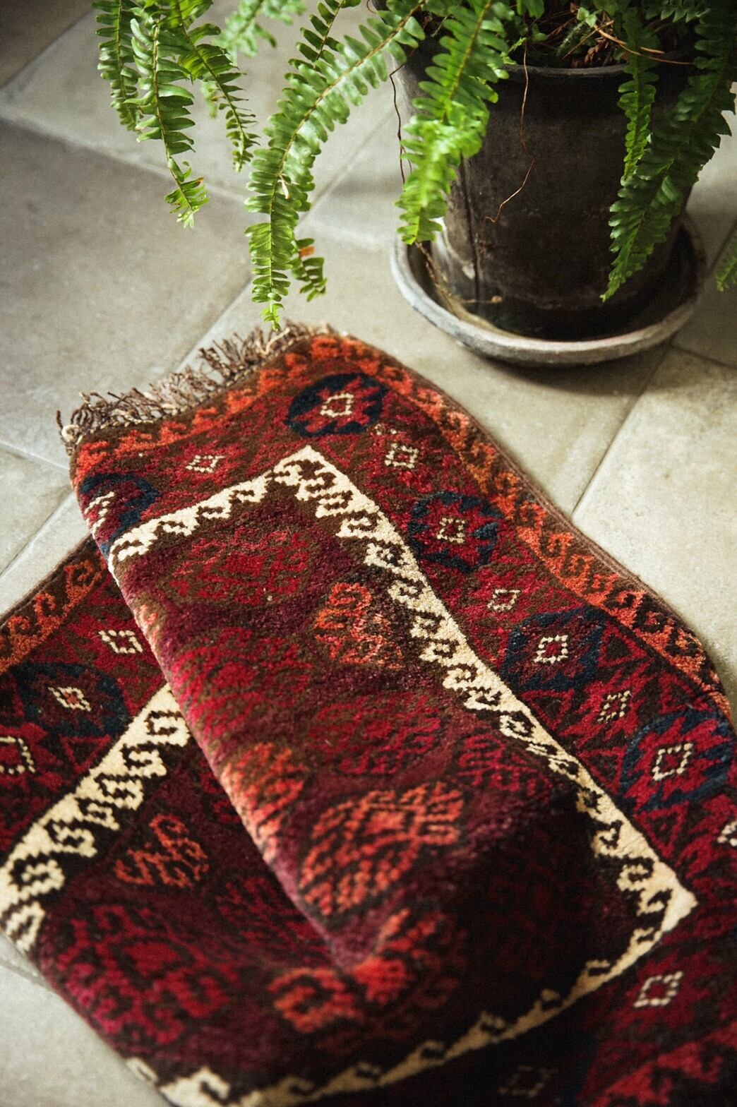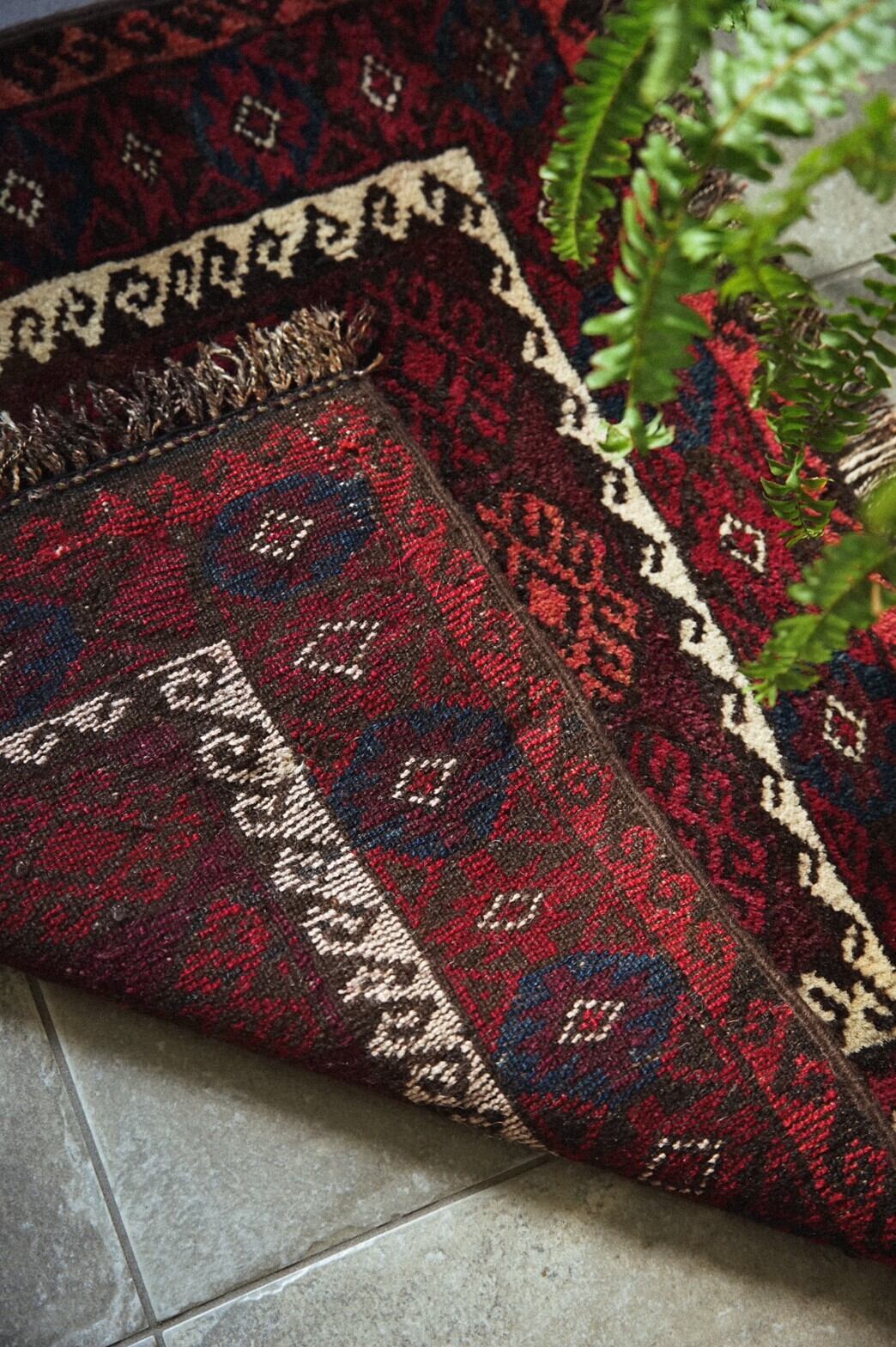 バルーチ族のサドルバッグのバッグフェイスです。経年変化で少し紫がかった小豆色のようなボルドーのような色合いの暖色系の組み合わせがとてもかわいらしいラグ。パイルは艶があり、フカフカしていて手触りも気持ち良いです。ダメージや補修跡もなくコンディション良好。玄関やキッチン、姿見の前やペットのお気に入りの場所として。また、渋めの色合いが和室にもおすすめです。スクエア型なので座布団代わりに使うのもいかがでしょうか。