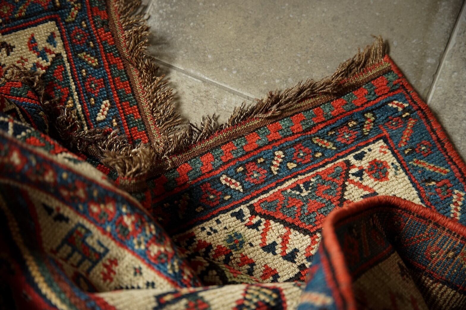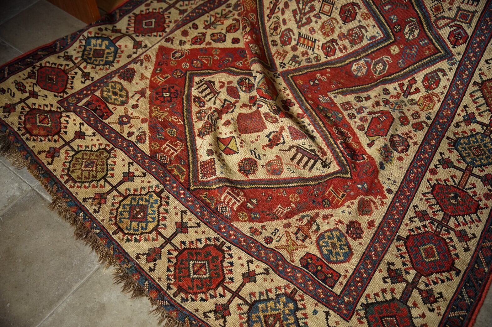 おおよそ140年前のハムセ連合によるカシュガイデザインのアンティークラグ。近年のトライバルラグ人気により希少となっているハムセ連合のラグ。一目見ただけで迫力が違います。ベースは黄みがかったアイボリーに菱形メダリオン、フィールドには自然の恩恵を受けて生きる遊牧民の伝承模様がたくさん並びます。花々や生命の樹、動物や鳥、人などが色鮮やかに描かれており、ずっと見ていたくなるような魅力があります。現地のディーラ情報ですと、このラグは恐らくお祝い事や儀式用に織られたものでとても貴重なものであまり出回っていない特別なピースとのこと。ブルーのボーダー部分に並ぶ赤い花柄もとてもかわいいです。厚みはありませんがアンティークにしか出せない色合いやしなやかな手触り。大きなダメージや補修跡もなく場所によってはパイルが残っている箇所もあります。大判なのでお部屋の主役として、また重ね敷きをしたり…またアンティークラグコレクターの方にもおすすめの一枚です。きっと宝物になってくれることでしょう♪