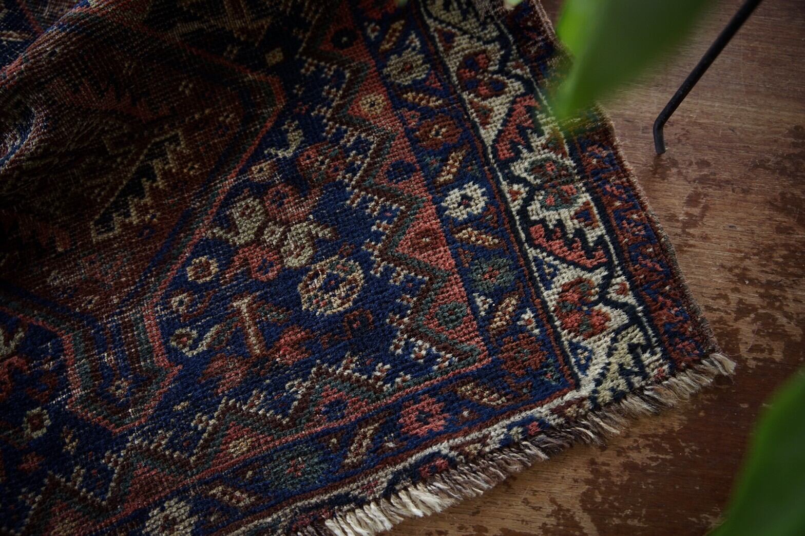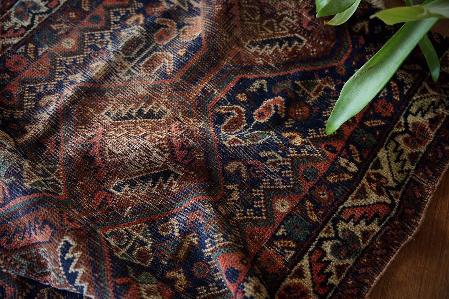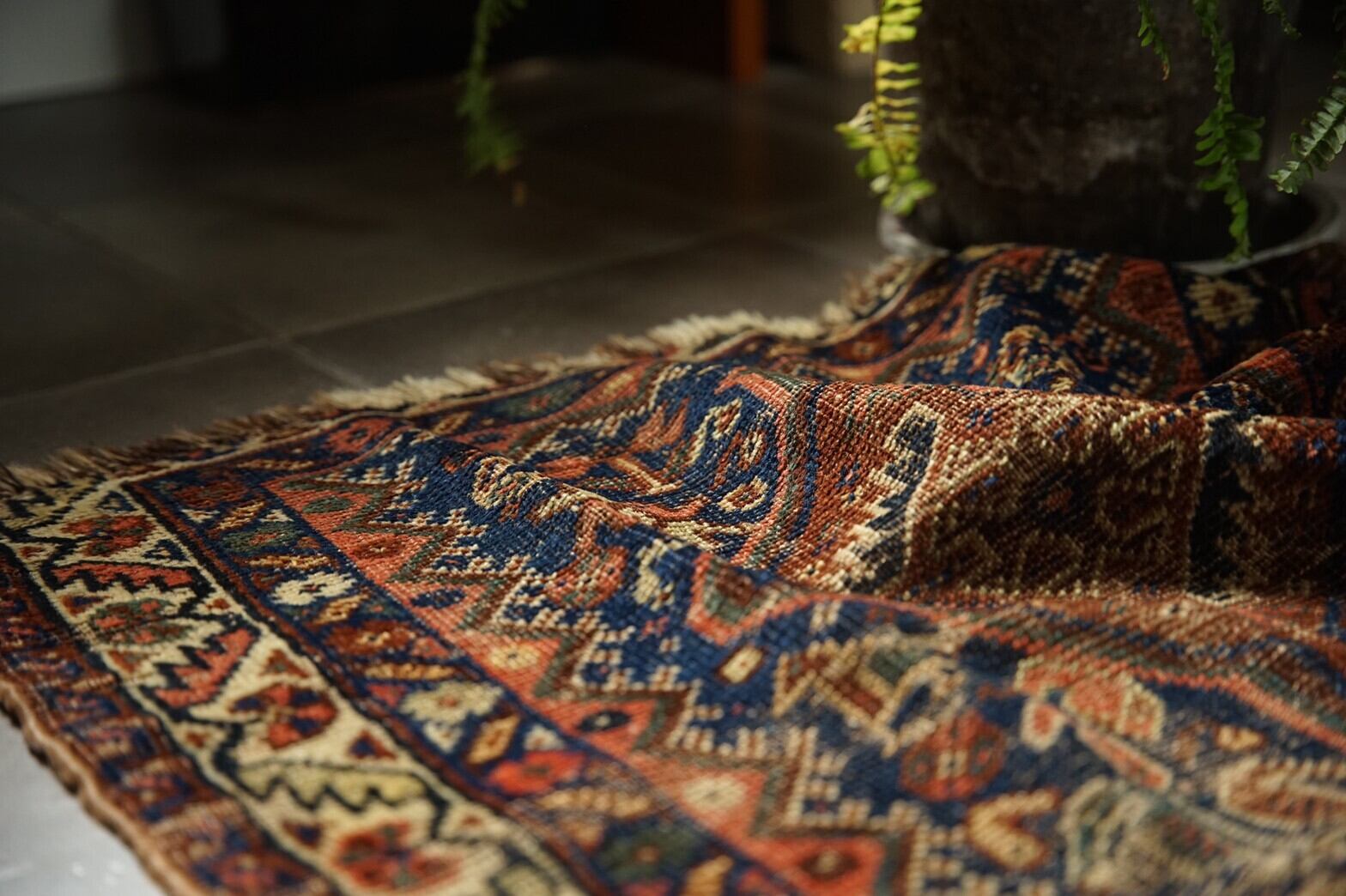 クタクタで色褪せている雰囲気のヴィンテージ感が好きな方へ。初めて会った時から初めてではない感覚でしっくりと部屋になじんでくれる佇まいのこちらのカシュガイラグ。長い時間をかけて出たこの味わいはヴィンテージラグならではの魅力ですね。フィールドにはボテや花々、鳥もいて華やかですが色合いが褪せたネイビーを中心に落ち着いたトーンのため渋くてとてもかっこいいです!経年変化による擦れで薄く感じる部分があるため、できればダイニングテーブルの下は避けて頂ければと思います。クタっとした雰囲気を生かしてソファや壁に掛けたり、姿見の前や玄関などに敷いたり、キャンプなどのアウトドアに持ち出しての使用もおすすめです。
