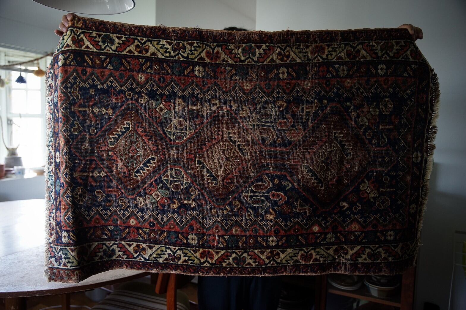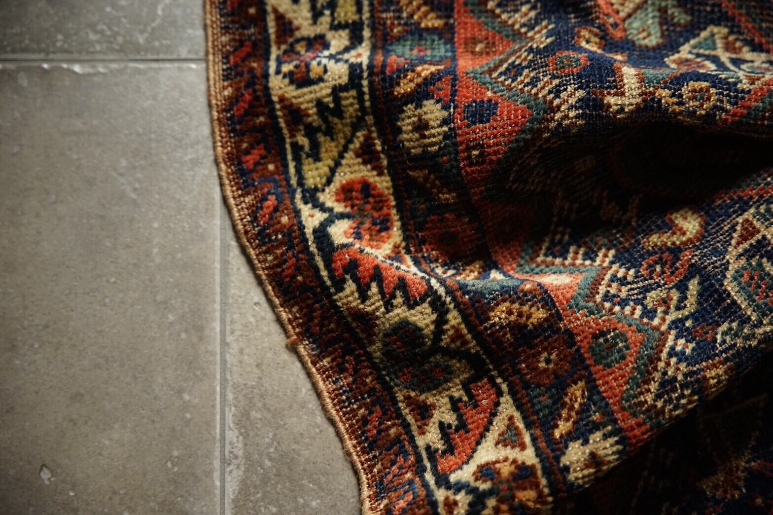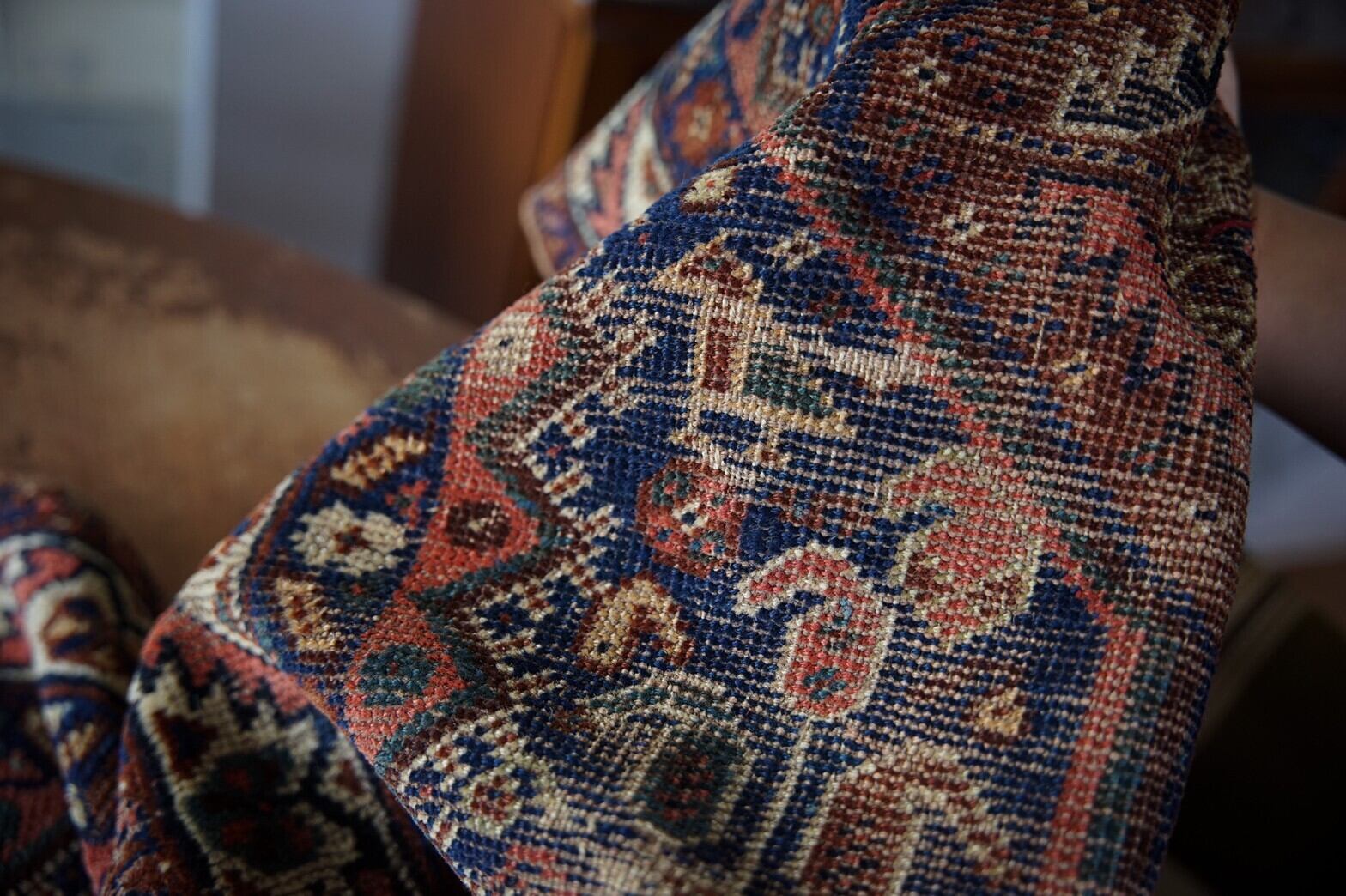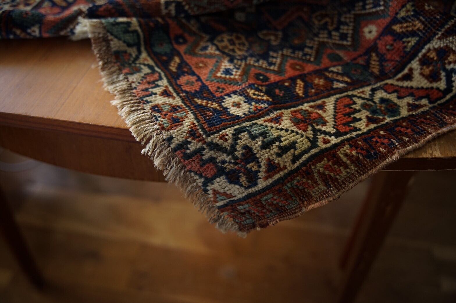 クタクタで色褪せている雰囲気のヴィンテージ感が好きな方へ。初めて会った時から初めてではない感覚でしっくりと部屋になじんでくれる佇まいのこちらのカシュガイラグ。長い時間をかけて出たこの味わいはヴィンテージラグならではの魅力ですね。フィールドにはボテや花々、鳥もいて華やかですが色合いが褪せたネイビーを中心に落ち着いたトーンのため渋くてとてもかっこいいです!経年変化による擦れで薄く感じる部分があるため、できればダイニングテーブルの下は避けて頂ければと思います。クタっとした雰囲気を生かしてソファや壁に掛けたり、姿見の前や玄関などに敷いたり、キャンプなどのアウトドアに持ち出しての使用もおすすめです。