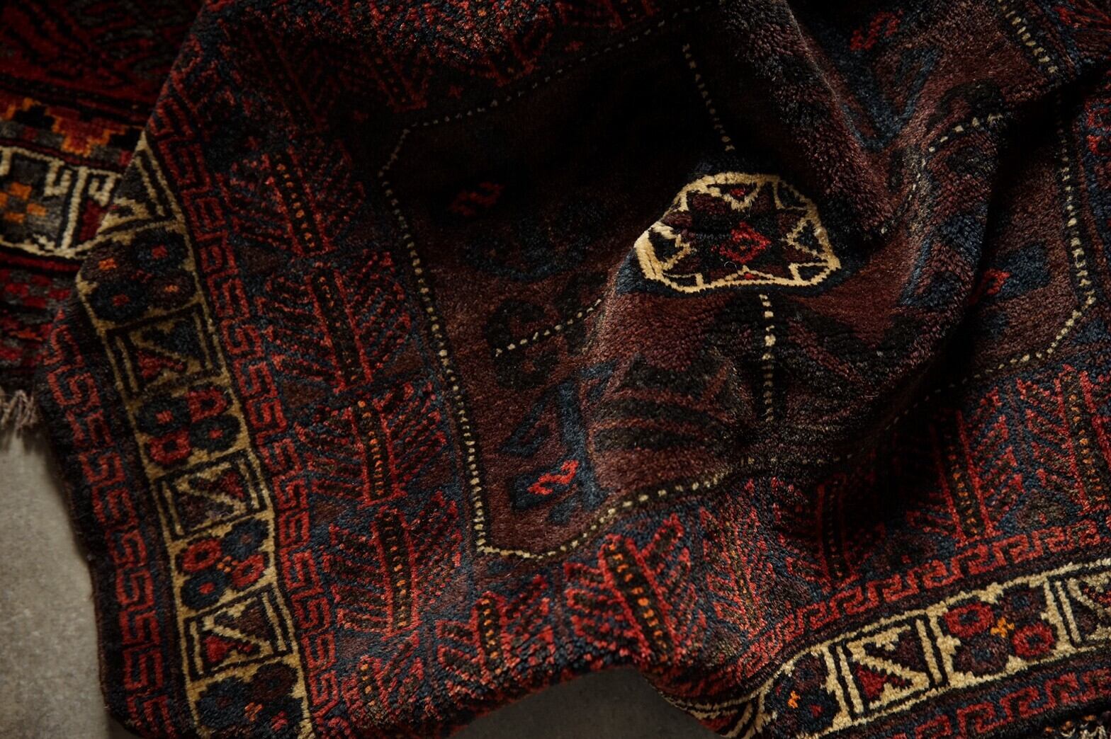 バルーチ族のサドルバッグのバッグフェイスです。(※対いで2枚あり。サイズ微妙に違うのでご確認ください。)ブラウン×ネイビー×深い赤を基調としたバルーチらしい落ち着いた色合いがとてもかっこいいスクエア型のラグ。パイルは艶があり、しっとりと滑らか。ダメージや補修跡もなくコンディション良好。玄関やキッチン、姿見の前やペットのお気に入りの場所として、キャンプなどのアウトドアに持ち出しての使用も♪渋めの色合いは和室にもおすすめです。スクエア型なので座布団代わりに使うのもいかがでしょうか。