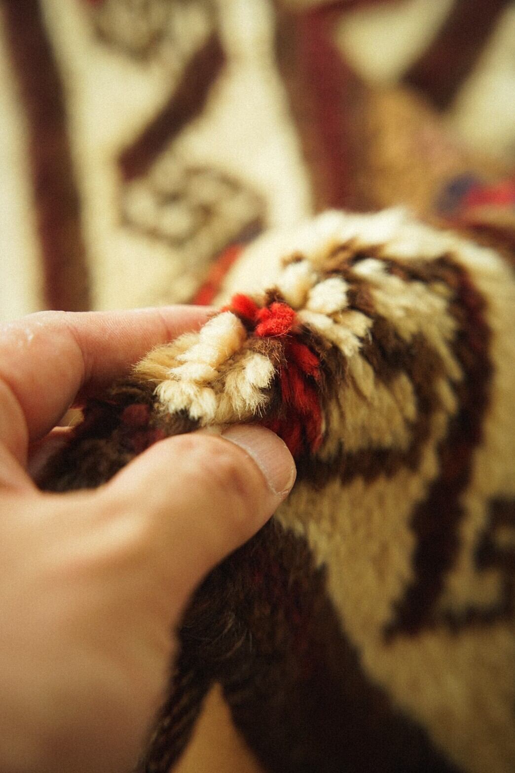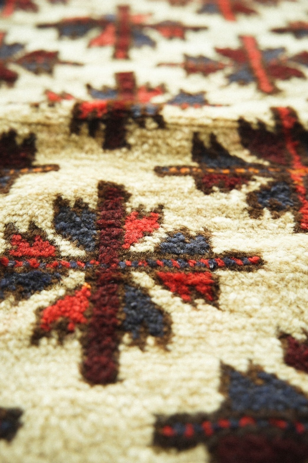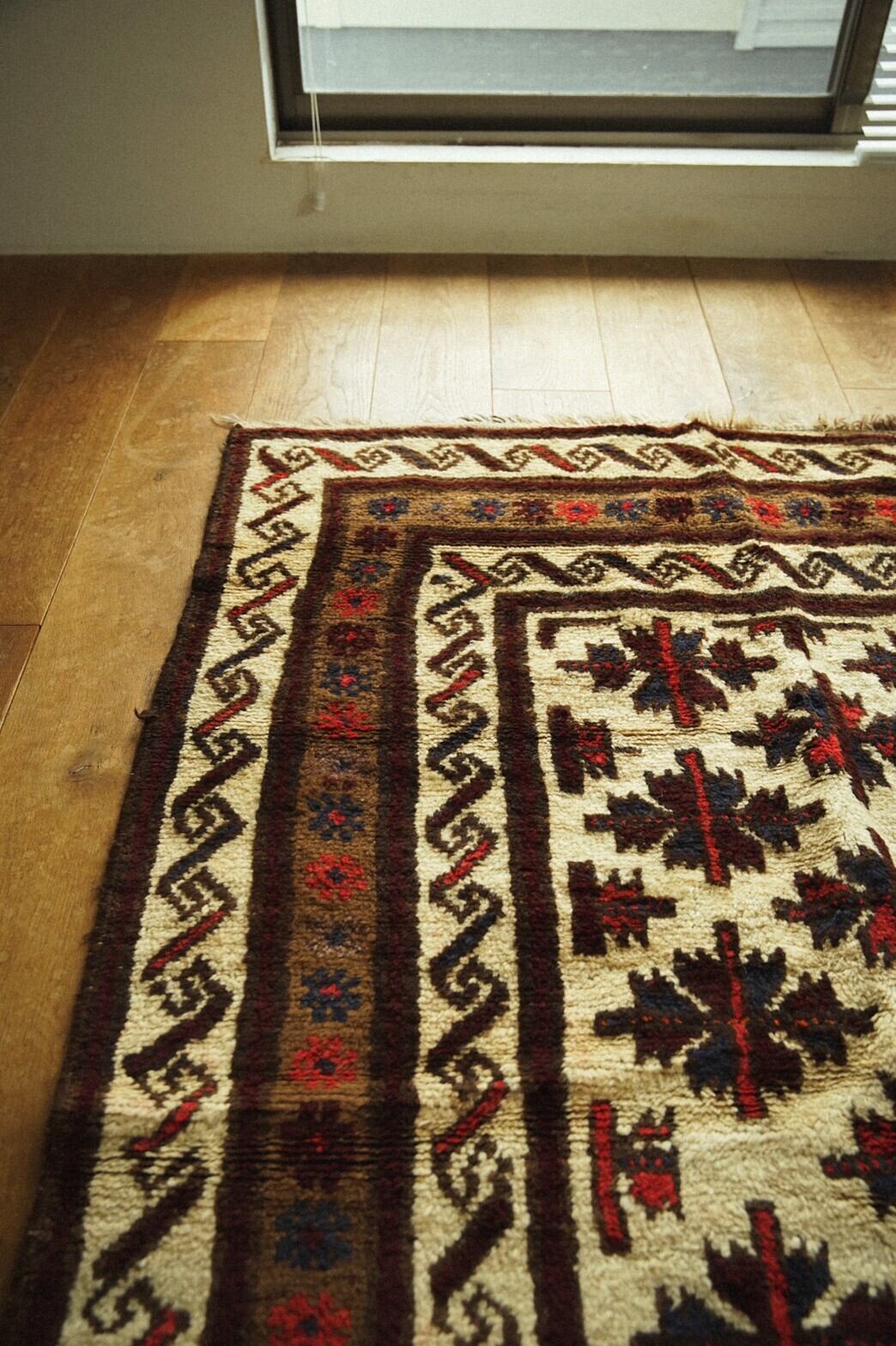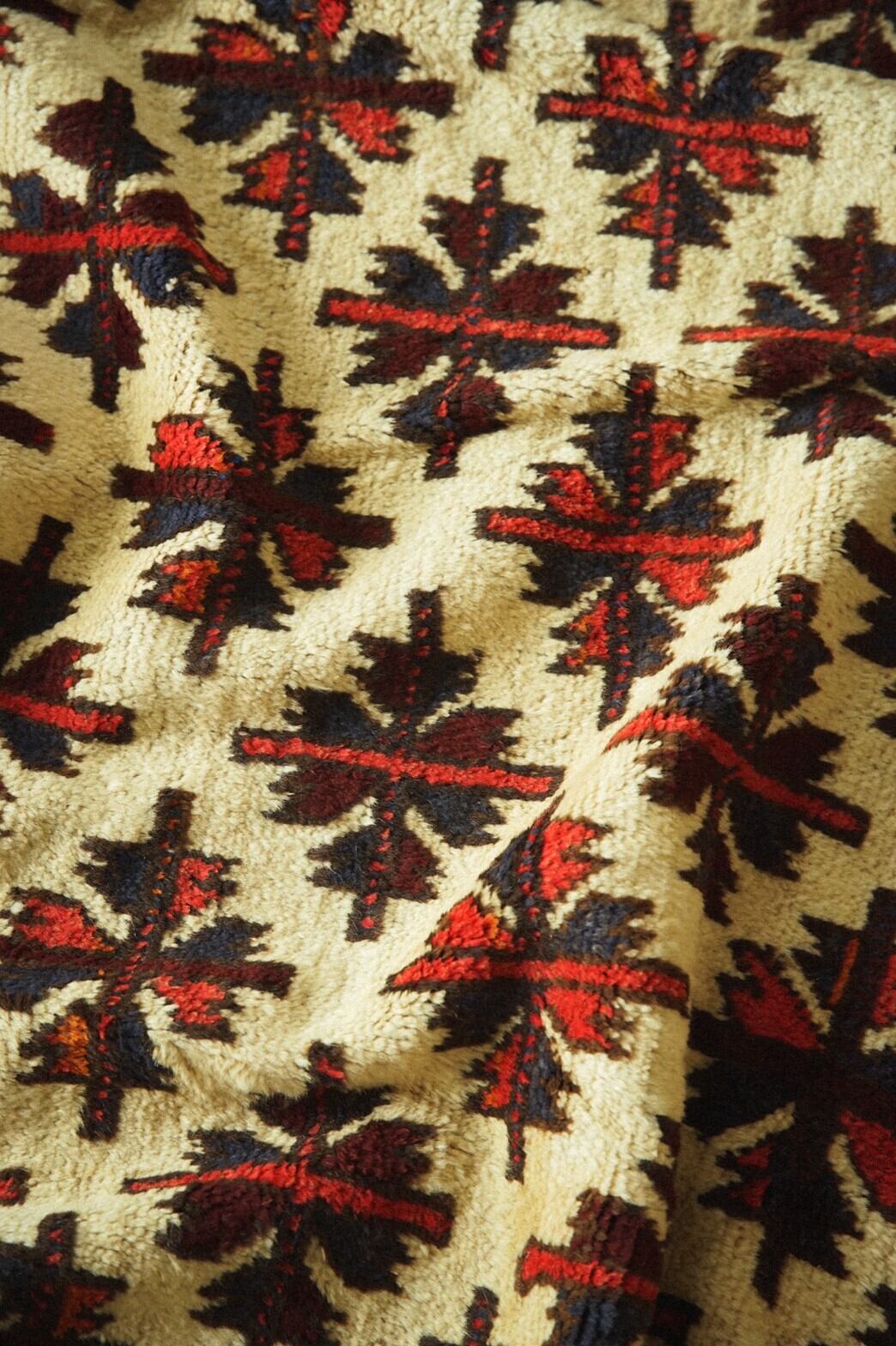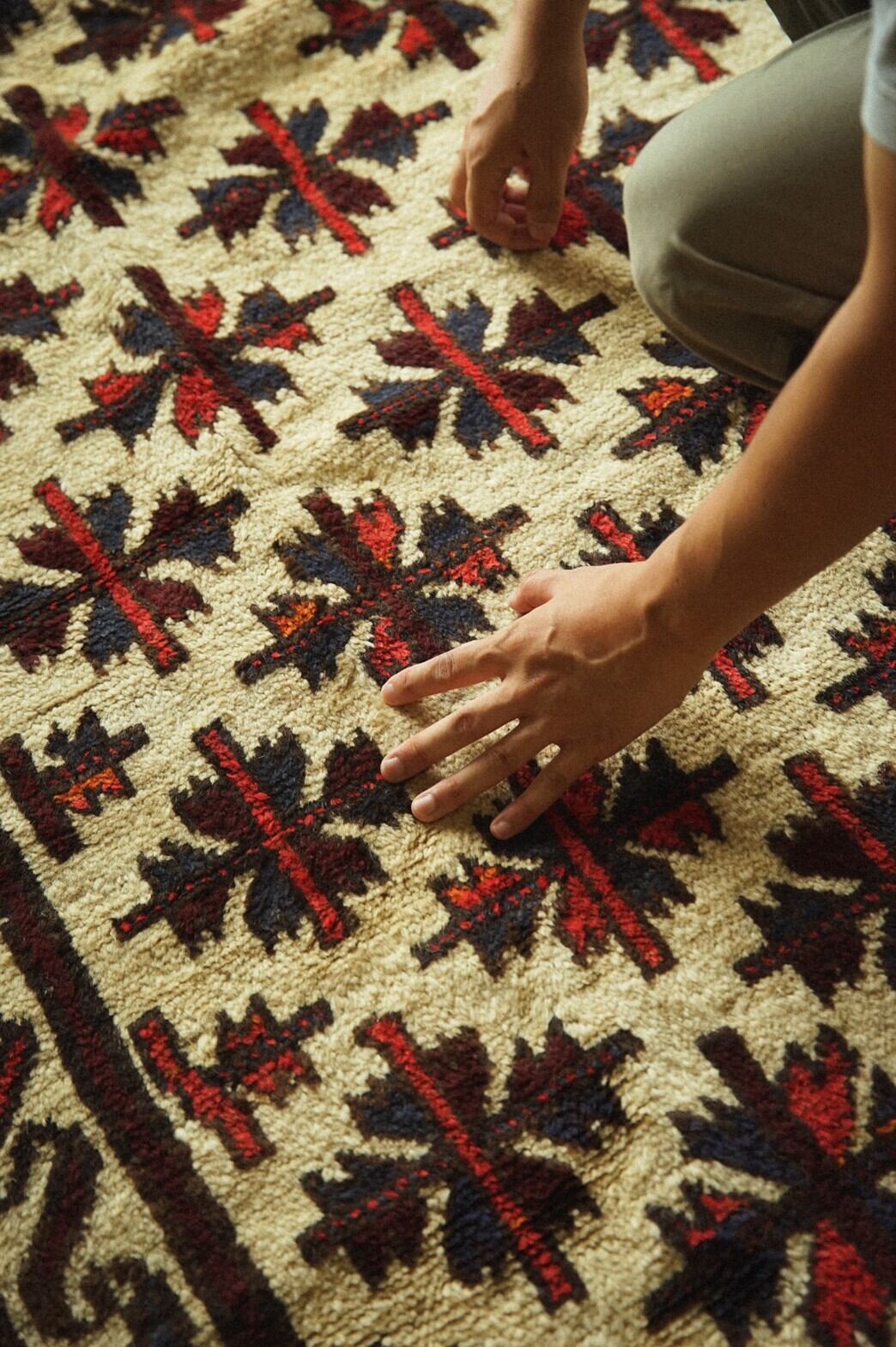 アイボリーのフィールドに赤と青のチナール柄がたくさん並ぶ素朴でナチュラルな雰囲気が魅力のタイマニラグ。ボーダー部分には魔よけのフックモチーフとかわいらしい小花柄が並びます。すっきりとしたデザインのラグなのでシンプルインテリアやナチュラルインテリア、またラグ初心者の方にも取り入れやすいかと思います。パイルはタイマニ族の特徴でもある少し長めでフカフカ感のある柔らかく良質なウールで織られています。ダメージや補修跡もなく70年前のものとは思えない程グッドコンディション。リビングやダイニングテーブルの下、書斎やソファ前に敷くのがおすすめです。