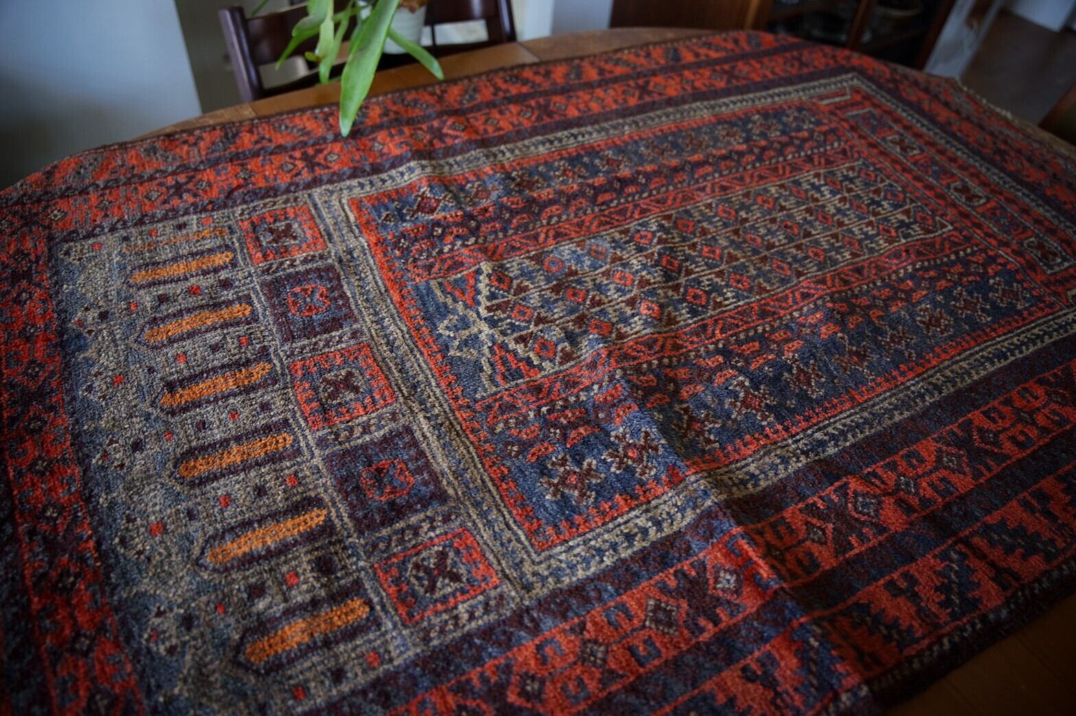 アフガニスタンのヘラート地方で作られたバルーチプレイヤーラグ。落ち着いたトーンの赤、グレー、ブルーを基調とした配色が渋くてかっこいいです。艶があり自然光に当てると輝きを増した雰囲気が神々しいです。また、しっとりと滑らかで柔らかい良質のウールを使用しており触り心地もとても気持ちいいですよ。ダメージや補修跡もなくグッドコンディション。一人掛けソファの前や玄関やキッチンに敷いたり、ベッドサイド、姿見の前にオススメの使いやすいサイズです。