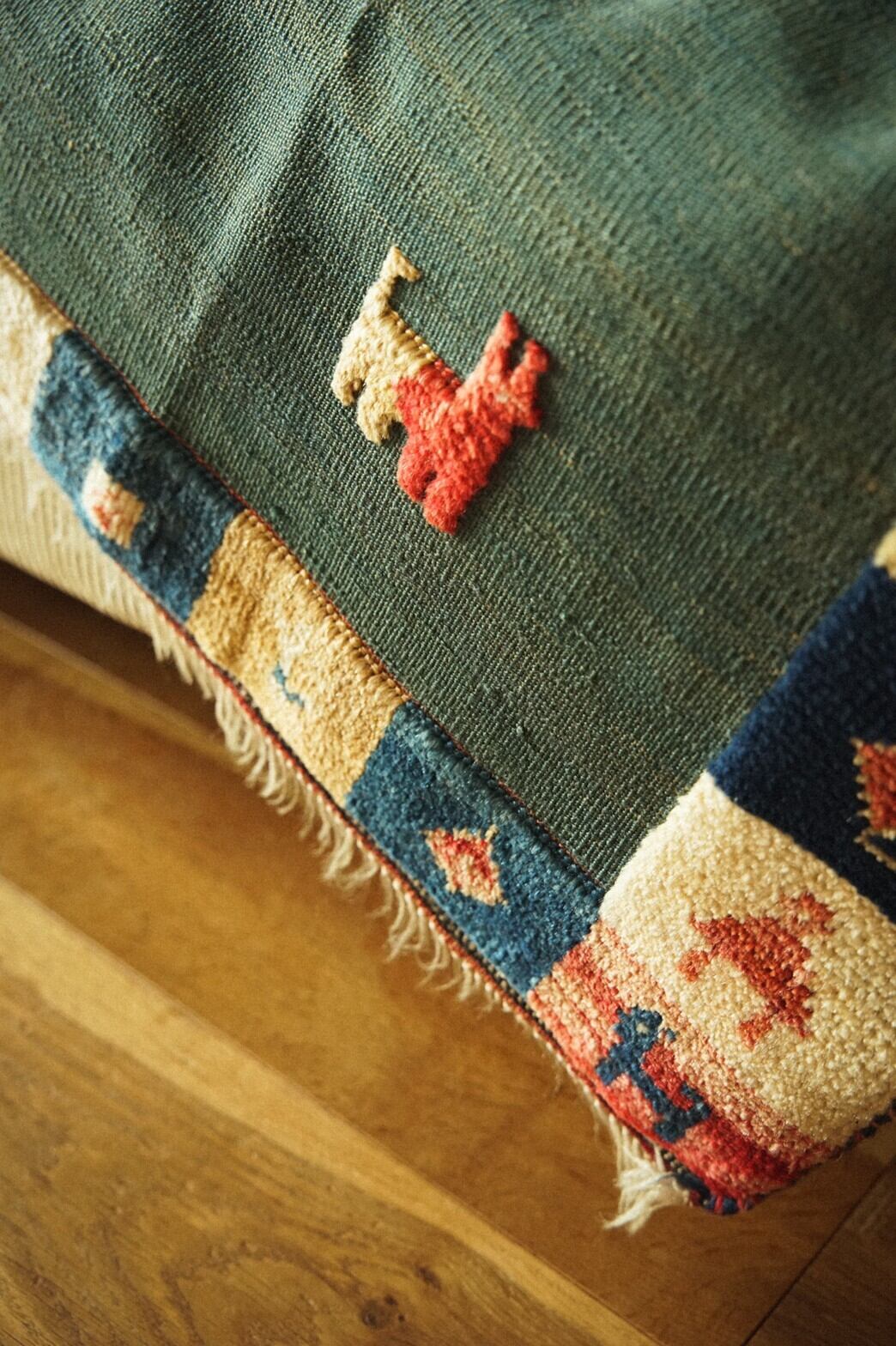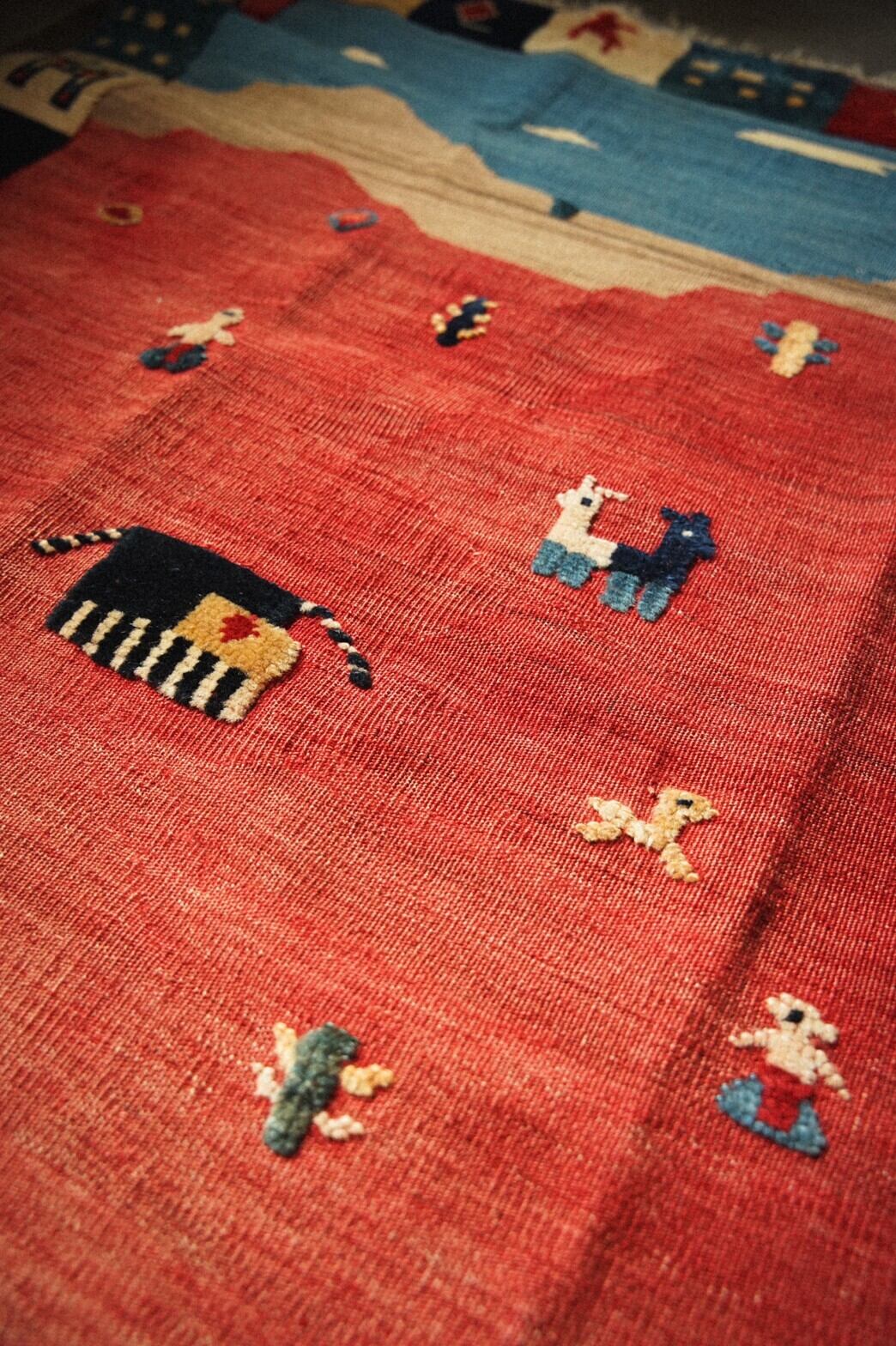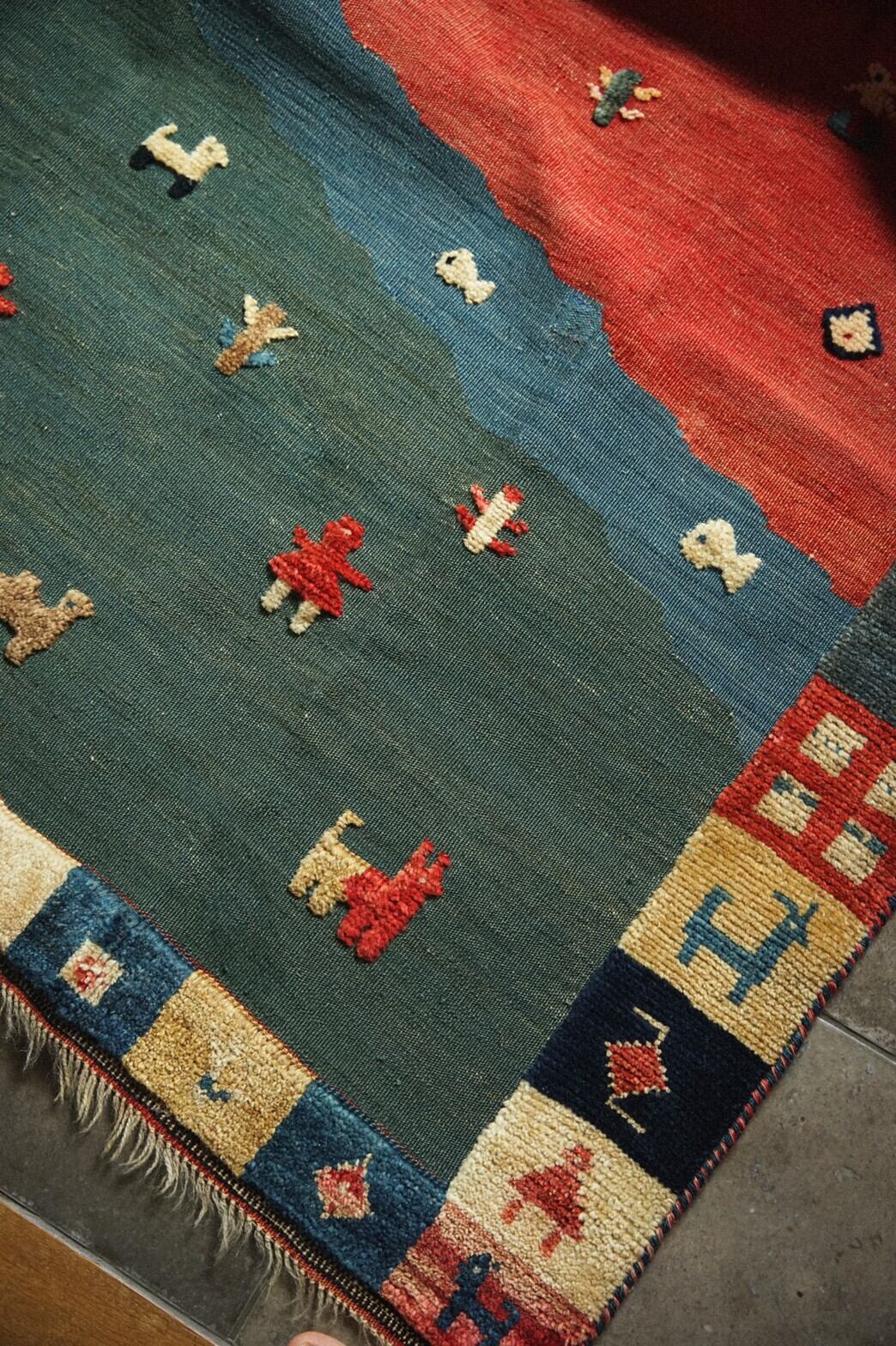 カシュガイ族によるキリムラグ。ベースはキリムで人や動物、ボーダー部分はパイルがありポコポコと立体的なのがとてもかわいらしいラグです。ラグに描かれているのは遊牧民の素朴な暮らし。のんびりとした牧歌的な雰囲気が見ているだけで幸せな気持ちになれますね♪夏の草原のグリーンがさわやかな色合いもとても魅力的です。ダメージや補修跡もなくグッドコンディション。玄関やキッチン、リビングに敷いたり、ベッドサイド、姿見の前にオススメの使いやすいサイズです。