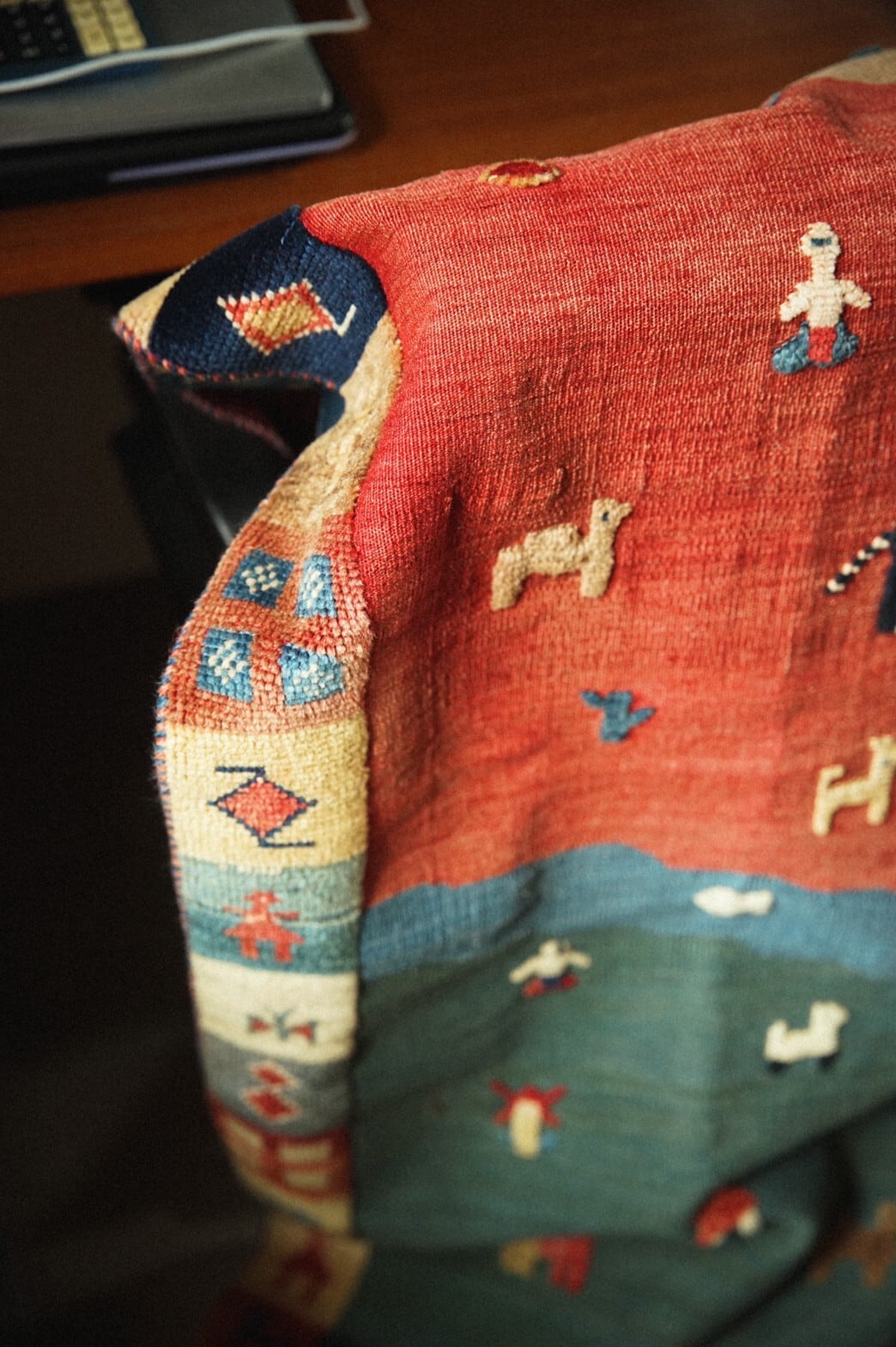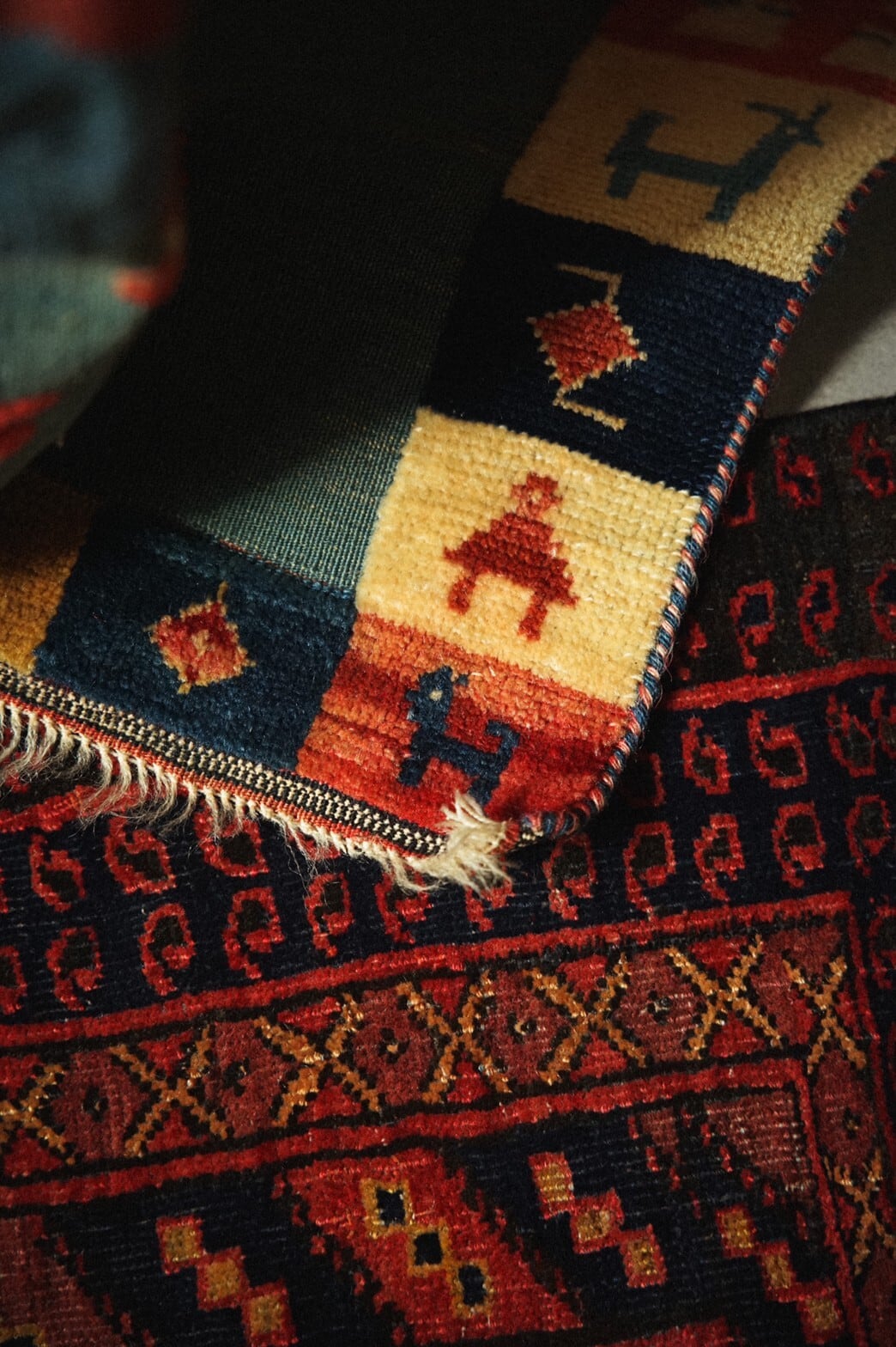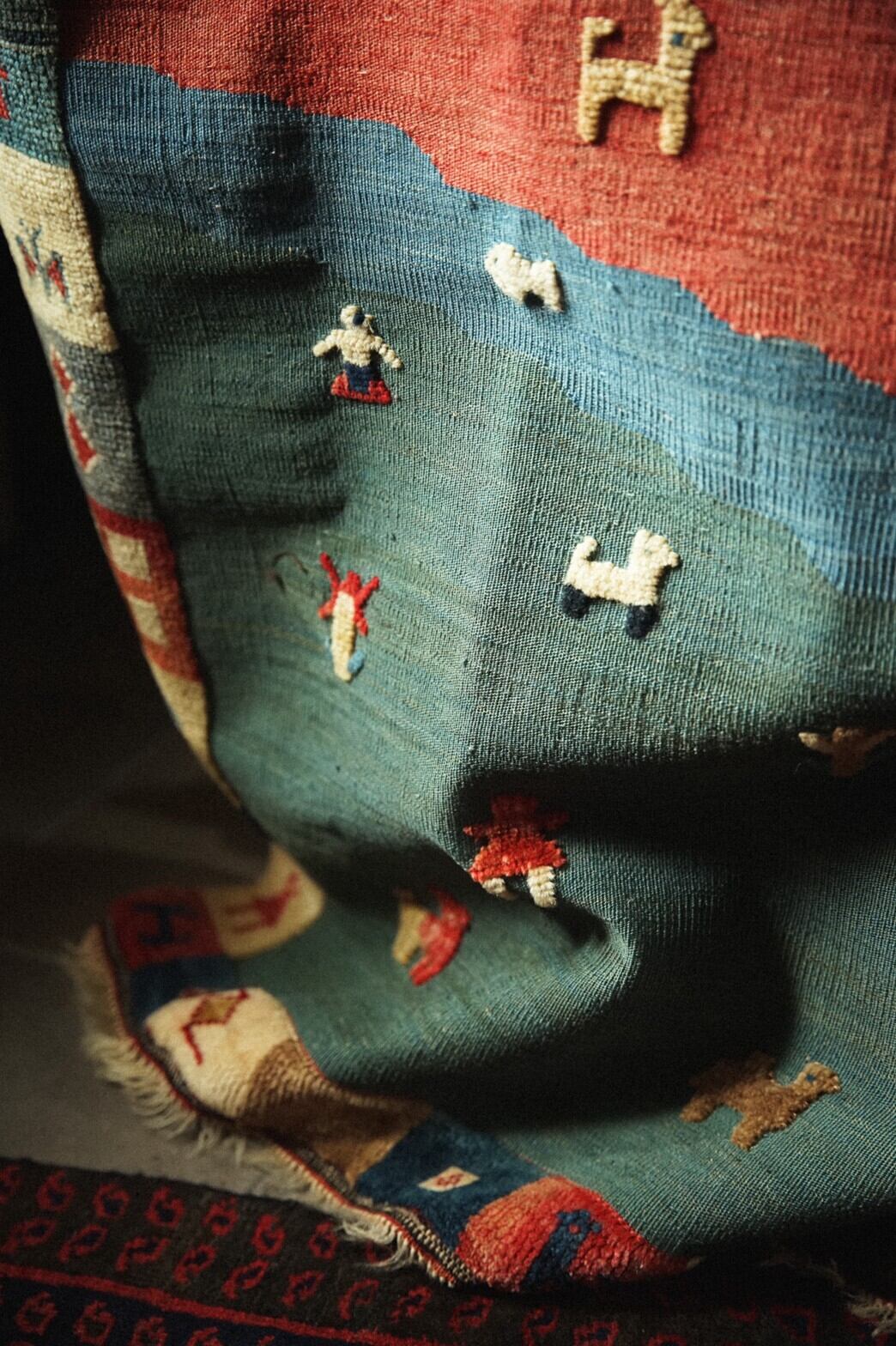 カシュガイ族によるキリムラグ。ベースはキリムで人や動物、ボーダー部分はパイルがありポコポコと立体的なのがとてもかわいらしいラグです。ラグに描かれているのは遊牧民の素朴な暮らし。のんびりとした牧歌的な雰囲気が見ているだけで幸せな気持ちになれますね♪夏の草原のグリーンがさわやかな色合いもとても魅力的です。ダメージや補修跡もなくグッドコンディション。玄関やキッチン、リビングに敷いたり、ベッドサイド、姿見の前にオススメの使いやすいサイズです。