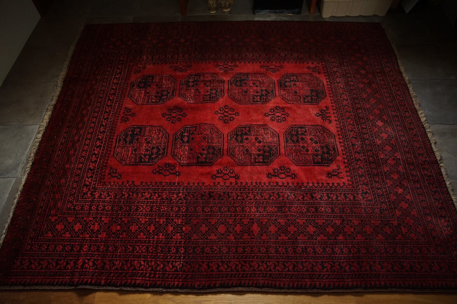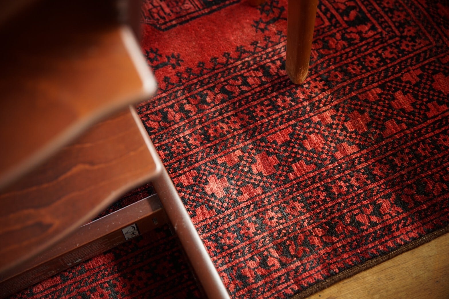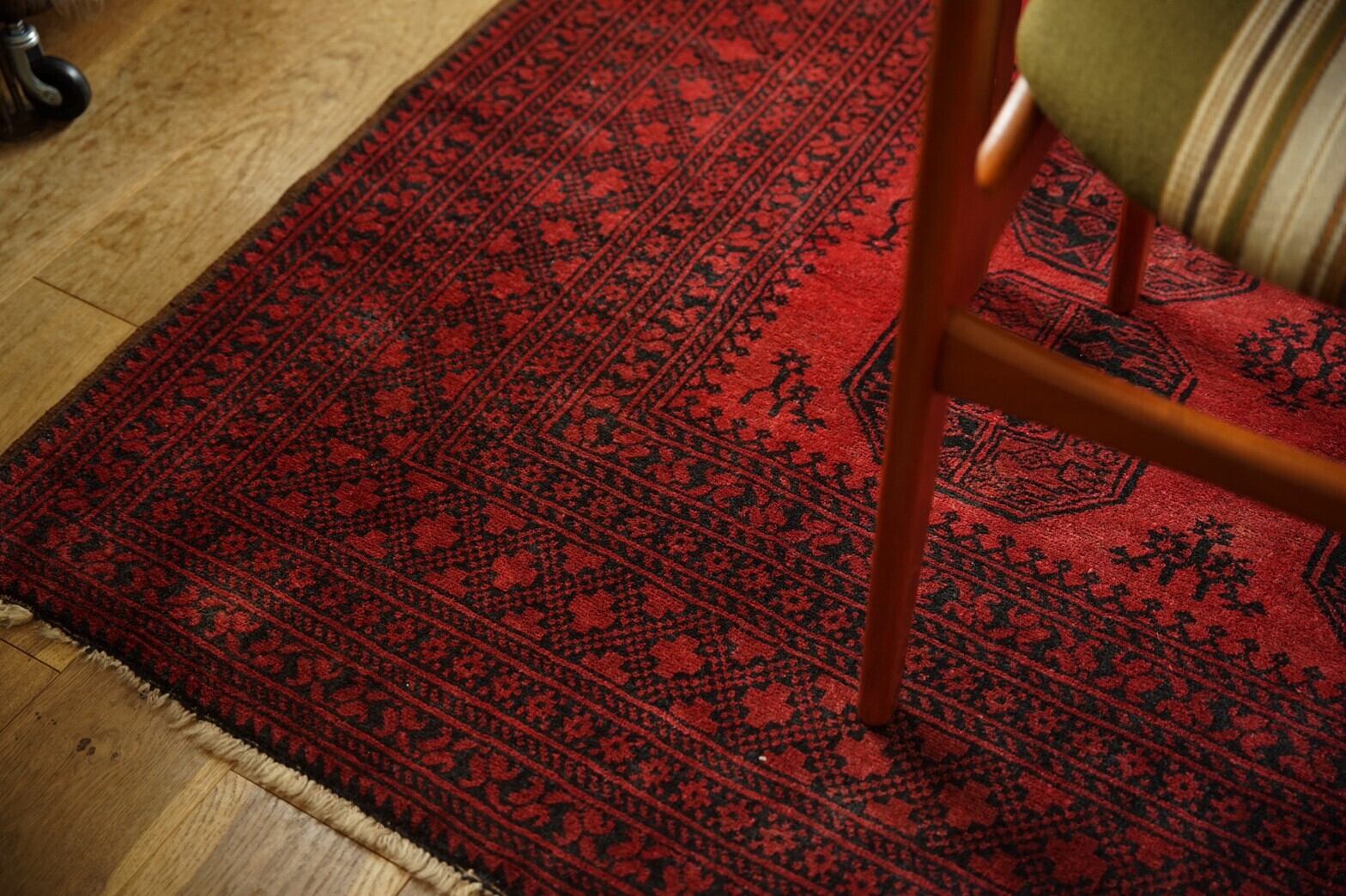 深くて美しい赤が見るだけで心を鷲掴みにされる魅力があるトルクメンラグ。シンプルな色使いだからこそデザインのかっこよさが引き立てられています。艶もあり存在感のある赤いラグは見るだけでパワーをもらえます。ギュッと目の詰まった織りはこの後何十年とまだまだ現役で使える丈夫な作りで重量感もあります。ダメージもほぼなく触り心地はすべすべと気持ちよく、ぜひ素足でも乗って欲しいです。リビングやソファの前、ベッドサイド、植物のある窓辺やベランダの前に置いてみてはいかがでしょうか?