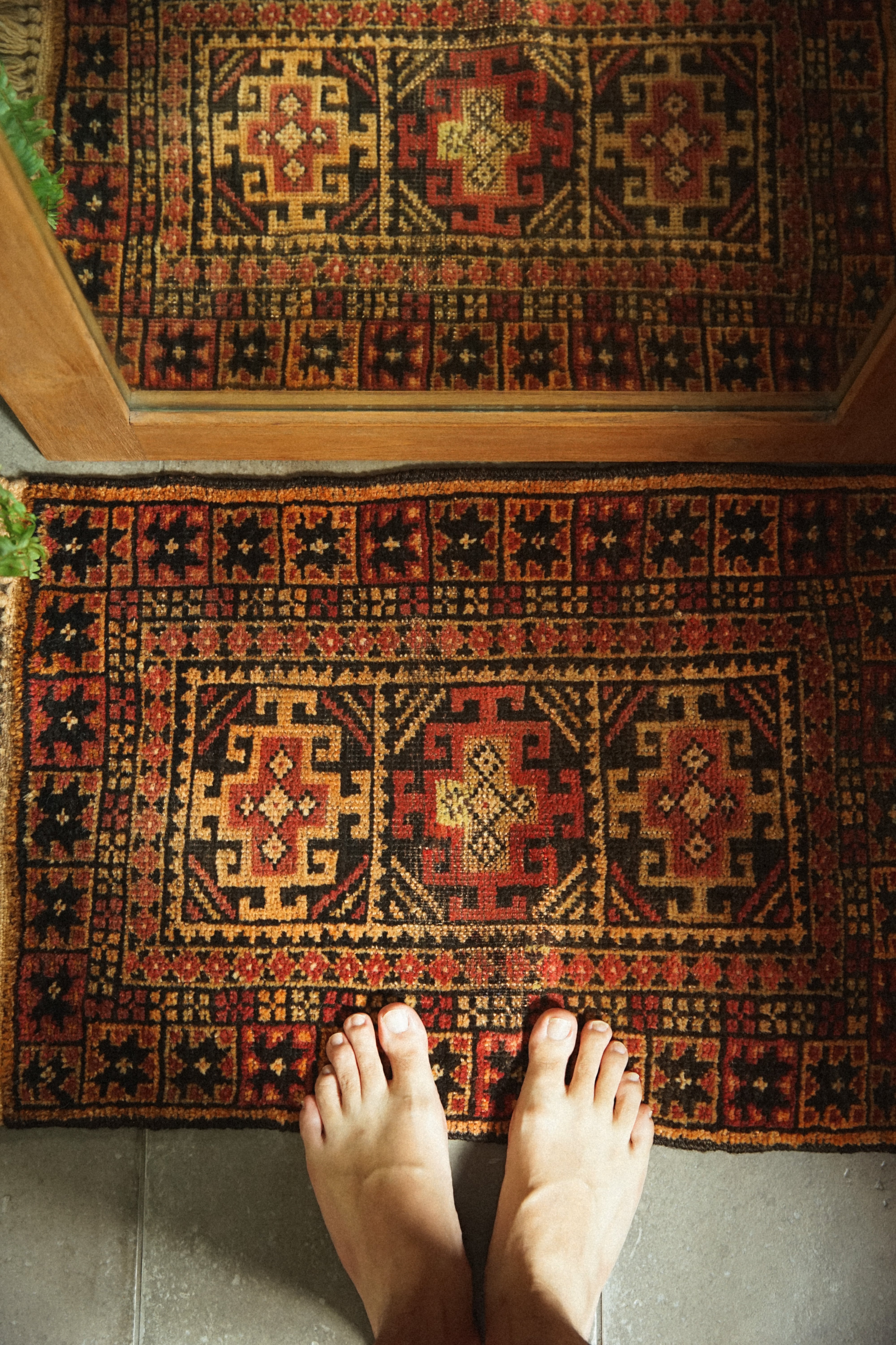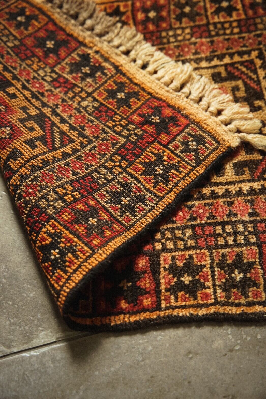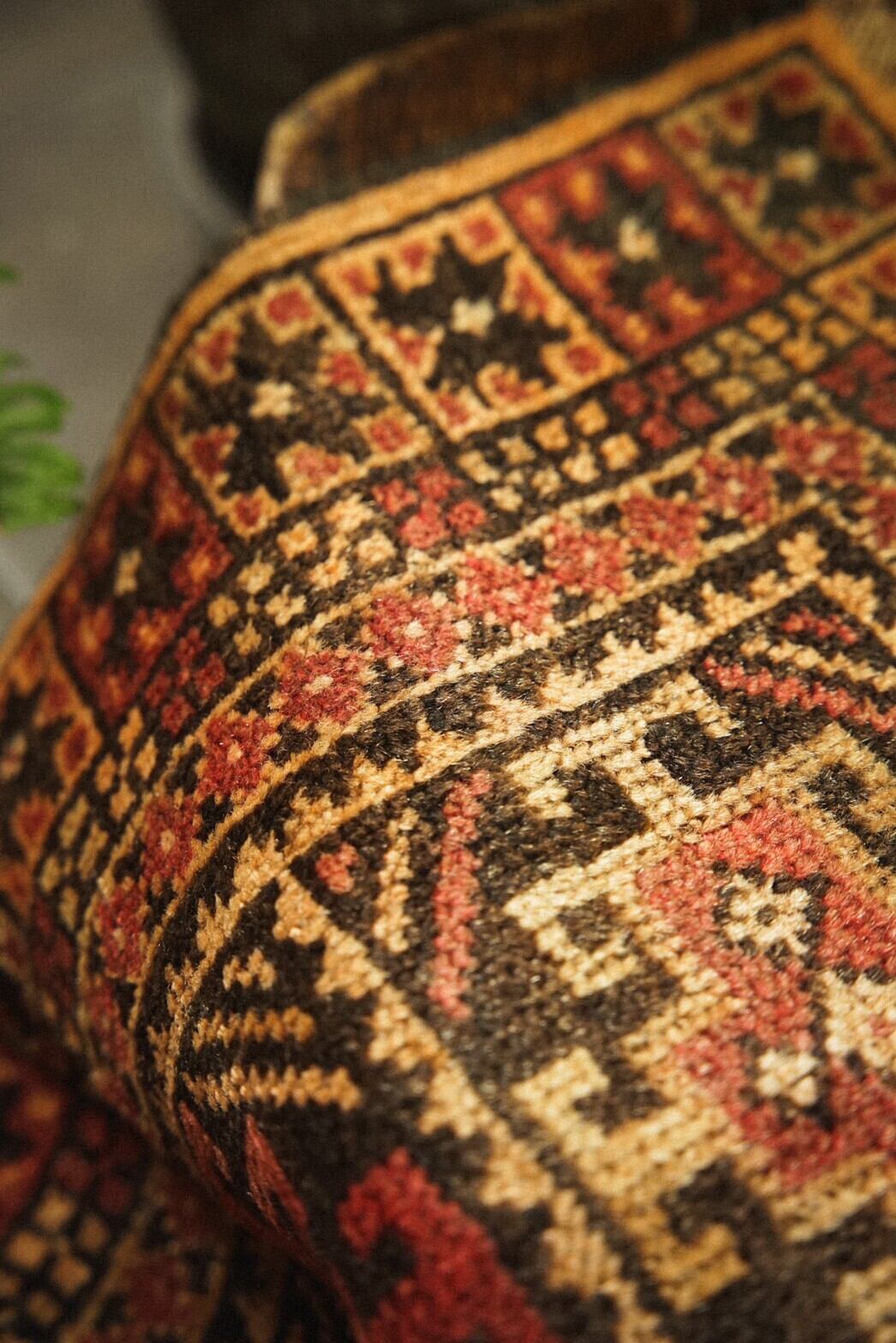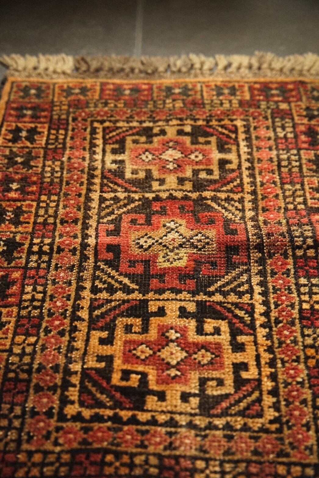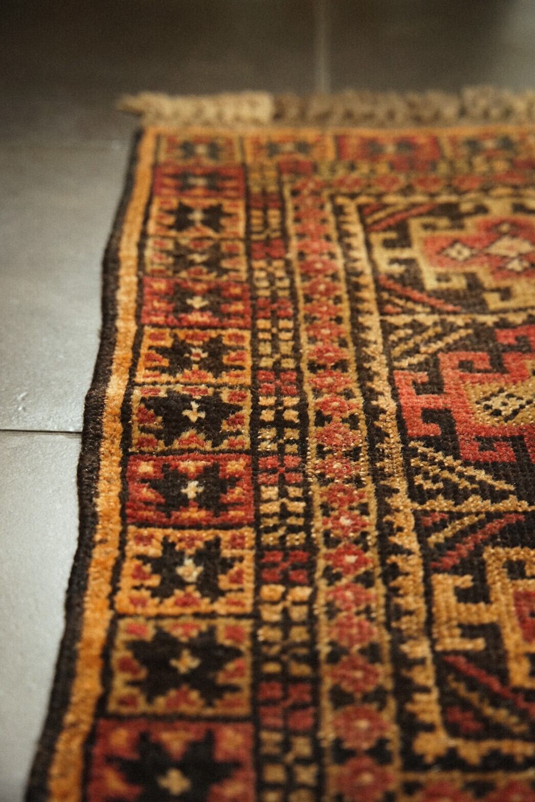 ブラウン~テラコッタ~オレンジなど暖色系でまとめられた落ち着いた色合いのアリホジャラグ。3つ並んだメムリンクギュルにボーダー部分はアリホジャの特徴でもある細かい連続紋様がたくさん並びます。周りを囲む八角星がとてもかっこいいです。真ん中のギュルに補修跡はありますがキレイにリペアされているので気にならないレベルです。パイルもきれいに残っておりすべすべと気持ちの良い手触り。窓辺やチェストの上、観葉植物の近くに敷いたり…ピクニックやキャンプなどのアウトドアに持ち出してのご使用もおすすめです
