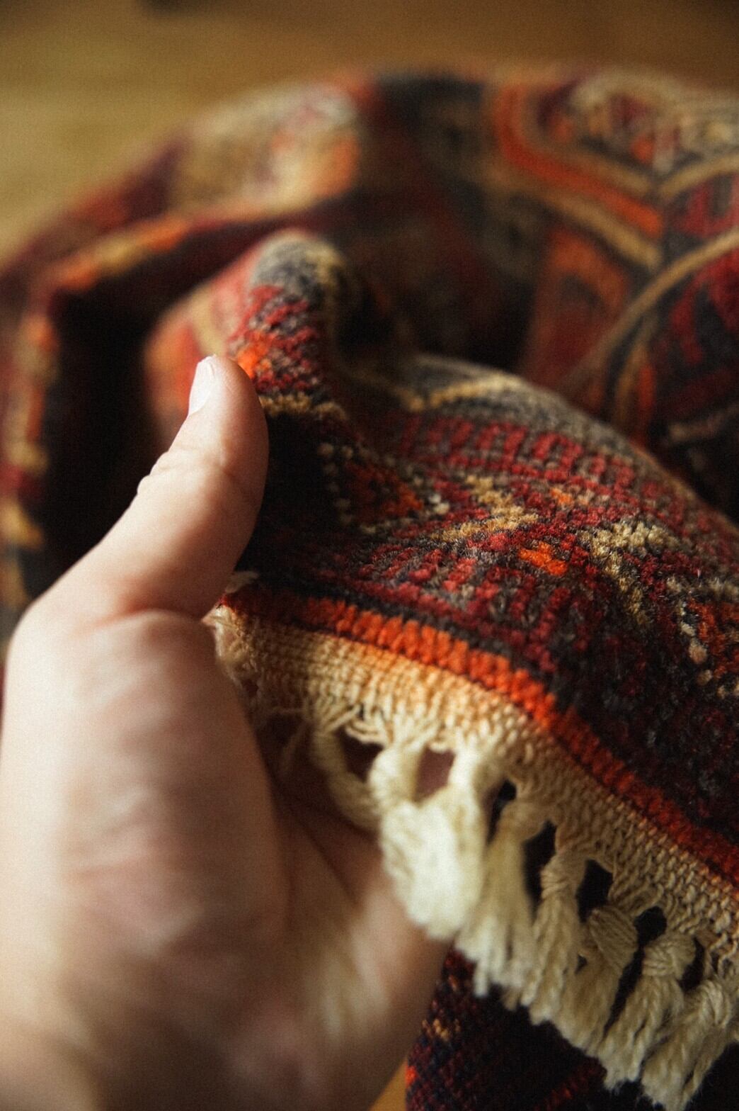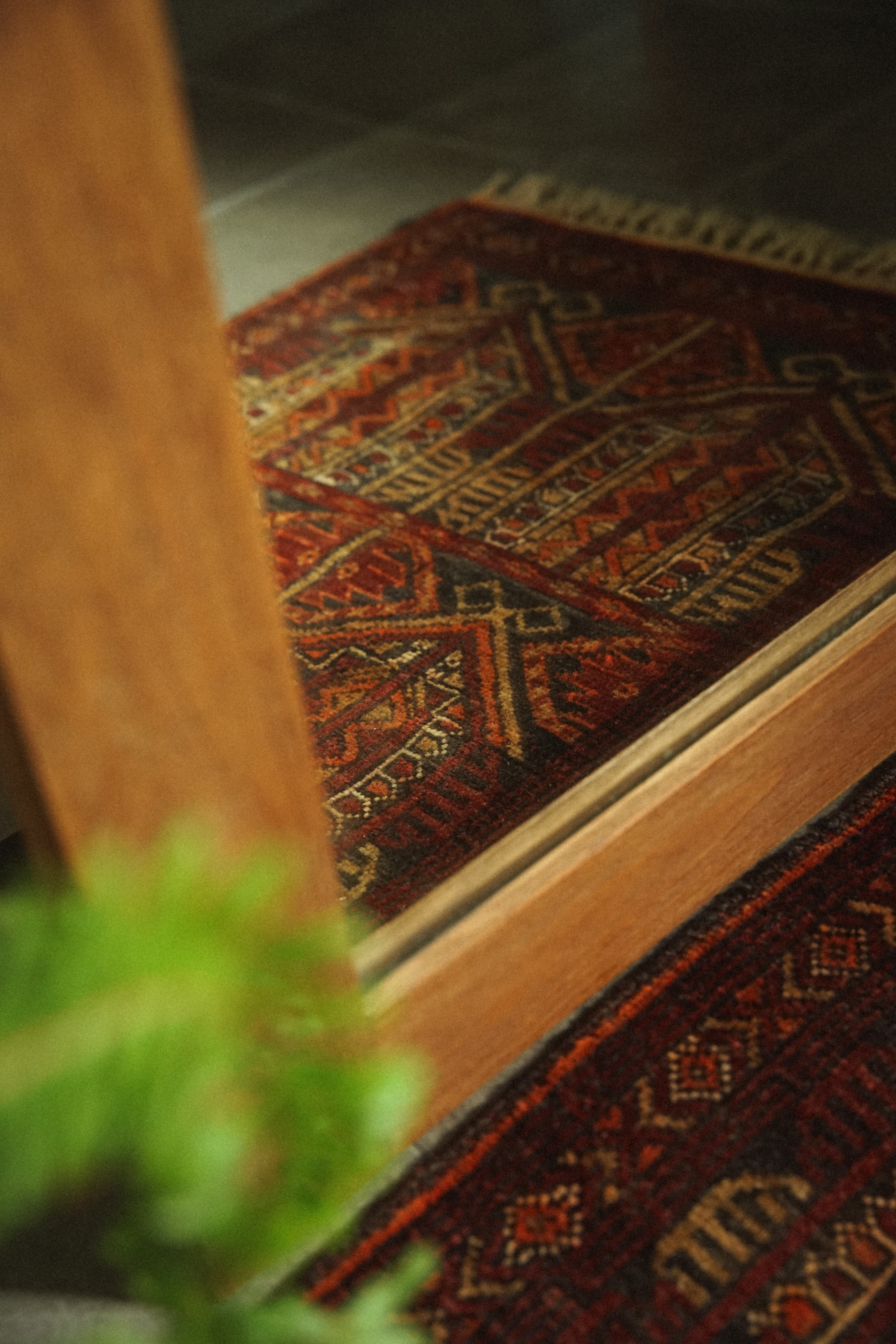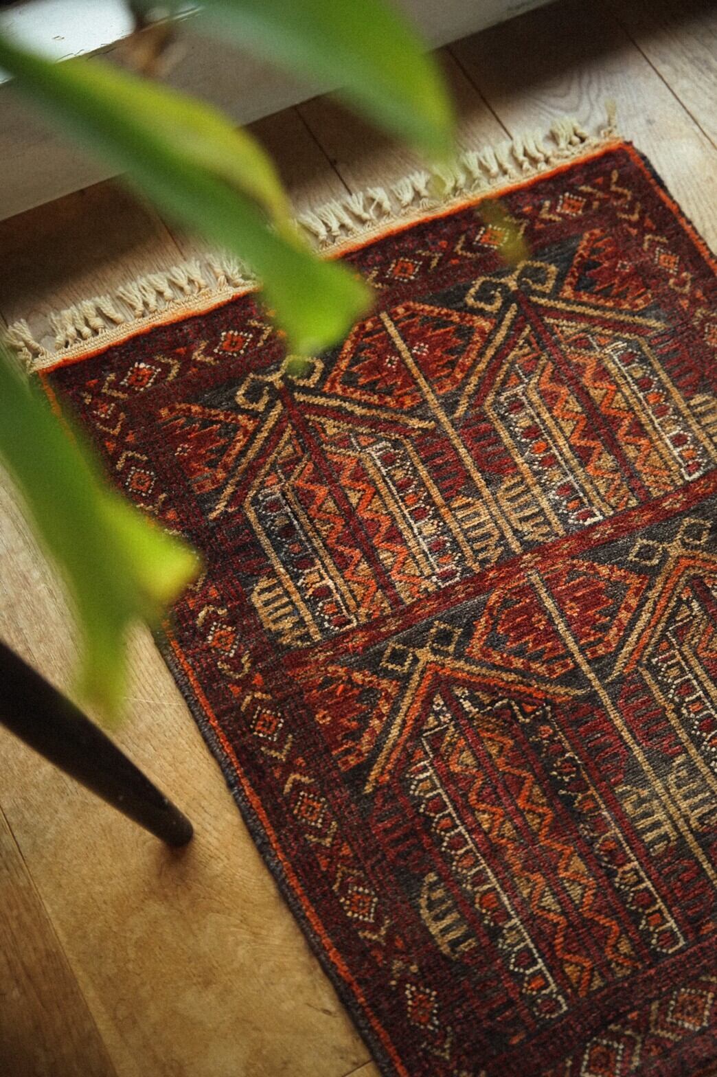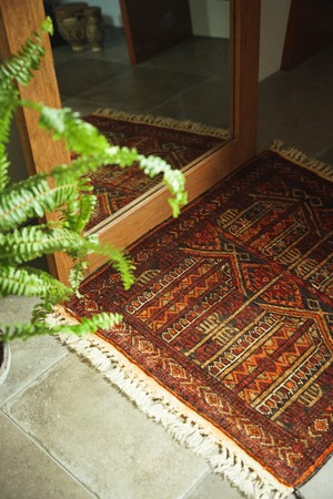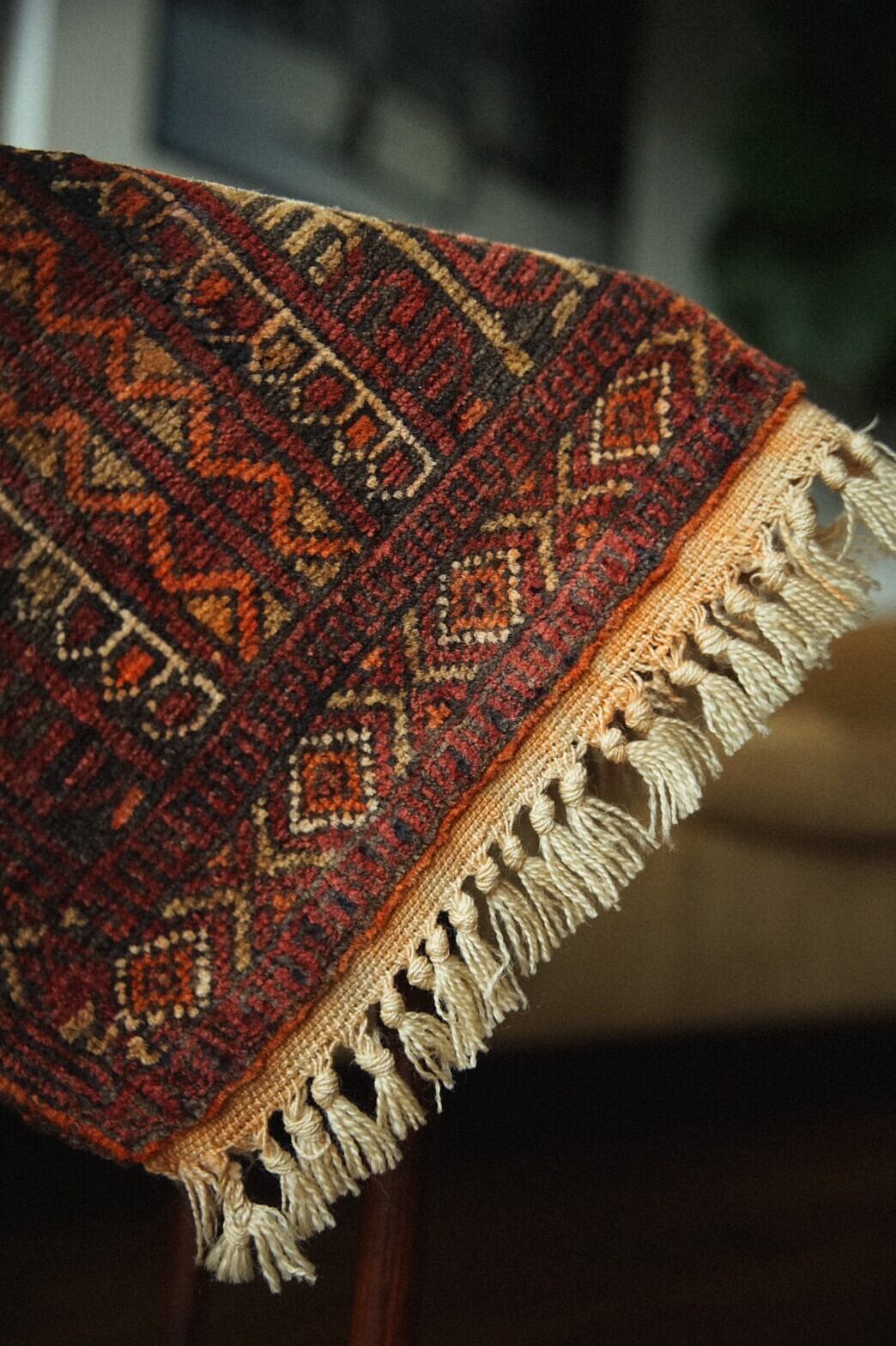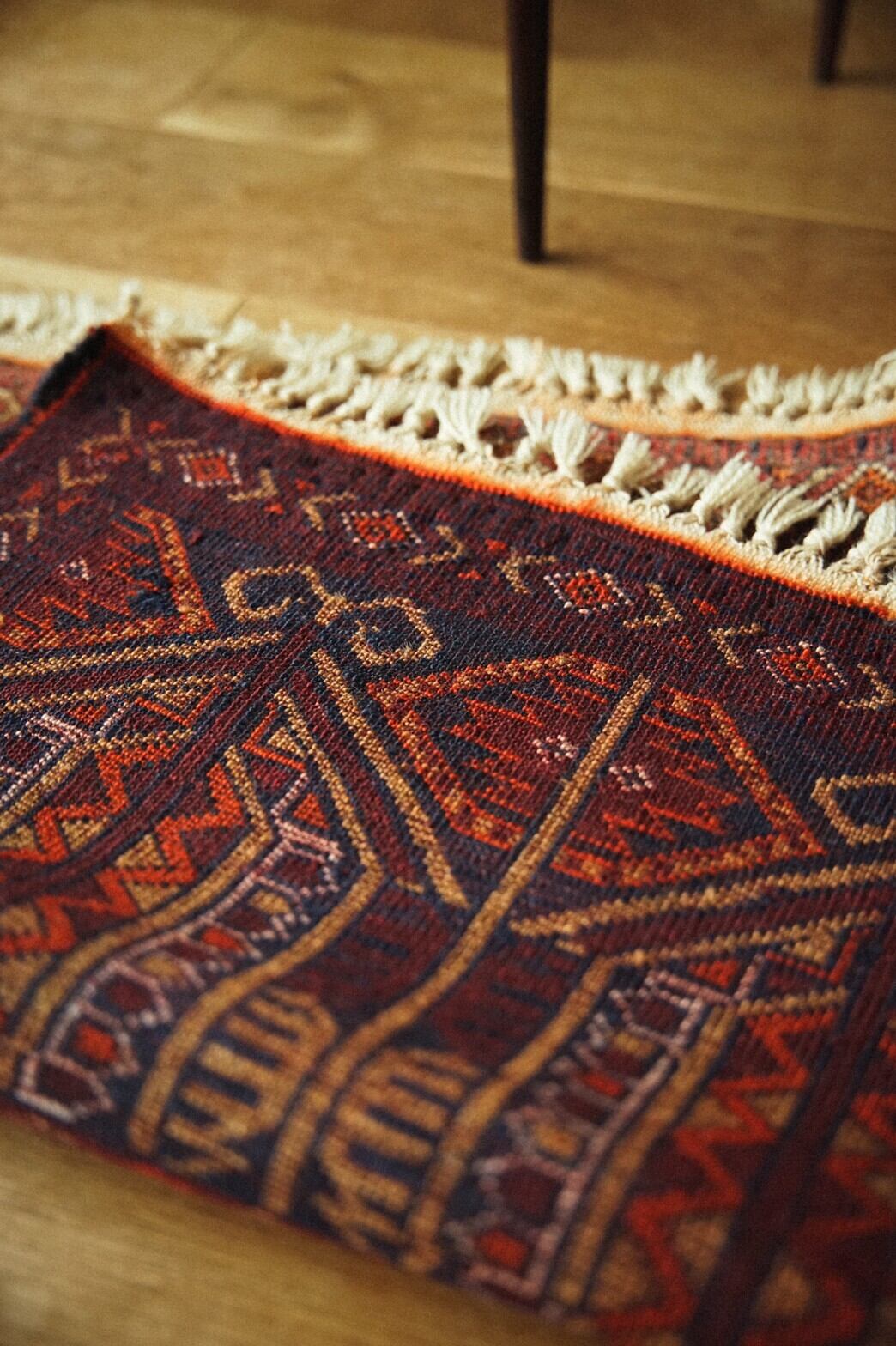 ミニサイズのアリホジャラグ。ブロケードと言われるレースのような細かい模様が描かれているのが特徴の美しいラグです。バーガンディー×ブラウン×オレンジベースの温かみのある色合いでまとめられています。パイルは短く薄手ですが、織りがしっかりしていて目が細かく触るとしっとり滑らかですべすべ。ダメージもなくコンディションは良好。窓辺や、チェストの上、植物を置いたり姿見の前に敷いたりするのがおすすめです。