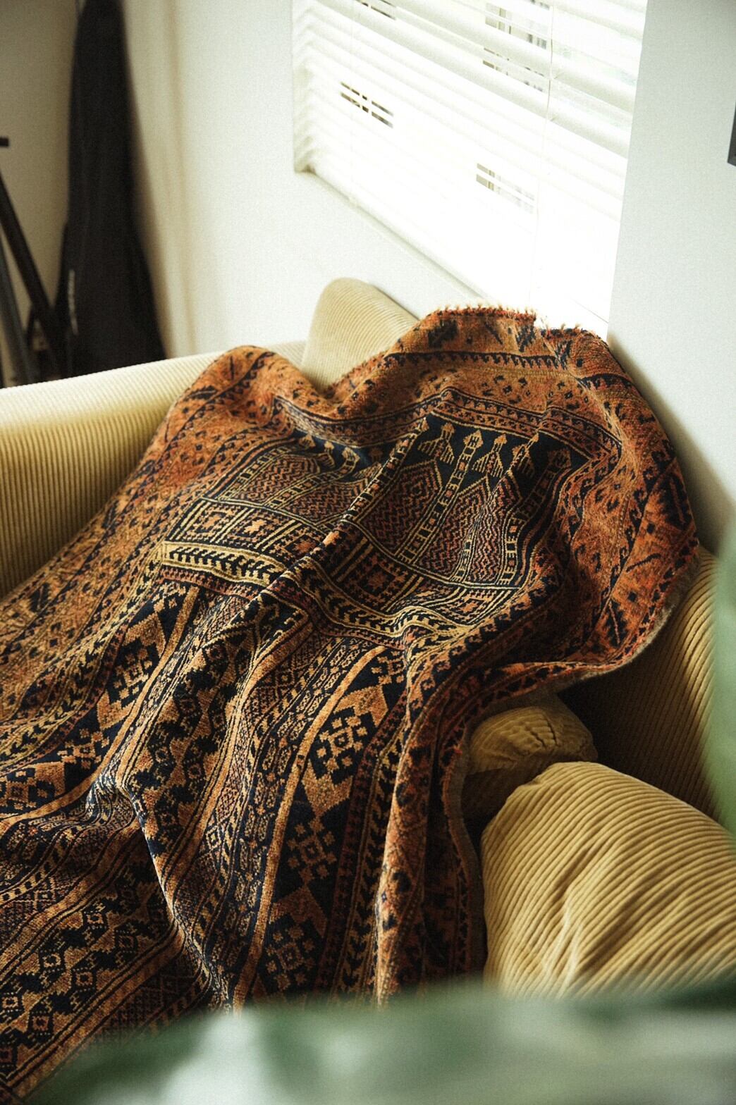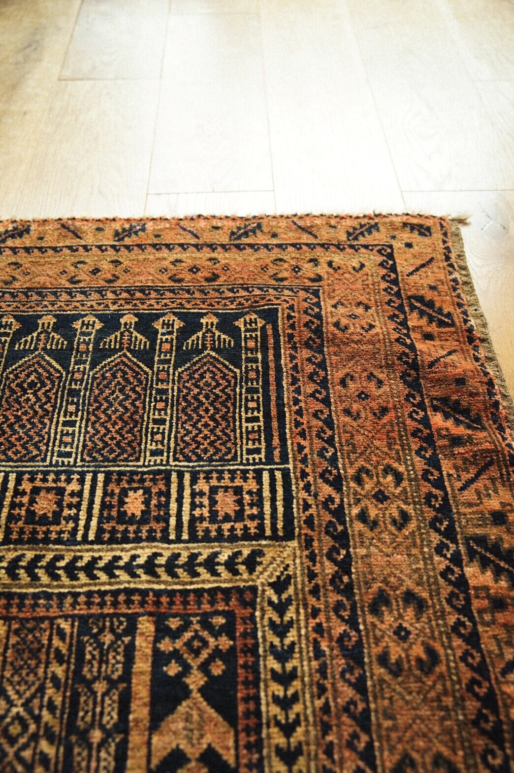 色合いも手触りもとても柔らかなアリホジャラグ。経年変化によりテラコッタ色に褪色したラグは優しい雰囲気です。黒く見える部分は光に当てて見ると深いネイビーです。艶のある上質なウールで織られたラグはずっと撫でていたくなるようなすべすべと滑らかな手触り。少しパイル抜けしている部分はありますが、見た目にも使用にも問題はないレベルで、コンディションはとても良好。一人掛けソファの前や玄関やキッチンに敷いたり、ベッドサイド、姿見の前にオススメの使いやすいサイズです。
