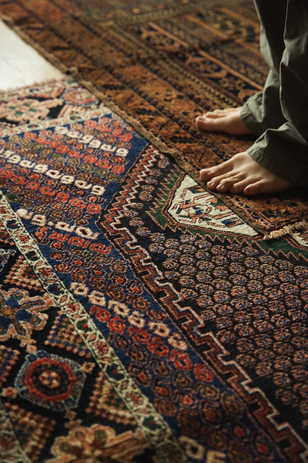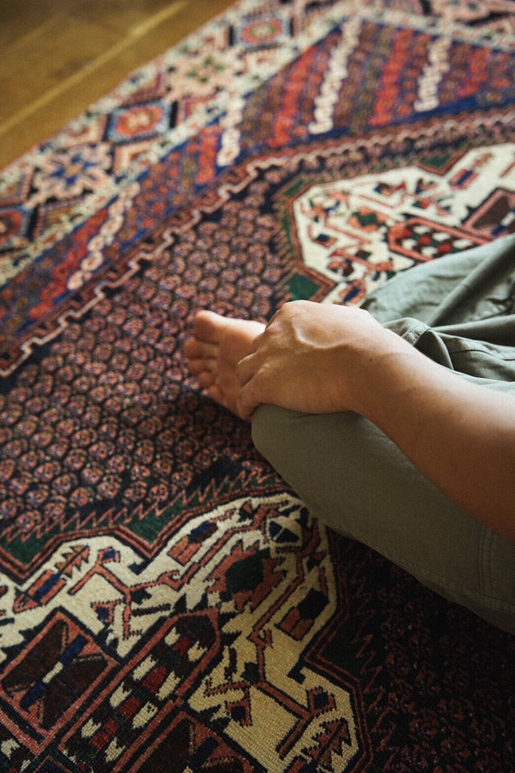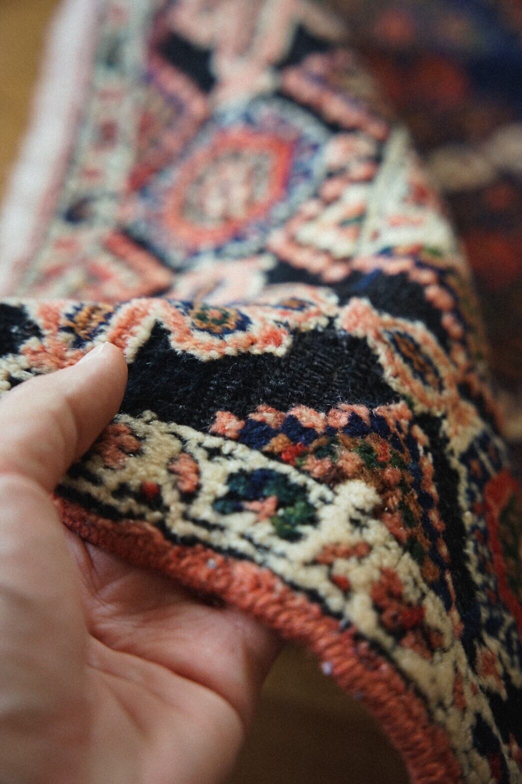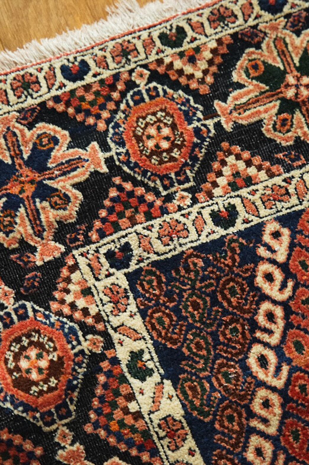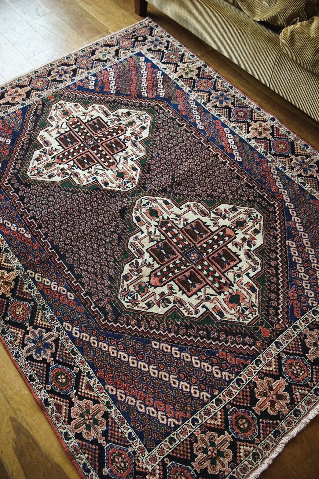 どこを切り取っても美しいアートのようなアフシャルラグ。店主が一番惹かれたのは色使い。ブルーとグリーンにサーモンピンクの組み合わせ。たくさんの色を使って描かれているのにうるさく感じないのはきっと色彩感覚に長けたセンスの良い織り手だったんだろうなぁと想像が付きます。ボーダー部分の花柄もとても美しいです。経年変化による擦れがパイルの低い部分がありますが、むしろそのおかげでラグに立体感が生まれています。補修跡が一箇所ありますが、きれいにリペアされており気にならないレベルです。リビングやダイニングテーブルの下、チェストの下、書斎やソファ前に敷くのがおすすめです。