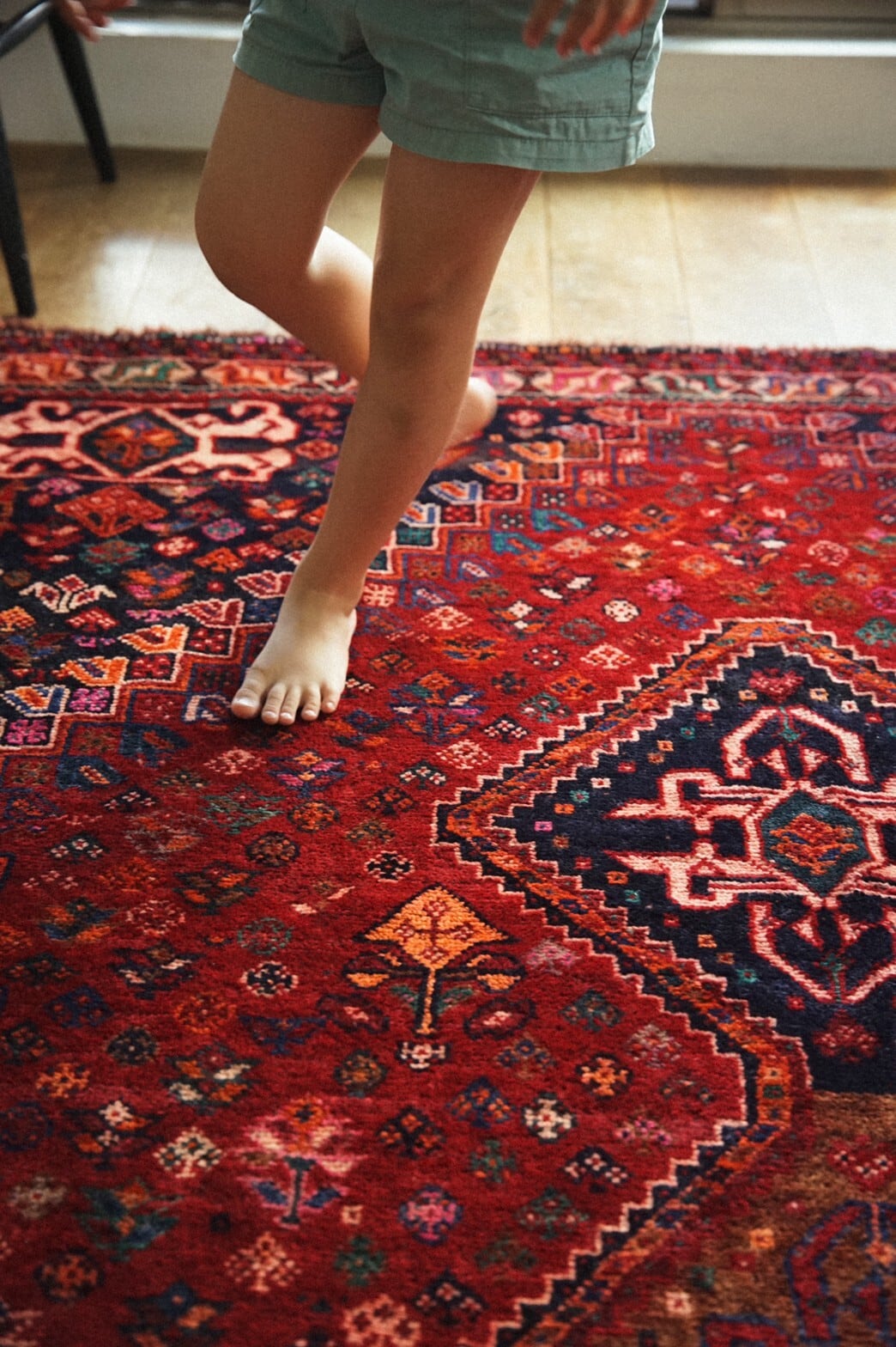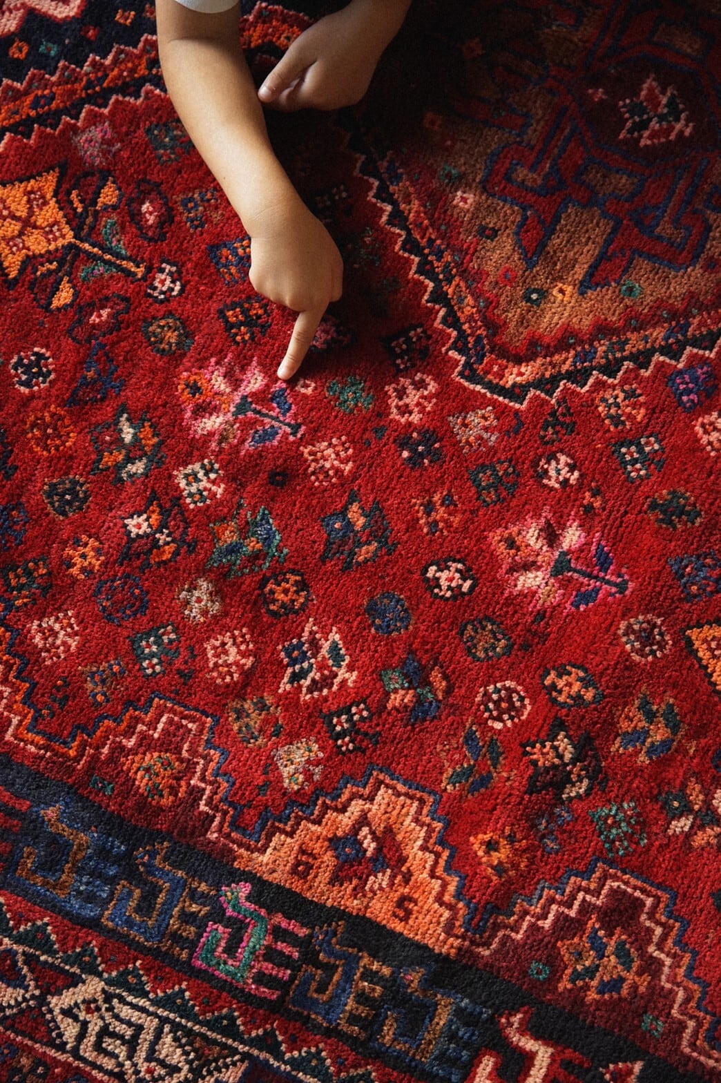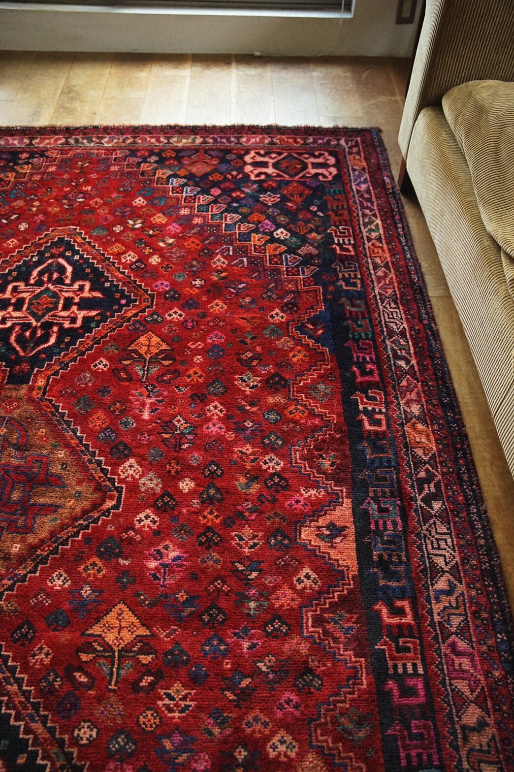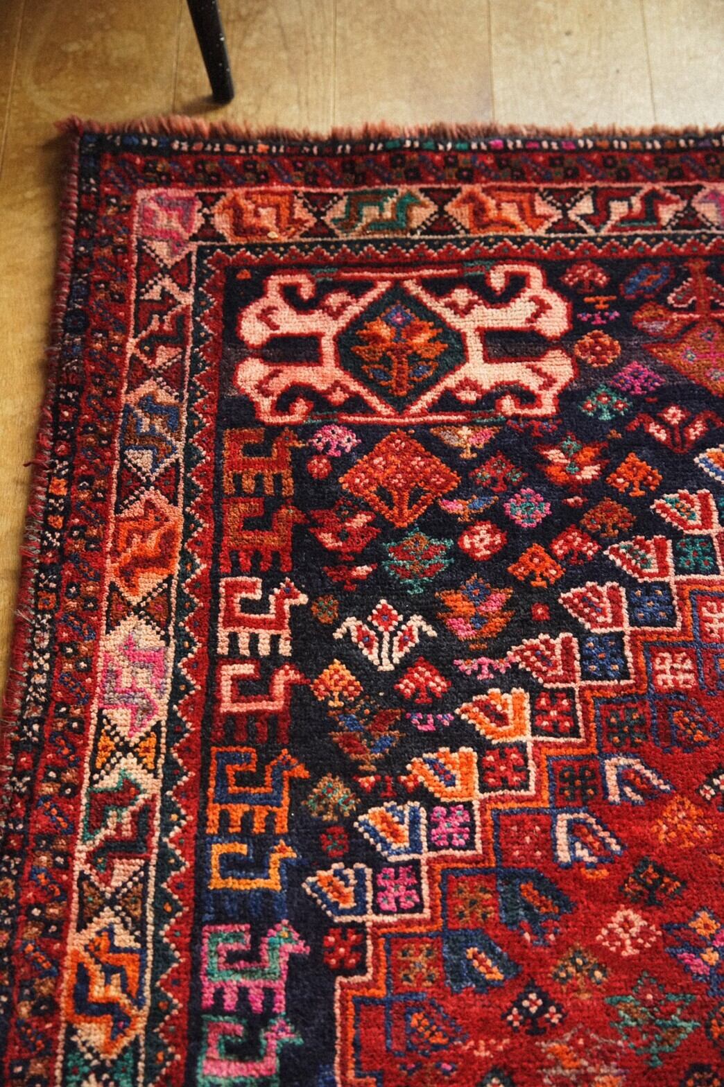 カラフルで華やかな雰囲気の赤系のカシュガイラグ。隅から隅までびっしりと多彩な紋様が描かれておりずっと眺めていたくなるようなラグです。ボーダー部分にはカラフルな動物がたくさんお行儀よく並んでいる様子がとてもかわいいですね♪目立ったダメージは無く、パイルもきれいに残っているのでフカフカで思わずゴロンと寝転がりたくなりますよ。リビングに敷いたり、ダイニングテーブルの下、書斎やソファ前におすすめのサイズ。見ているだけでワクワクするようなラグは子供部屋にもぜひ♪