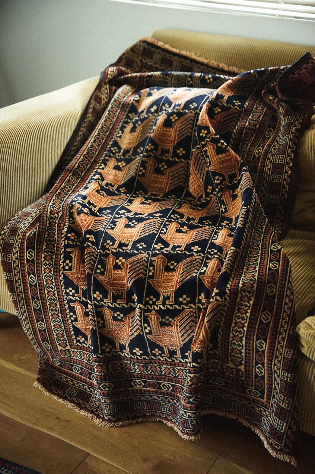フィールドに鳥がたくさん並ぶアリホジャラグ。ブラウン、テラコッタ、ネイビーの落ち着いたトーンでまとめられており、シックでありながらもたくさんの鳥が羽を広げている様子が描かれている華やかなラグです。一番上の鳥4羽だけ色が違うのも面白いですね。ボーダー部分もアリホジャデザインによく見られるブロケードと呼ばれる細かいレース紋様もとても美しいです。うっとりするような柔らかで滑らかな手触りで、ダメージや補修跡もないパーフェクトコンディション。リビングや書斎に敷いたり、ベッドサイド、姿見の前にオススメの使いやすいサイズです。