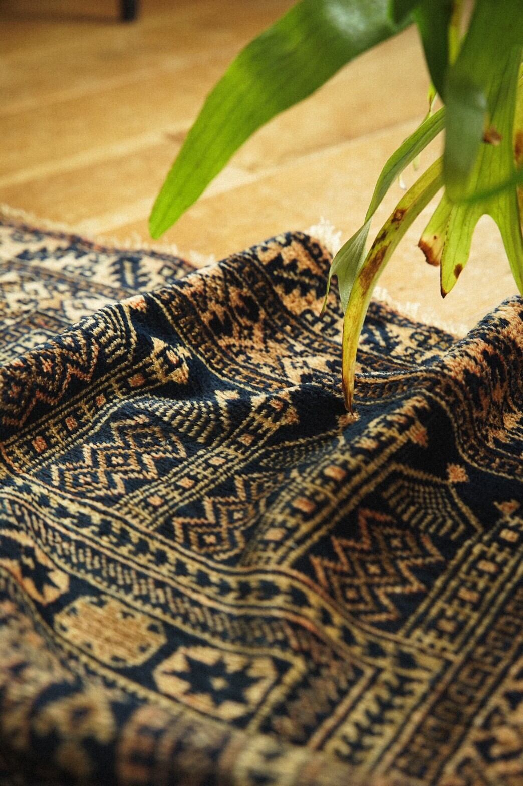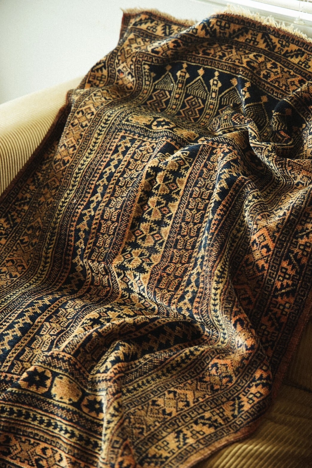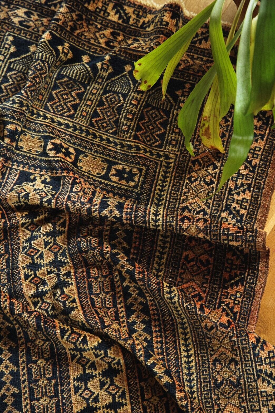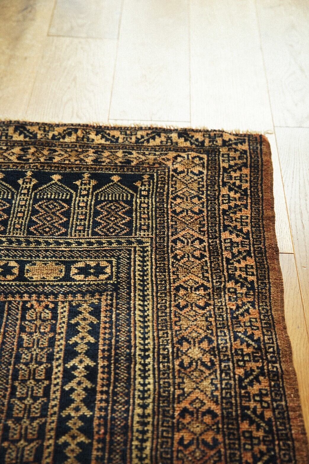 経年変化によって褪色したテラコッタ色のフィールドに、ブロケードと呼ばれるレースの様な細かい紋様がくっきり浮かび上がって見えとてもかっこいいです!黒く見える部分は光に当てて見ると深いネイビーです。少しパイル抜けしている部分はありますが、見た目にも使用にも問題はないレベルで、コンディションはとても良好。柔らかくて滑らかな手触りで気持ちいいです。とても美しいラグのため現地では壁掛けで飾られていたとのことです。一人掛けソファの前や玄関やキッチンに敷いたり、ベッドサイド、姿見の前にオススメの使いやすいサイズです。