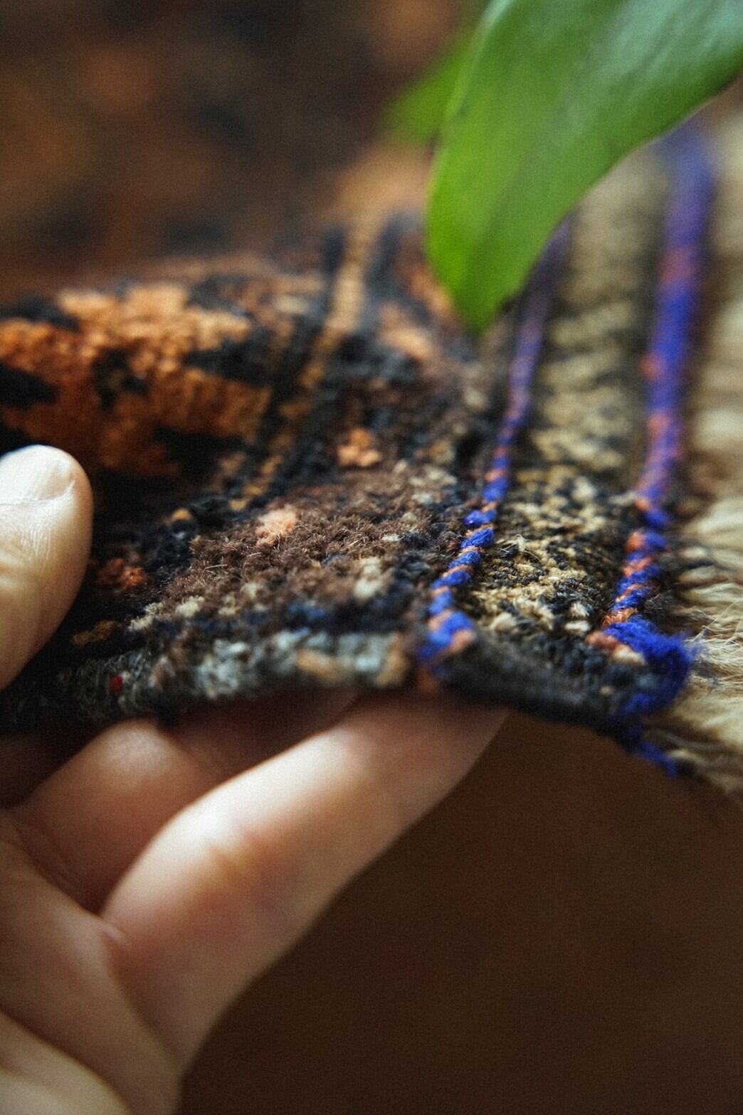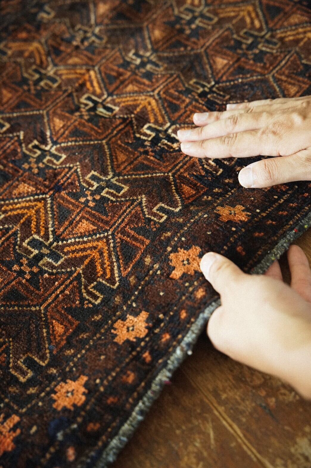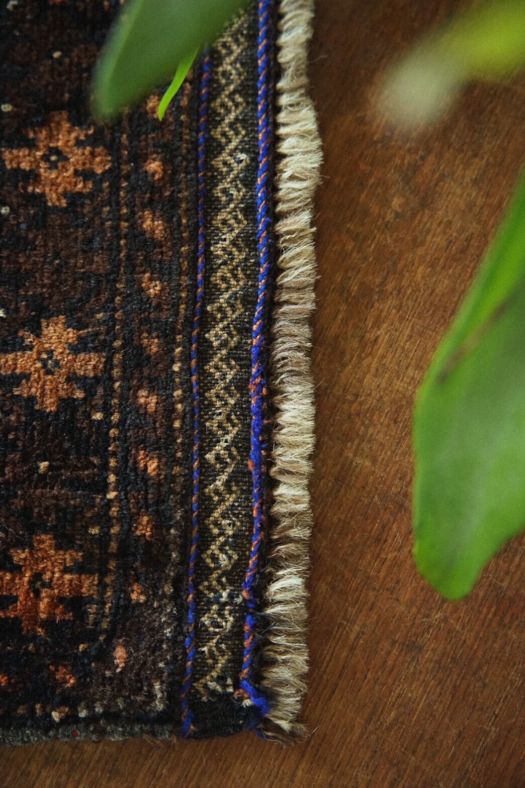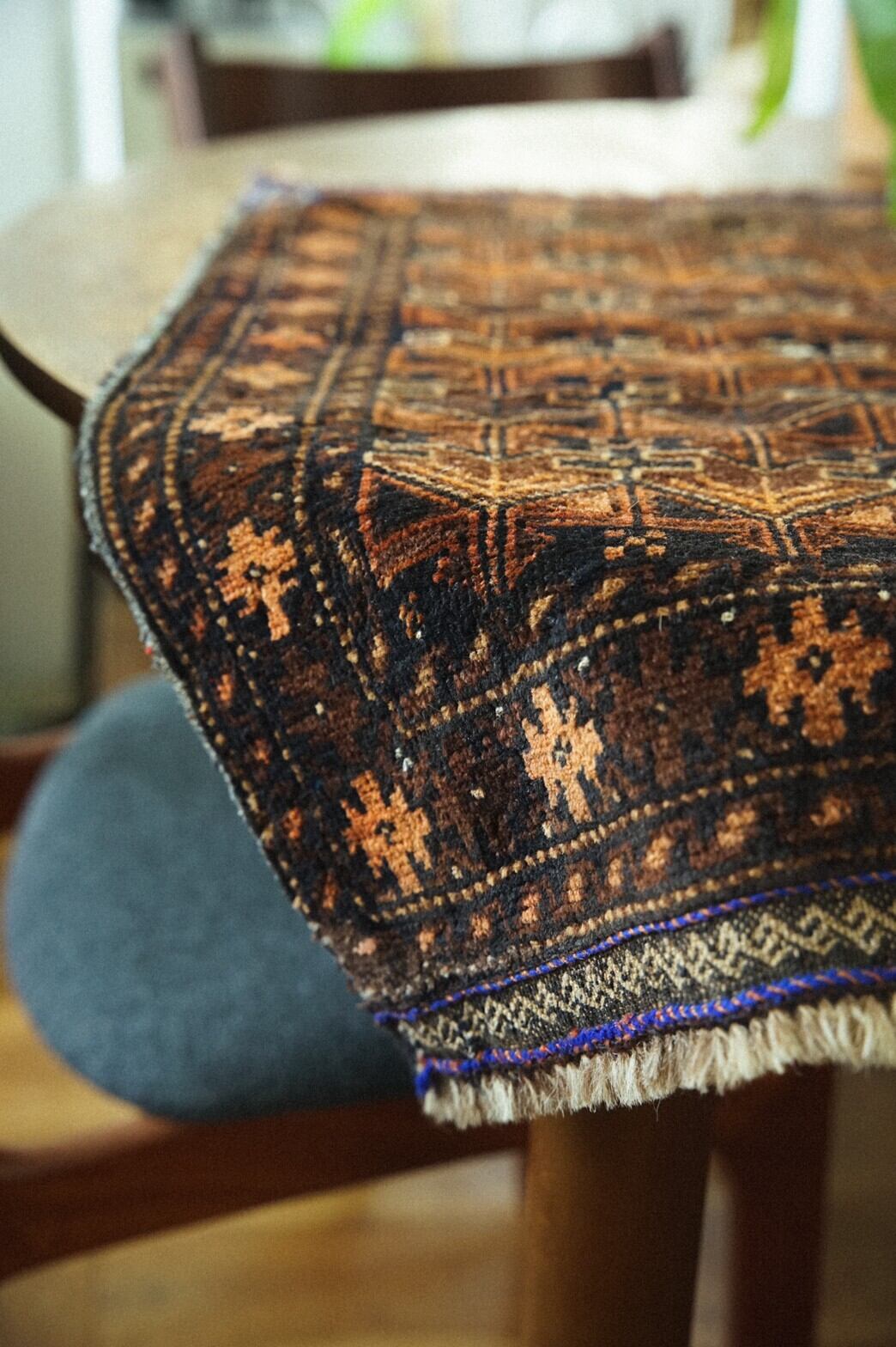 ブラウン×オレンジの落ち着いたトーンのバルーチラグ。フリンジ部分はパープルが効いたキリムエンドになっているのがとてもかっこいいです。少し薄手でしなやか。織りが細かくてすべすべと滑らかな手触りです。目立ったダメージは無いですが、2か所リペア跡(画像10枚目、11枚目参照)があります。とてもきれいにリペアされており、大事に受け継いでこられた形跡があります。窓辺や玄関、チェストの上、植物を置いたり姿見の前に敷いたりするのがおすすめです。