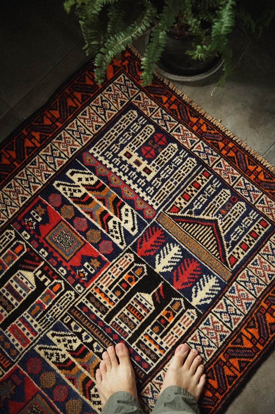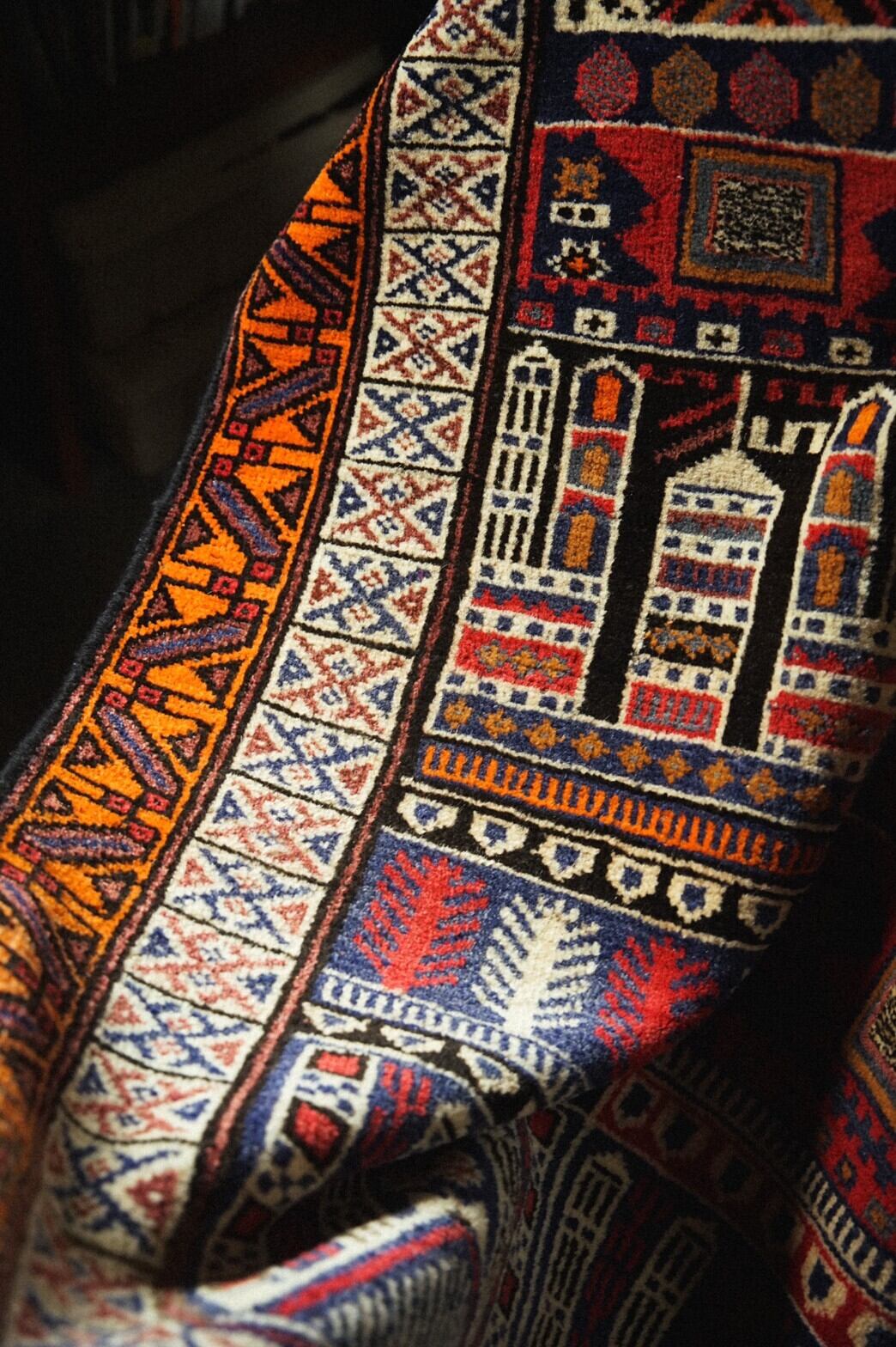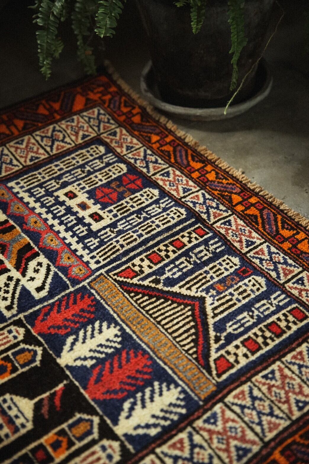 おおよそ50年前のバルーチ族のプレイヤーラグ。一目見たときからこの色合いとプレイヤーラグにしてはめずらしいデザインに心を奪われました!青、赤、白の組み合わせがとてもユニークでかわいらしく、そこにボーダー部分のオレンジがアクセントになっています。中にはミフラーブ紋様や生命の樹、八角星などが描かれています。目立ったダメージや補修跡もなくとても良いコンディションです。パイルは短めですが、丈夫な作りでキレイに残っています。部屋に敷くだけで明るい気持ちになれそうなラグ。かっこいい系のインテリアにもハマりそうです。玄関やキッチン、姿見の前やベッドサイドにおすすめのサイズ感です。