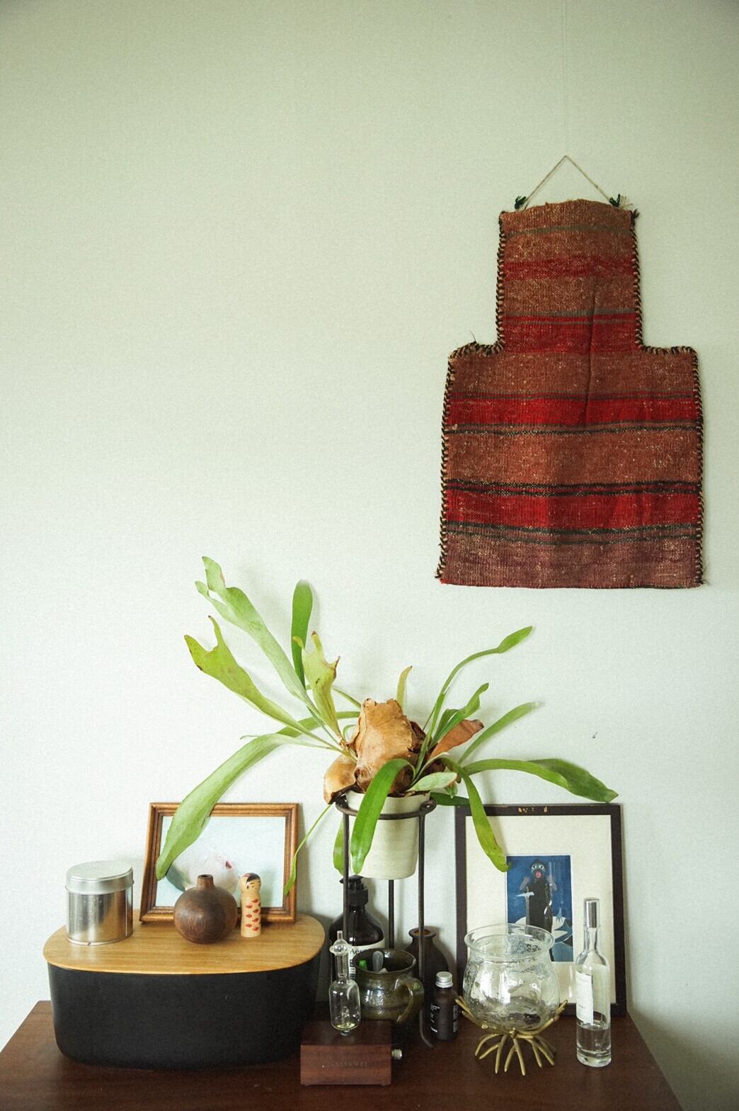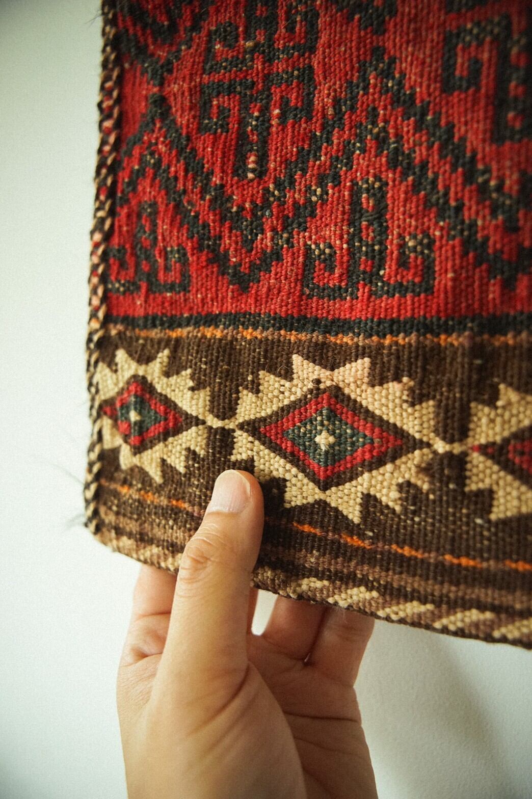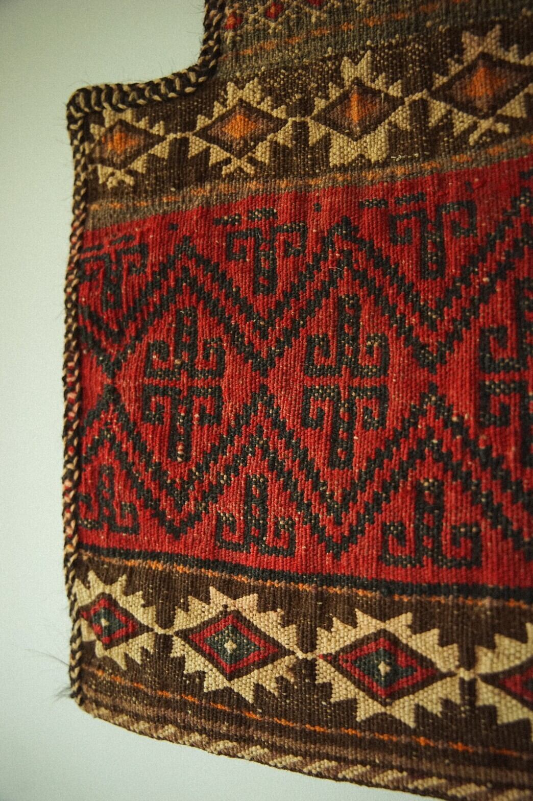 アフガニスタンのmaimana(マイマナ)産ソルトバッグ。裏表共にキリム織り。赤やアイボリー、ブラウン、オレンジなどの暖色系の落ち着いた色合いがとてもかっこいいです。特に大きなダメージはございません。遊牧民が塩を保存するために織った塩袋。生活のために作られた民芸品の一つではありますが、とても美しい織りとデザインは一つのアートとして楽しんでみてはいかがでしょうか?★こちらは紐がついているため壁掛け可能です。