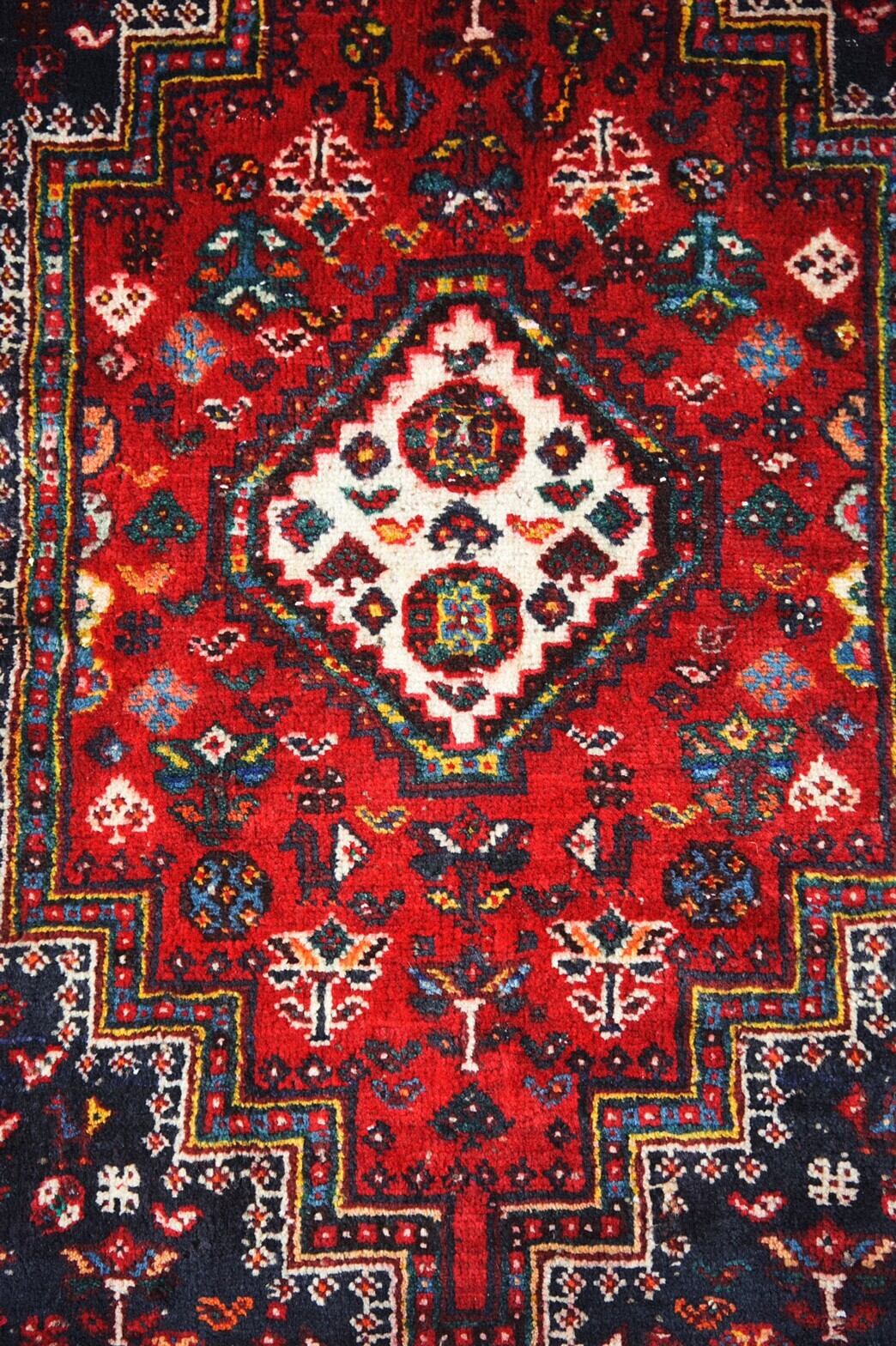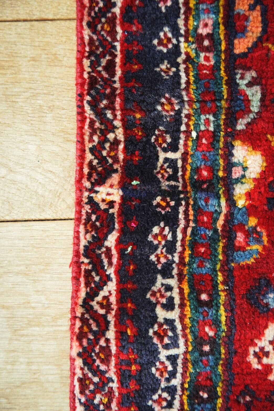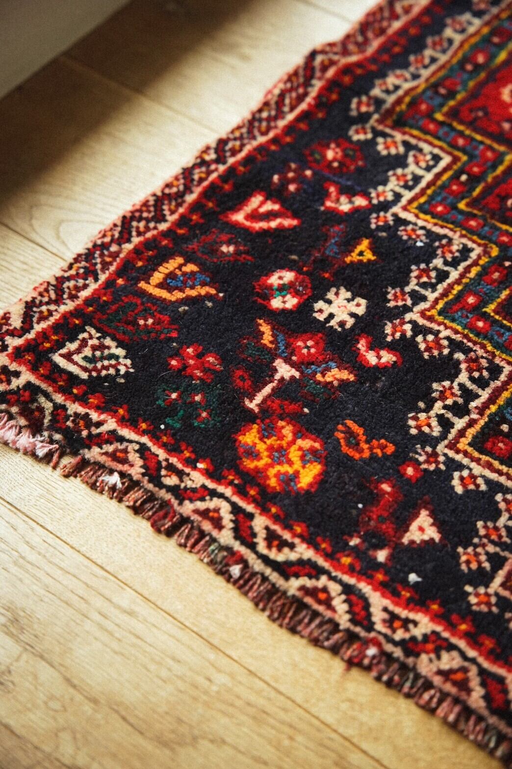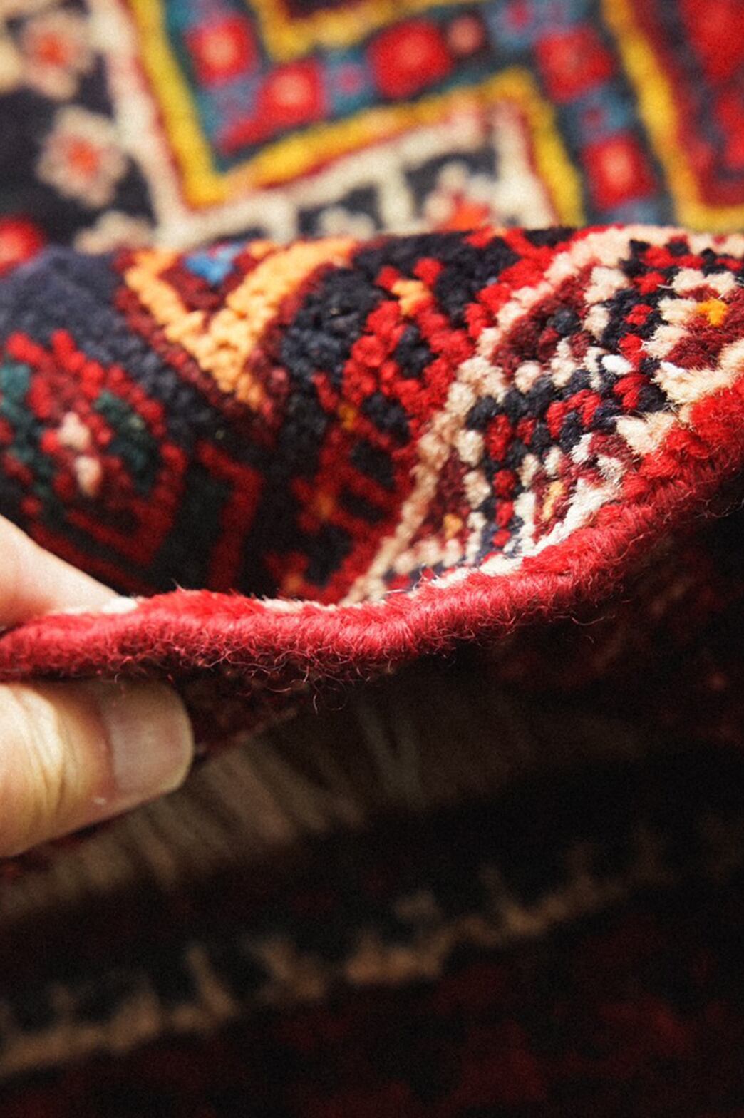 玄関マットサイズのカシュガイラグ。小さいサイズながらもデザインも色合いも華やかなラグ。一目見て「かわいい♡」となるので、ぜひ目に付く場所に敷いて眼福を味わってみてください。水色と黄色が使われているのでポップな雰囲気に。フィールドには大小さまざまな花、生命の樹、美しい羽を持つ鳥など自然賛美を表すカシュガイ伝統のモチーフがたくさん描かれています。パイルは長すぎず、素足で乗ると気持ちいいですよ。目立ったダメージは無いですが、補修跡はあり。きれいにリペアされており気にならないかと思います。窓辺や玄関、植物を置いたり姿見の前に敷いたりするのがおすすめです。