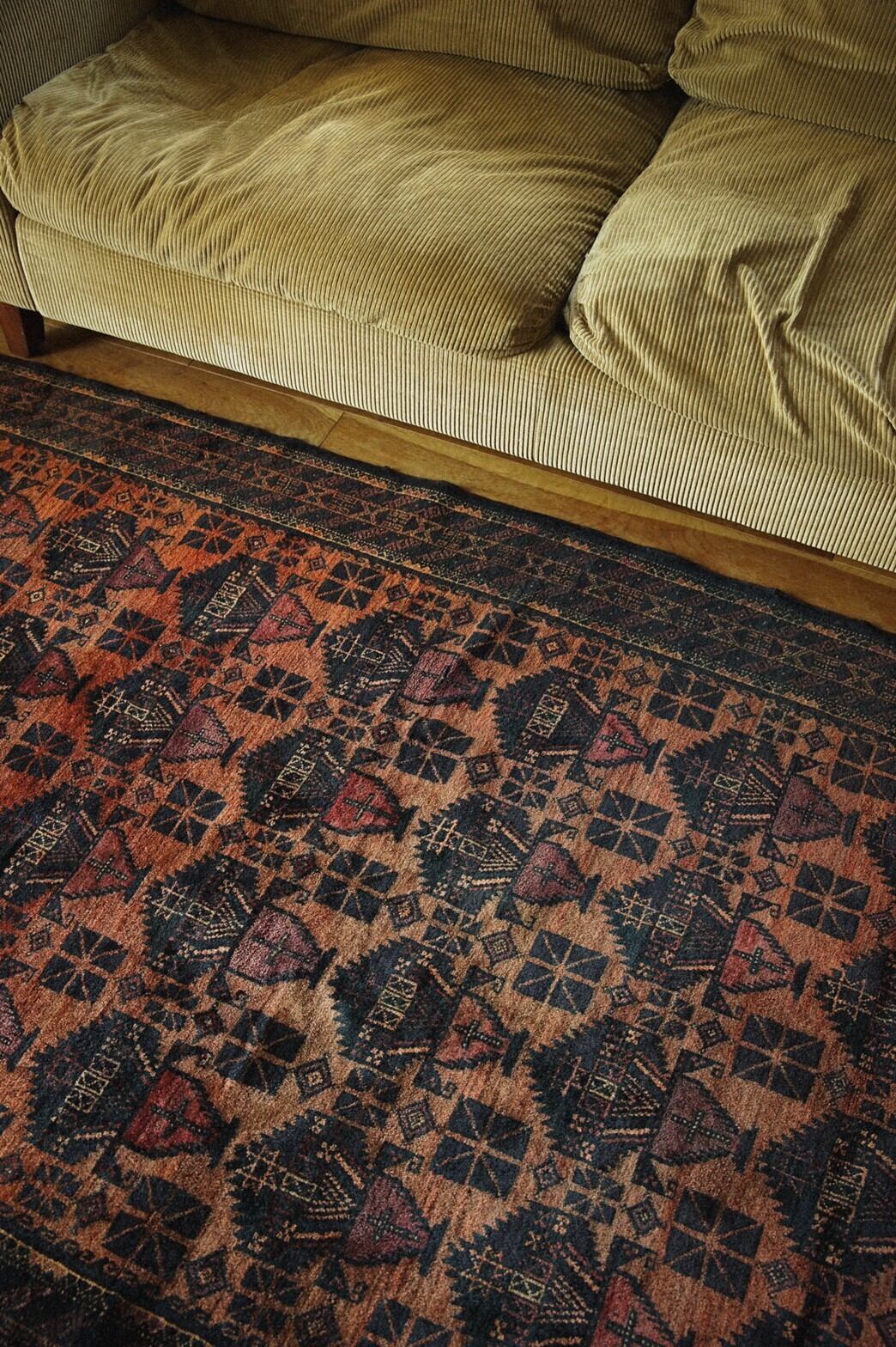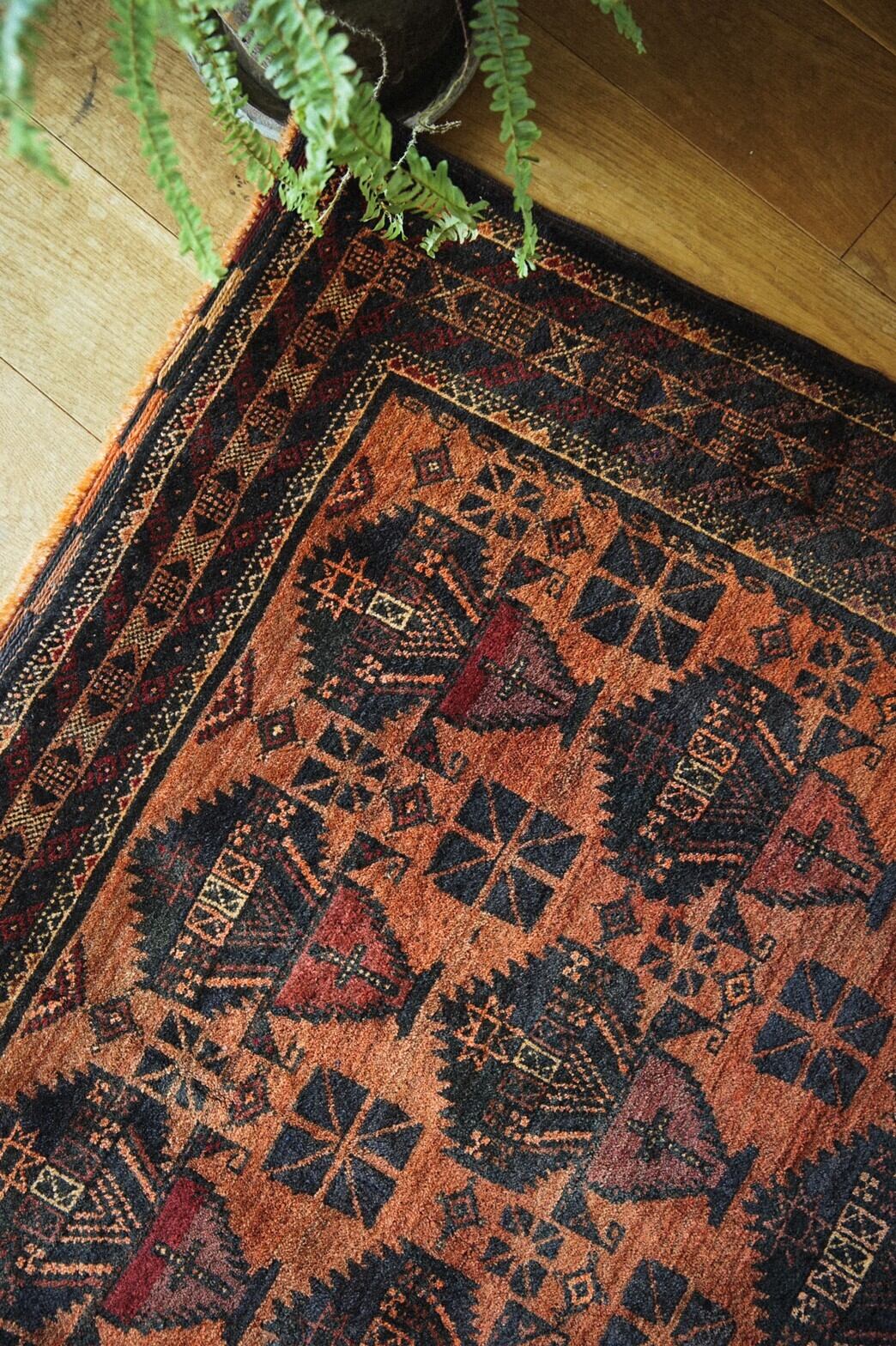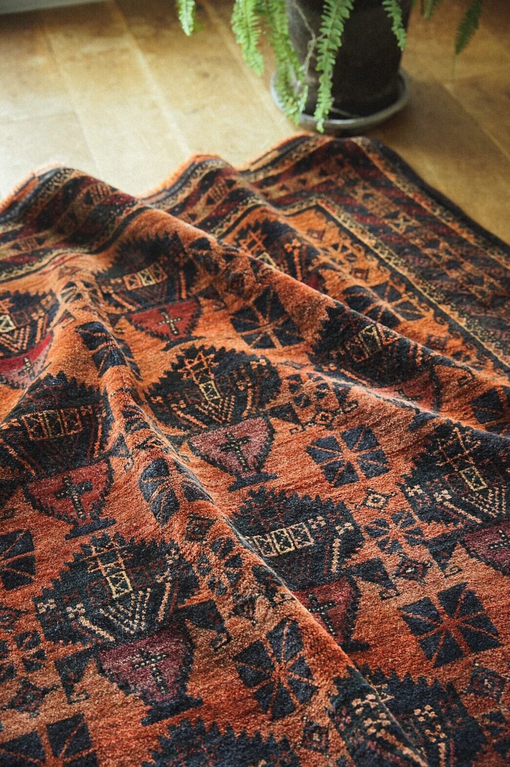 テラコッタのようなオレンジとブラウンの間くらいの絶妙な色合いがとてもかっこいいバルーチラグ。艶々と輝くきめ細かい織りは触り心地もすべすべと滑らかです。フィールド全体には壺なのでしょうか?ランプでしょうか?幾何学的にモチーフが並びます。しっかりとした肉厚で重量感のある織りのため、床に敷いてもずれにくいかと思います。パイルもとてもきれいに残っておりとても状態の良いラグです。ただ、一箇所フリンジ部分にダメージ(画像10枚目参照)があります。縫い合わせられているので使用に問題はないかと思いますがペットがいる方は慎重にご検討ください。リビングやダイニングテーブルの下、書斎に敷いたり、ベッドサイド、姿見の前にオススメの使いやすいサイズです。