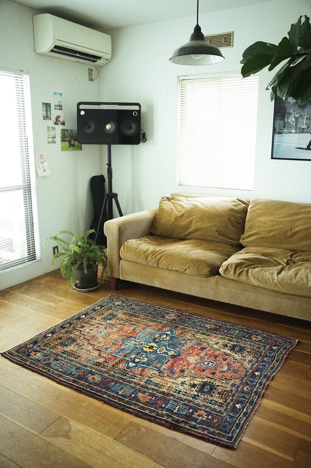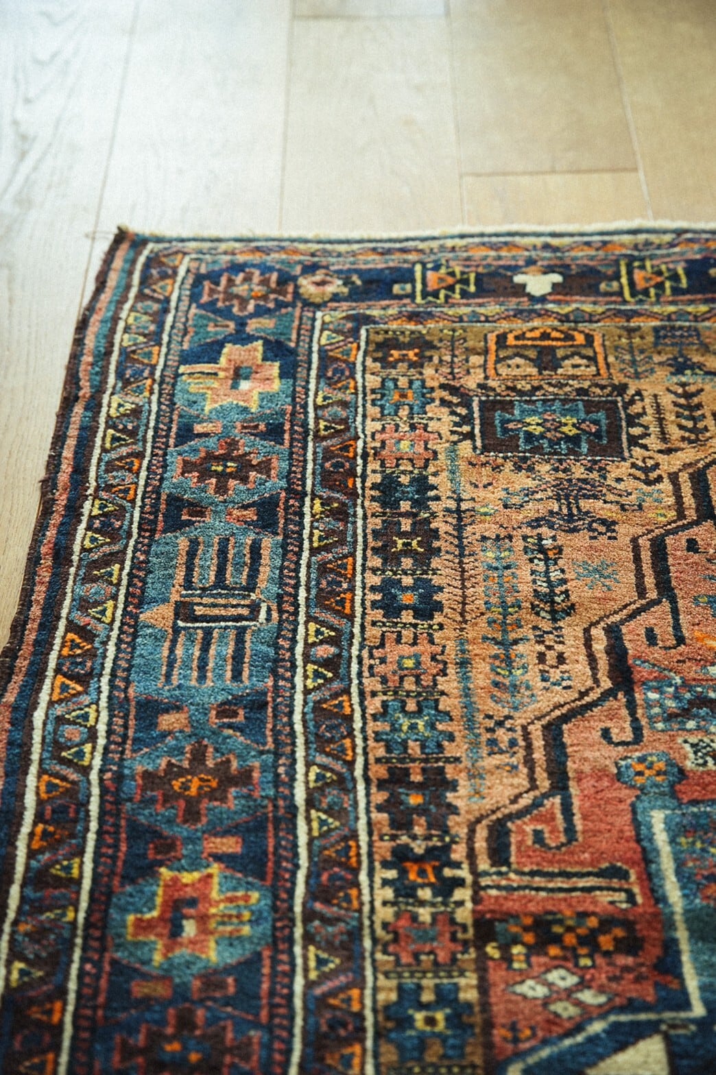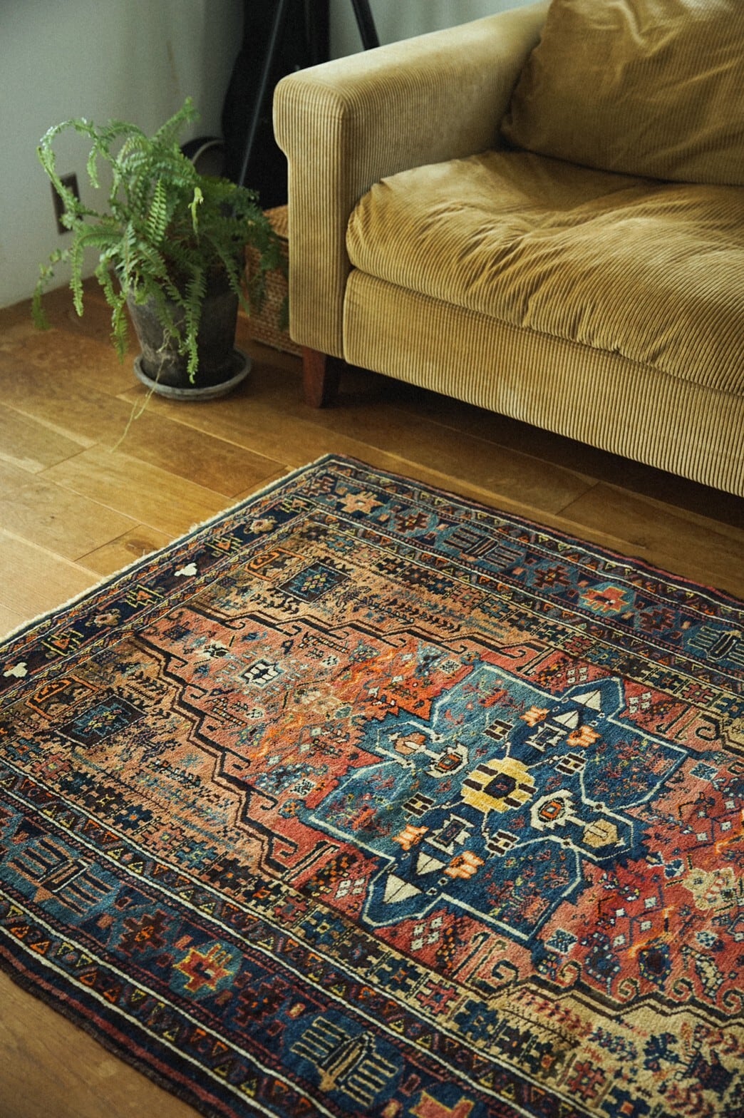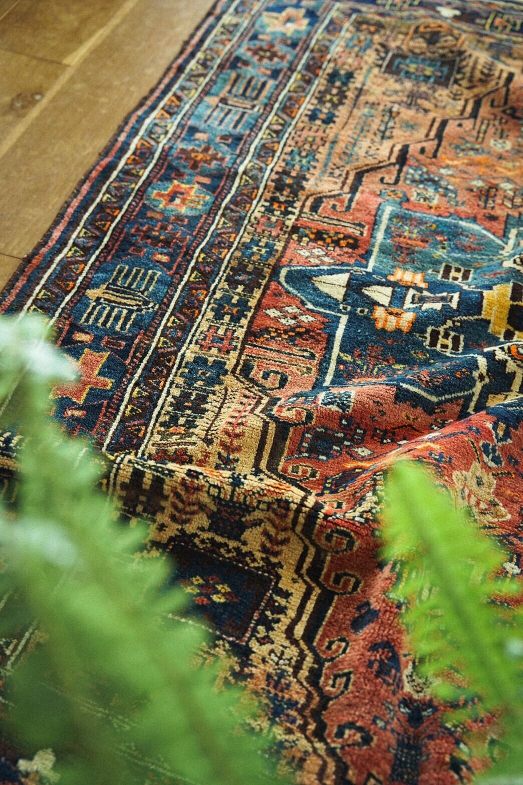 80年もの時を経てとてもいい色合いに褪色したアフシャルラグ。茜色~オレンジのグラデーションと真ん中のメダリオンのブルーがとても美しいです。フィールドには生命の樹や、魔除けモチーフ、ボテ、ランプなどたくさんの紋様が並びます。ボーダー部分のデザインも凝っており見ていて飽きないラグなんです。特に目立ったダメージはありません。パイルは短めでサラッとしていながらもきめ細かい織りなのでずっと撫でていたくなるような柔らかな手触り。アンティークと呼ばれるまであと少し。自分でラグを育てる楽しみもありますね♪ソファの前や玄関やキッチンに敷いたり、ベッドサイド、姿見の前にオススメのサイズです。