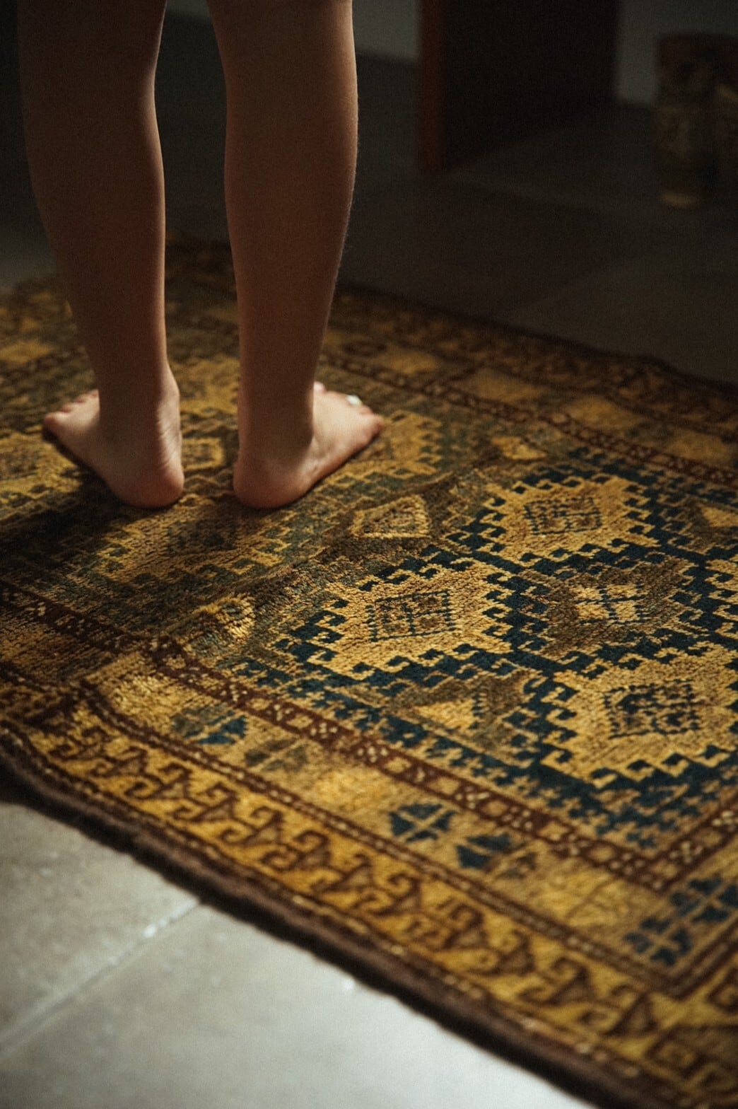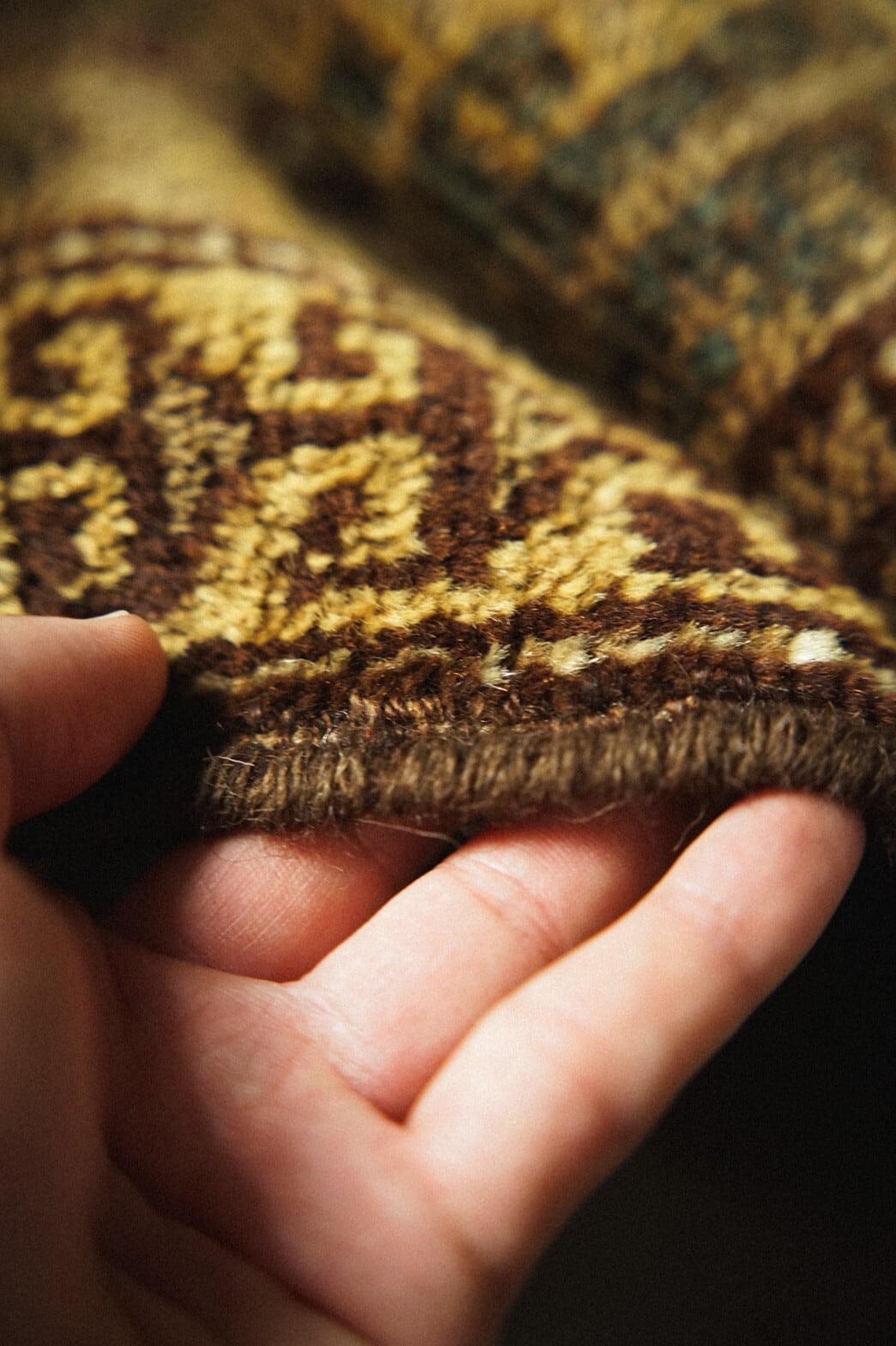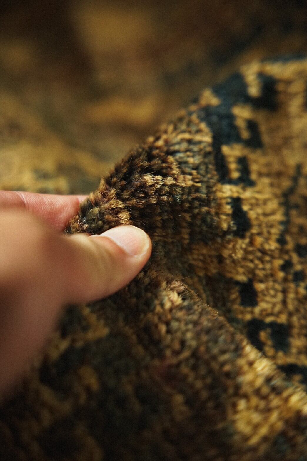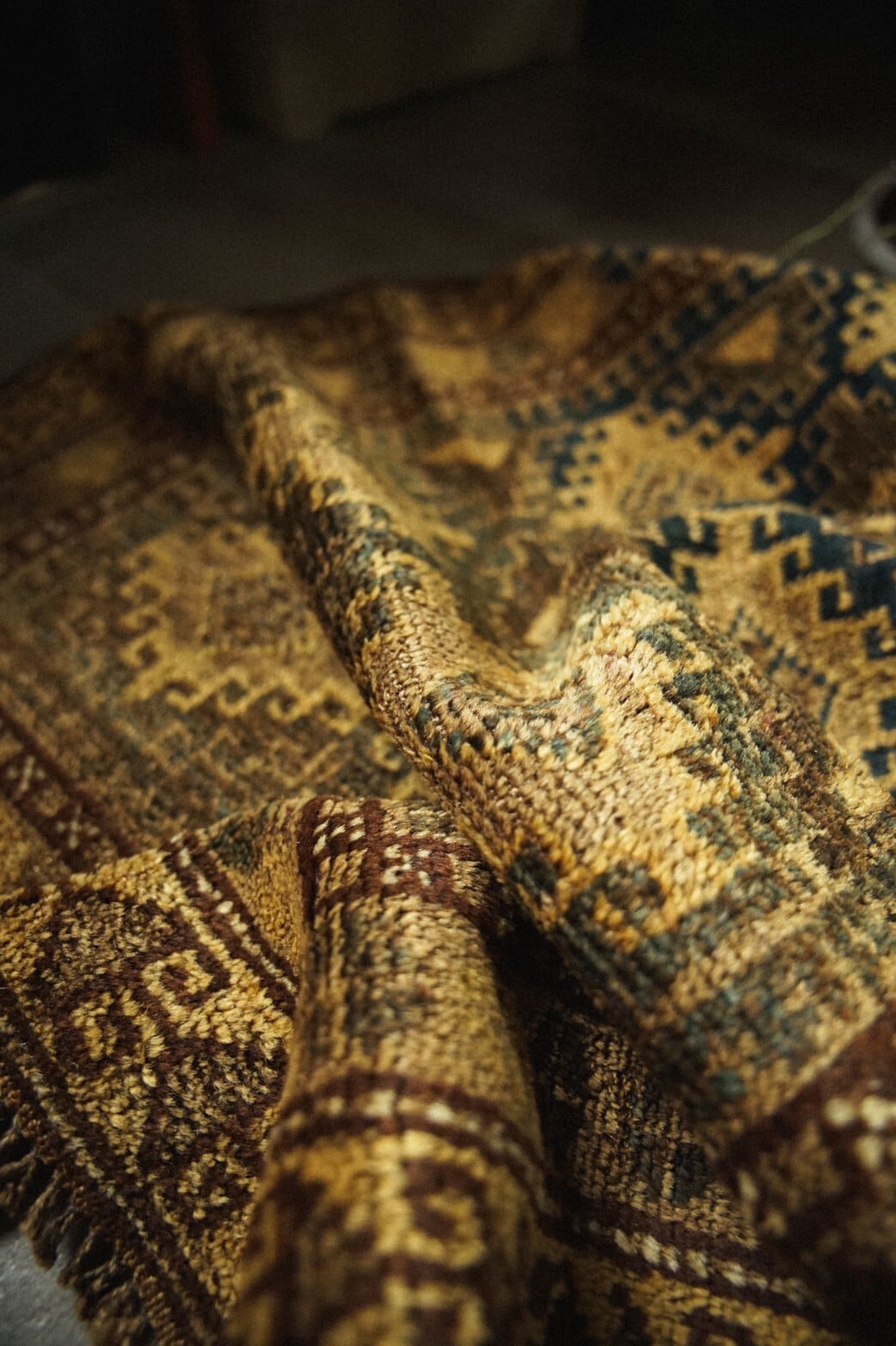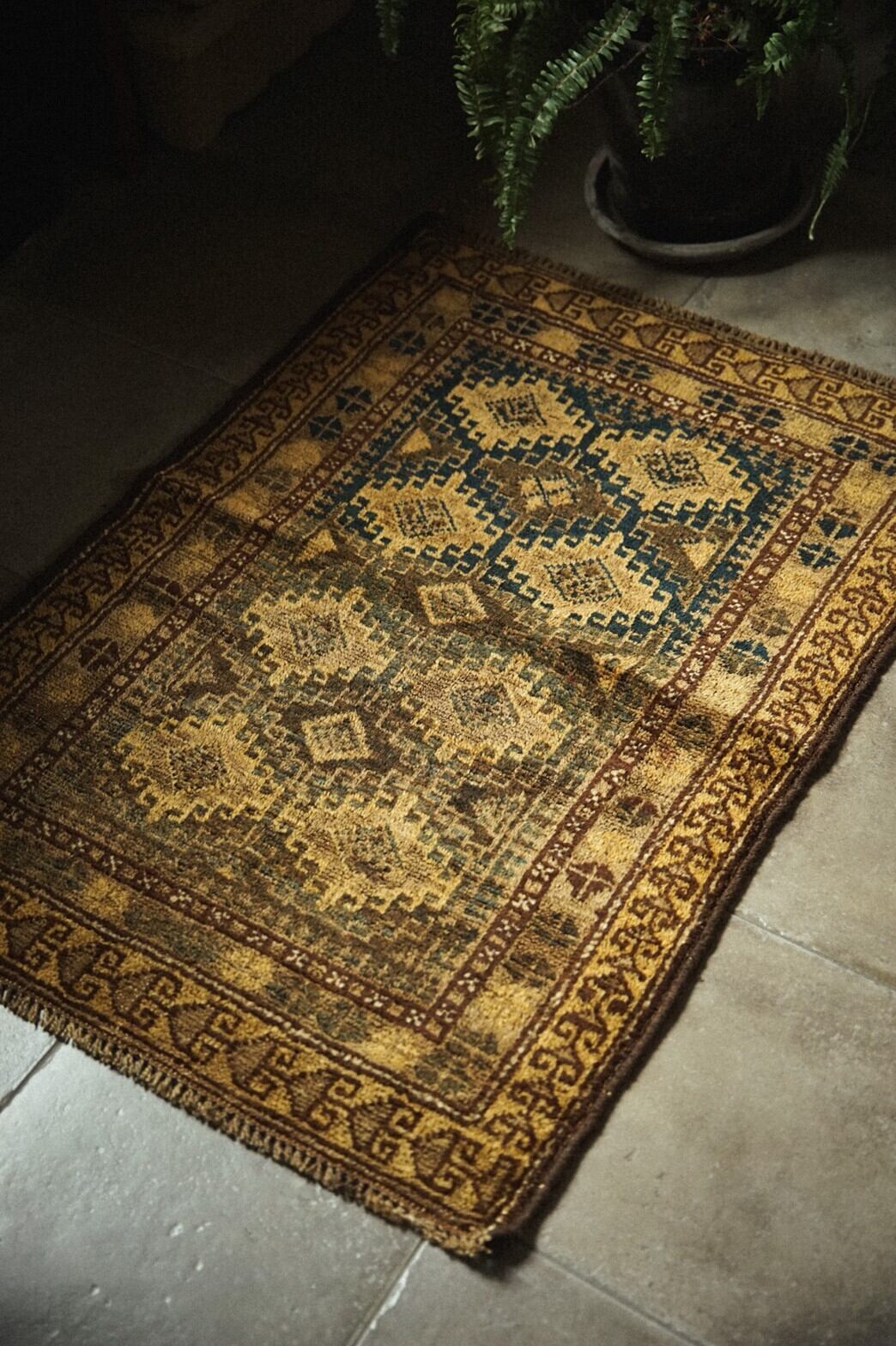 渋い色合いがとてもかっこいいタイマニラグ。このラグの一番の魅力は何といっても素晴らしい艶感のあるパイル。たくさん踏まれたことにより生まれた艶は自然光の中でもキラキラと輝きを増し続けます。また、アブラッシュと呼ばれる染めムラによるグラデーションもとても美しく、見る角度によって色や表情が変わる見ていて飽きないラグです。目立ったダメージは無し。全体的に経年変化によるパイルの減りはありますが、とても柔らかく肌触りも気持ち良いです。玄関やキッチン、姿見の前やベッドサイドにもおすすめのサイズ感です。