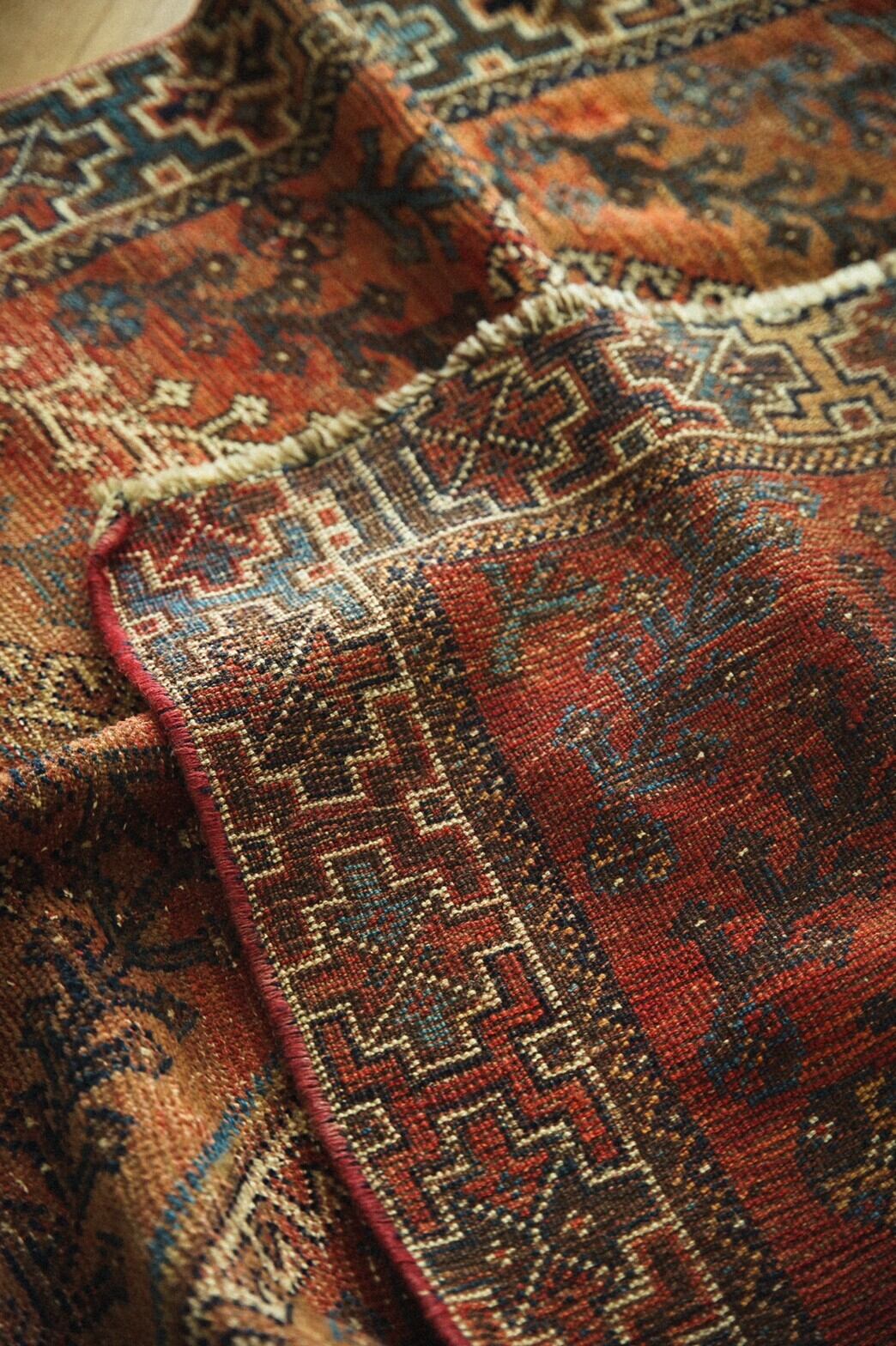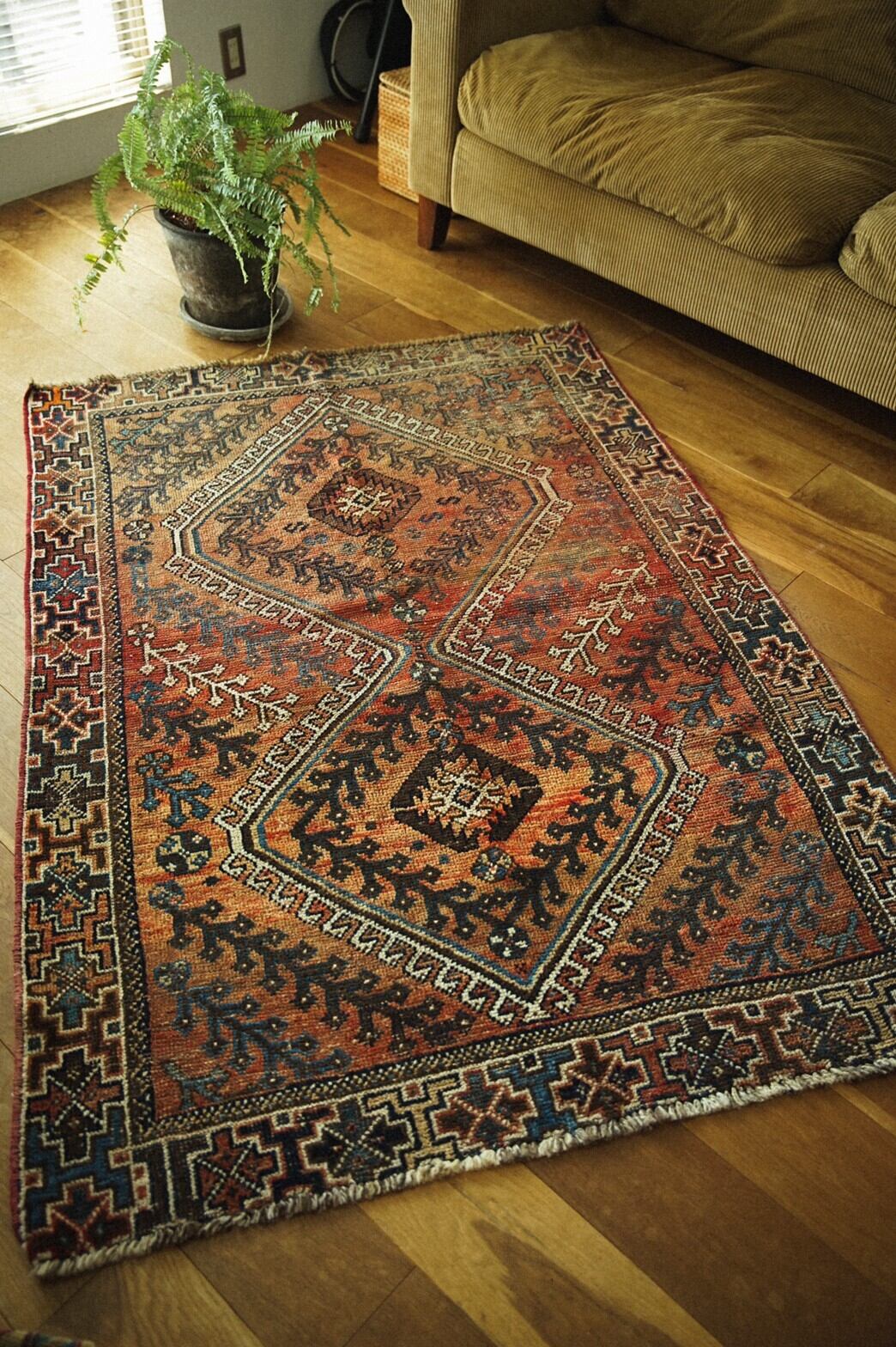 褪色したオレンジのグラデーションと擦れたヴィンテージの風合いがとてもかっこいいカシュガイラグ。ボーダー部分のネイビーとブラウンの組み合わせや、フィールドのモチーフも少し荒々しささえ感じる男前系のラグ。古着屋さんやセレクトショップにありそうなお洒落な雰囲気はヴィンテージ好きな方に是非。パイルは短めでサラッとしており、季節問わず使用可能です。二人掛けソファの前やリビング、姿見の前、書斎などに敷くのにおすすめのサイズ感です。