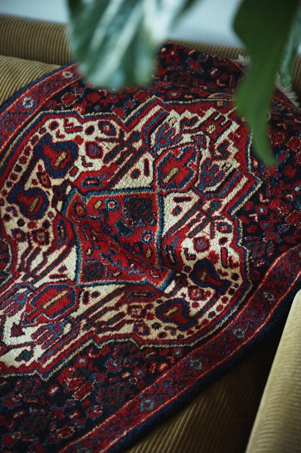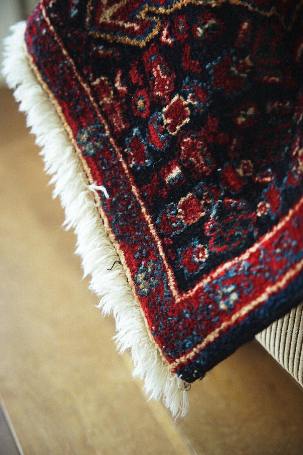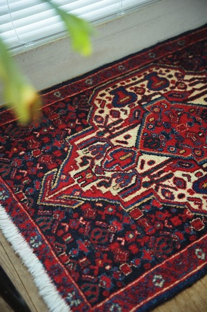 玄関マットサイズのセネラグ。赤と深いミッドナイトブルーが基調の落ち着いた雰囲気。ダメージや補修跡もなく、しっとりとした滑らかな感触は素足で乗るととても気持ち良いです。ボーダー部分のブルーで縁取られた小花紋様もかわいいですね♪パイルも綺麗でコンディション良好。程よい厚みもあります。玄関やキッチンに、また姿見の前や植物と一緒に窓辺に敷いてみてはいかがでしょうか?