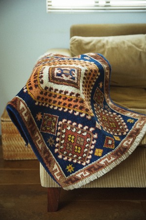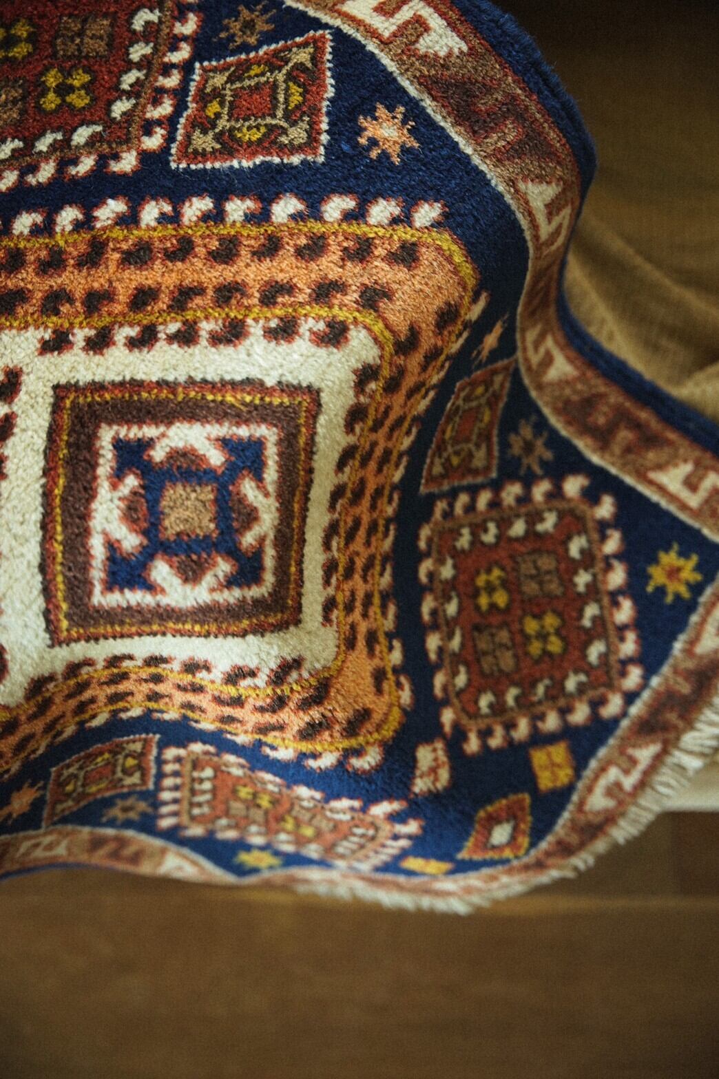 深いネイビーにブラウン、アイボリー、オレンジなどの暖色系の組み合わせがとてもかっこいい雰囲気のシラーズ産のラグ。ダメージや補修跡もないグッドコンディション。程よい厚みがあり、フカフカ感がありながらもサラッとした肌触りは素足で乗ると気持ちいいですよ♪玄関やキッチンに、また姿見の前や植物と一緒に窓辺に敷いてみてはいかがでしょうか?シンプルインテリアや、オールドアメリカンな雰囲気、無骨な雰囲気、コンクリート壁などのクール系インテリアにもハマりそうです。